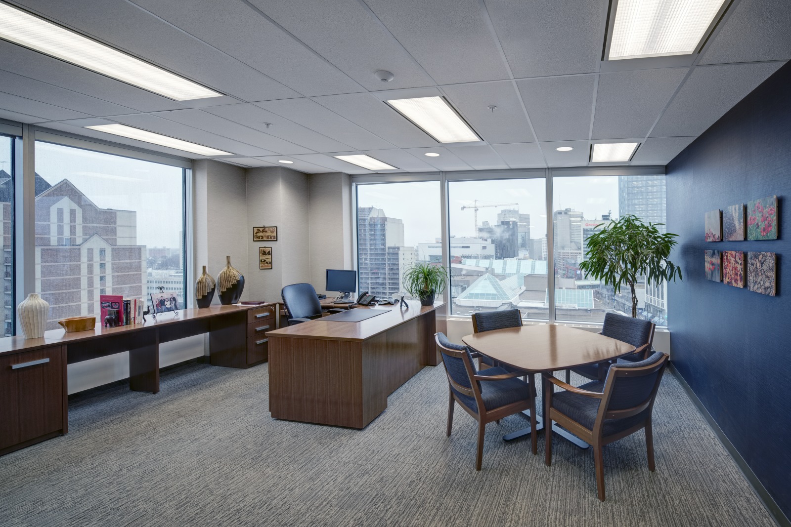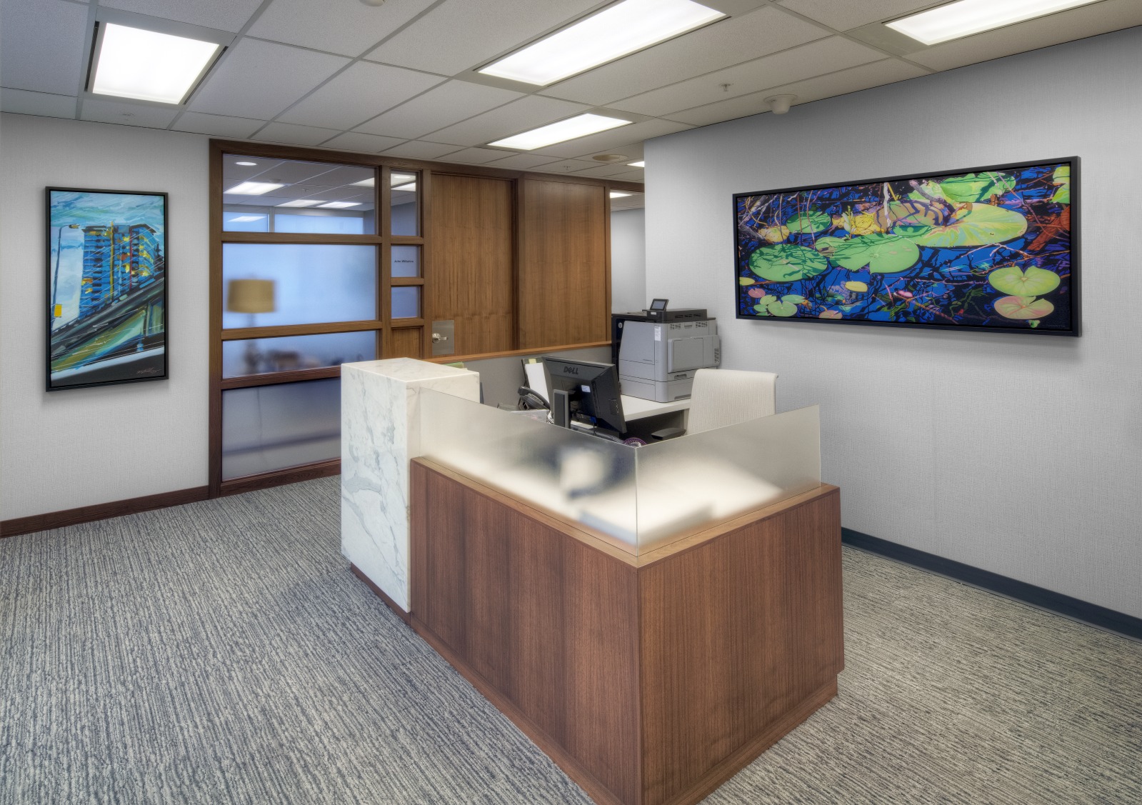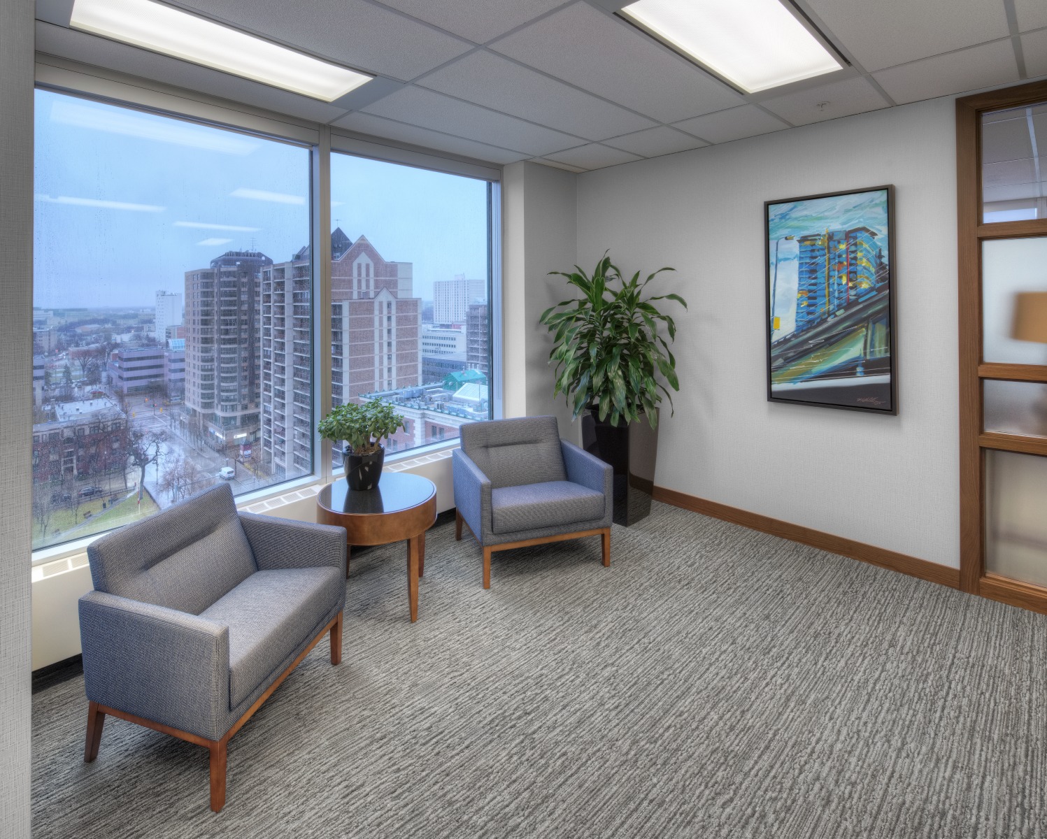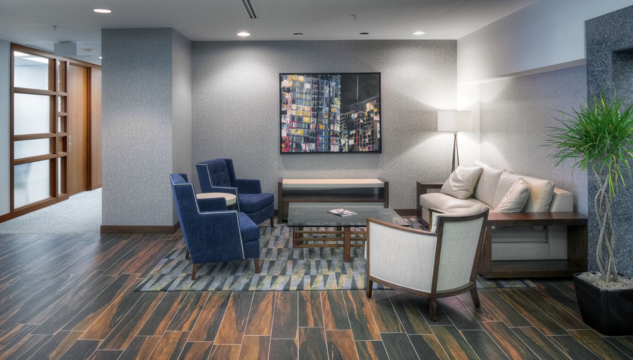 Financial Rebranding: A long-time client, one of Canada’s largest financial planning firms, developed a division for consultants with high-net-worth clients. With a list of concept words, they looked to us to design a corporate office tailored to the needs of this market. A boutique hotel look was achieved with a collection of luxurious furniture and accessories; and lavish finishes including natural Calacatta marble and rift-cut walnut. A wool-silk rug anchors the lounge area, with a leather sofa and velvet chairs. Both meeting rooms are outfitted with the latest technology without sacrificing comfort. The curated selection of local art adds color and interest to the space. The result is a highly functional corporate office with sophisticated comfort.
