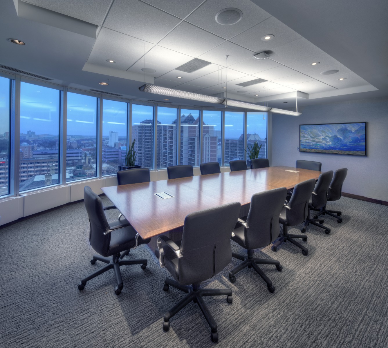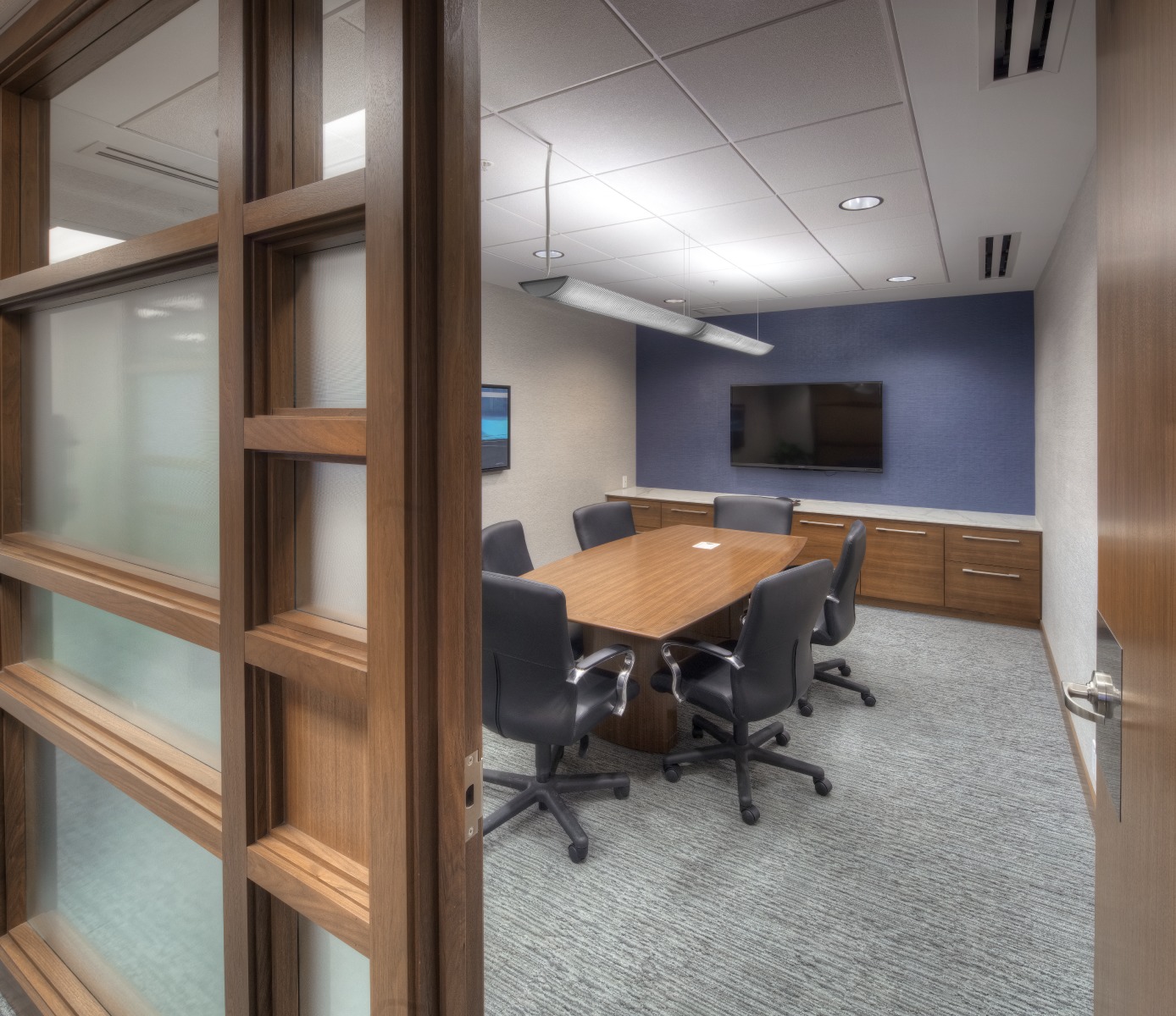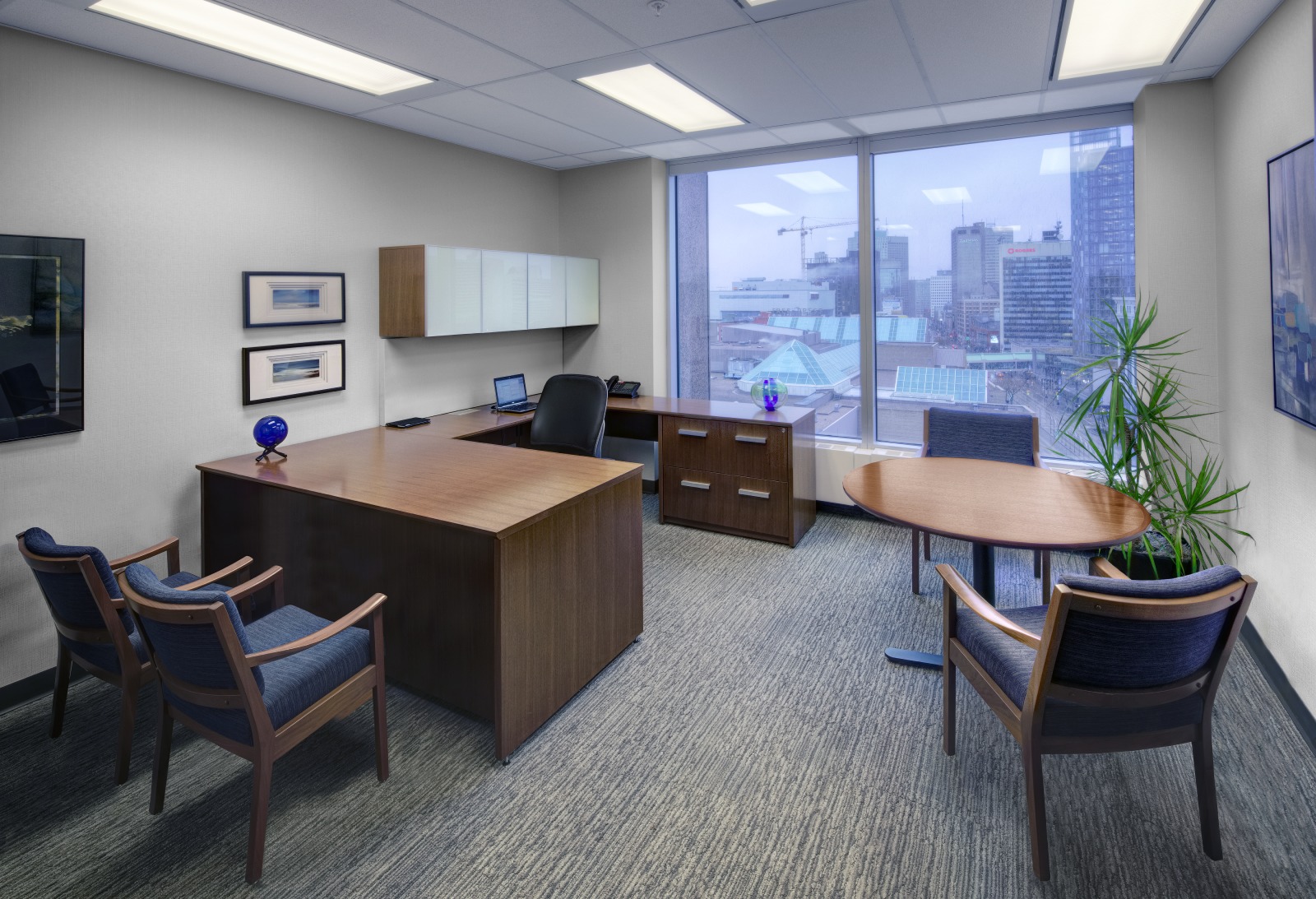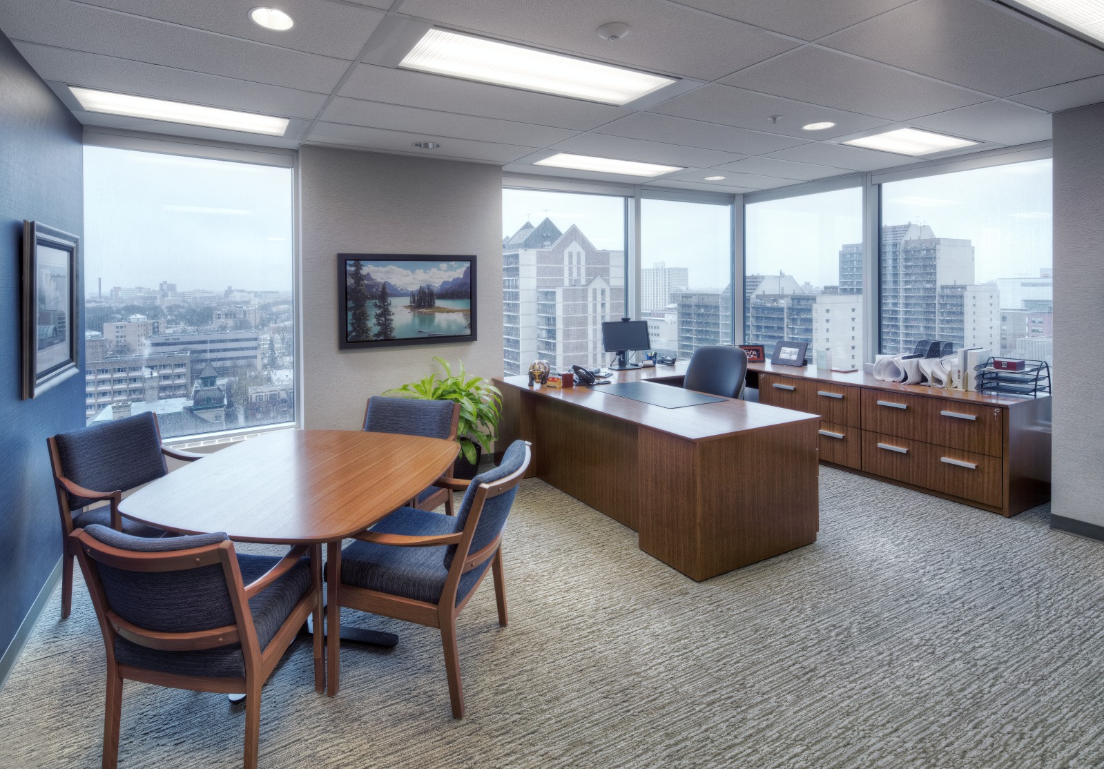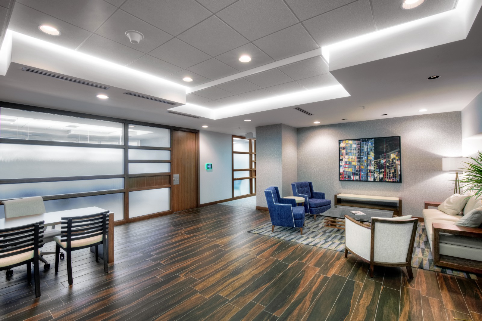Financial Rebranding: A long-time client, one of Canada’s largest financial planning firms, developed a division for consultants with high-net-worth clients. With a list of concept words, they looked to us to design a corporate office tailored to the needs of this market. A boutique hotel look was achieved with a collection of luxurious furniture and accessories; and lavish finishes including natural Calacatta marble and rift-cut walnut. A wool-silk rug anchors the lounge area, with a leather sofa and velvet chairs. Both meeting rooms are outfitted with the latest technology without sacrificing comfort. The curated selection of local art adds color and interest to the space. The result is a highly functional corporate office with sophisticated comfort.
