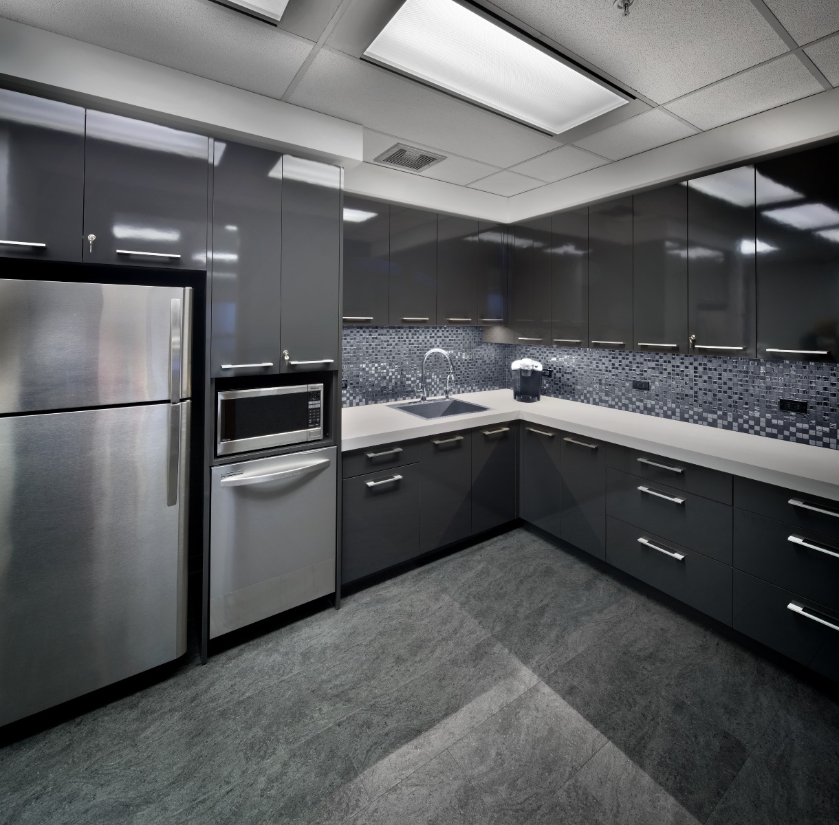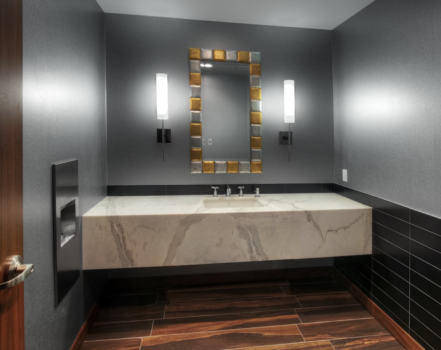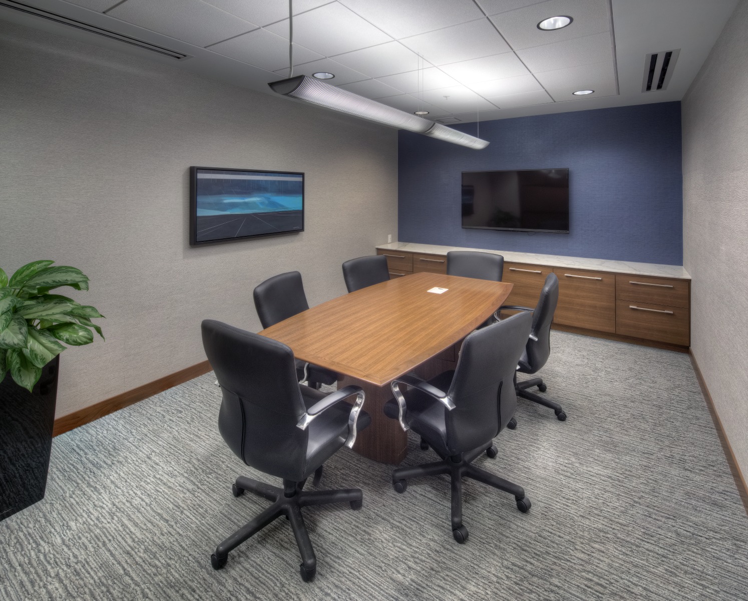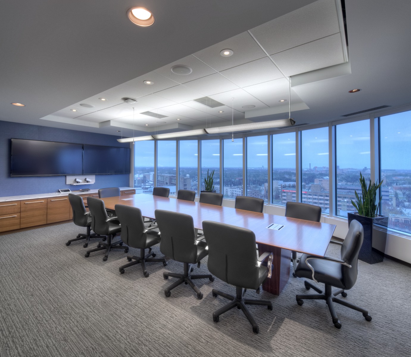 Financial Rebranding: A long-time client, one of Canada’s largest financial planning firms, developed a division for consultants with high-net-worth clients. With a list of concept words, they looked to us to design a corporate office tailored to the needs of this market. A boutique hotel look was achieved with a collection of luxurious furniture and accessories; and lavish finishes including natural Calacatta marble and rift-cut walnut. A wool-silk rug anchors the lounge area, with a leather sofa and velvet chairs. Both meeting rooms are outfitted with the latest technology without sacrificing comfort. The curated selection of local art adds color and interest to the space. The result is a highly functional corporate office with sophisticated comfort.