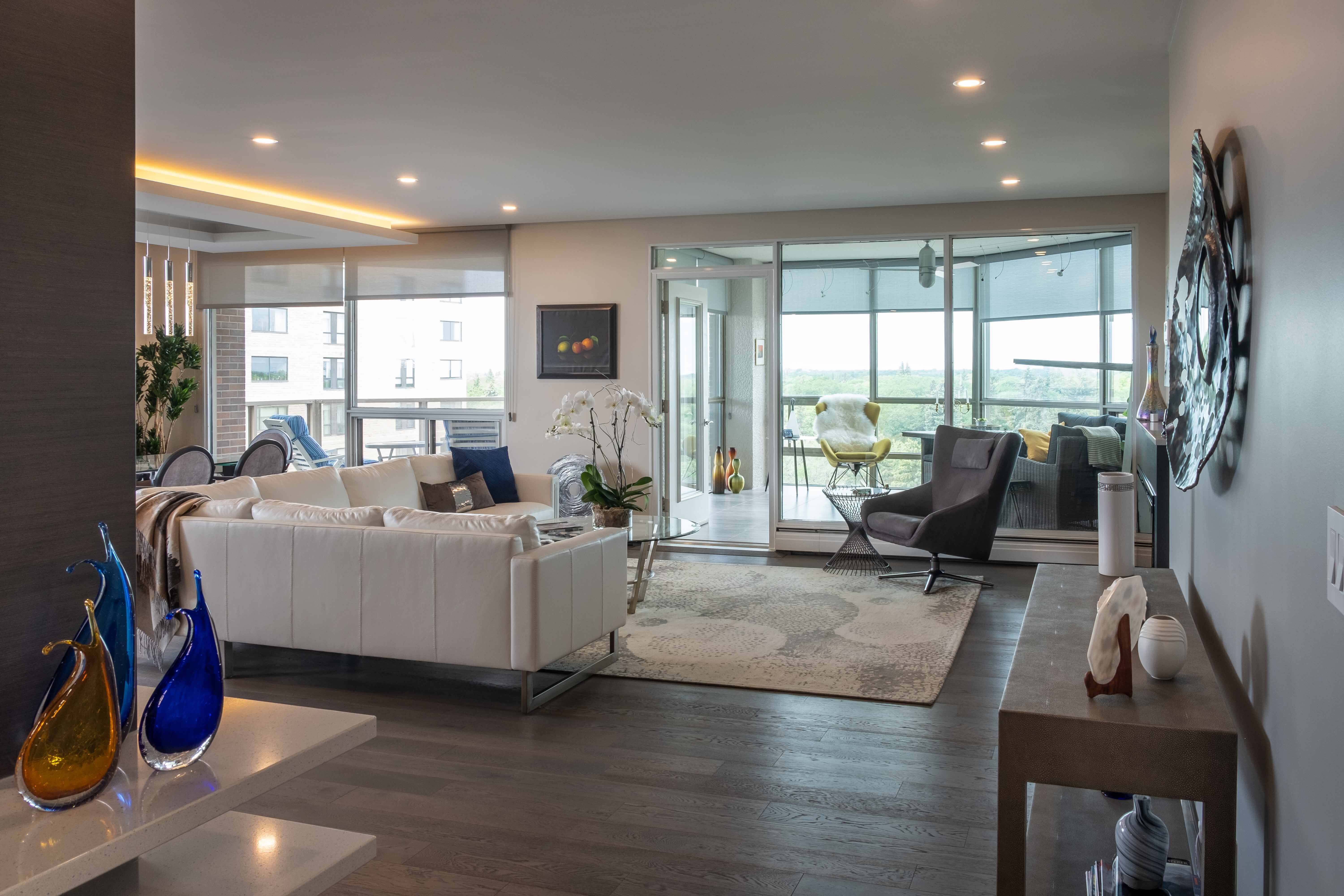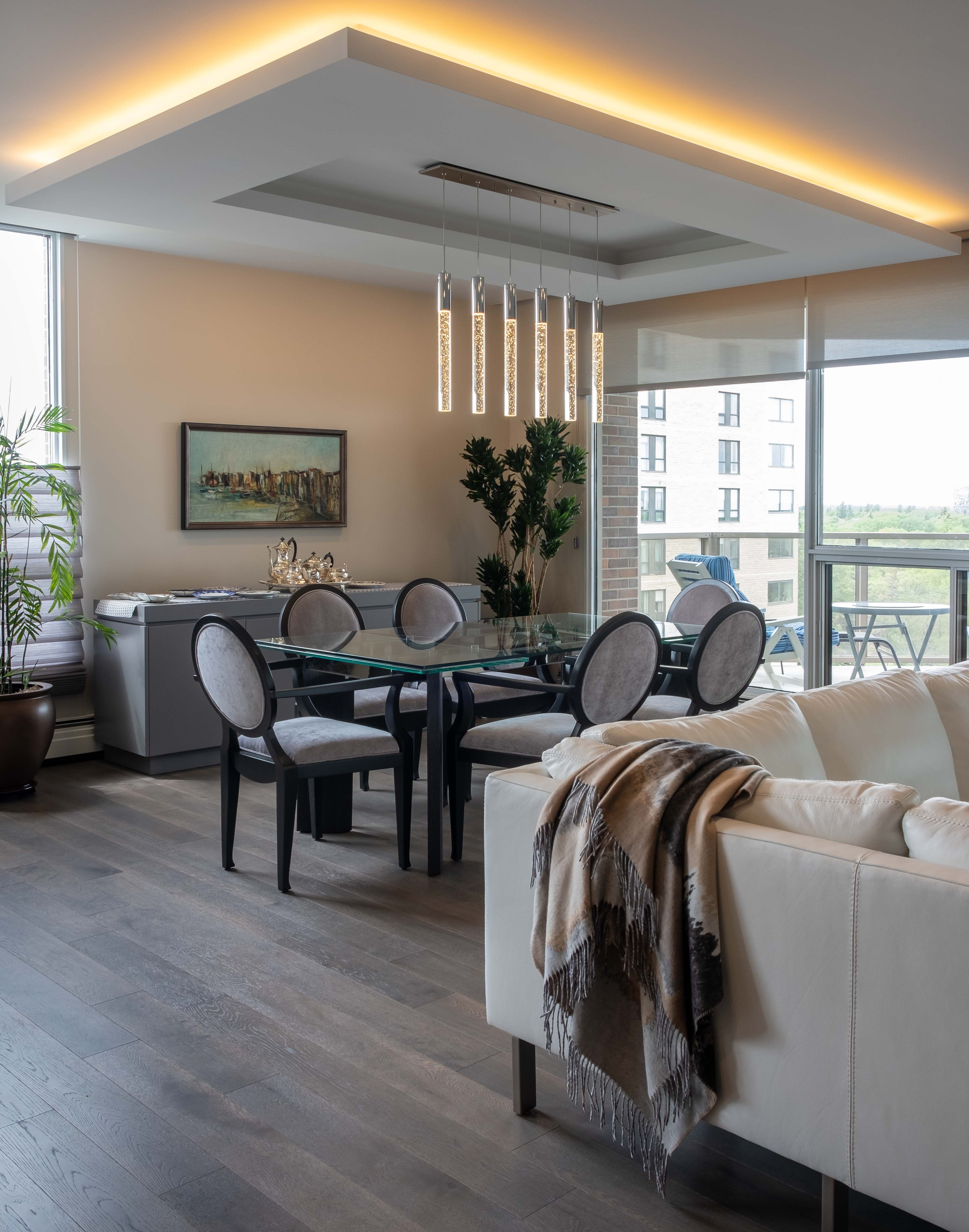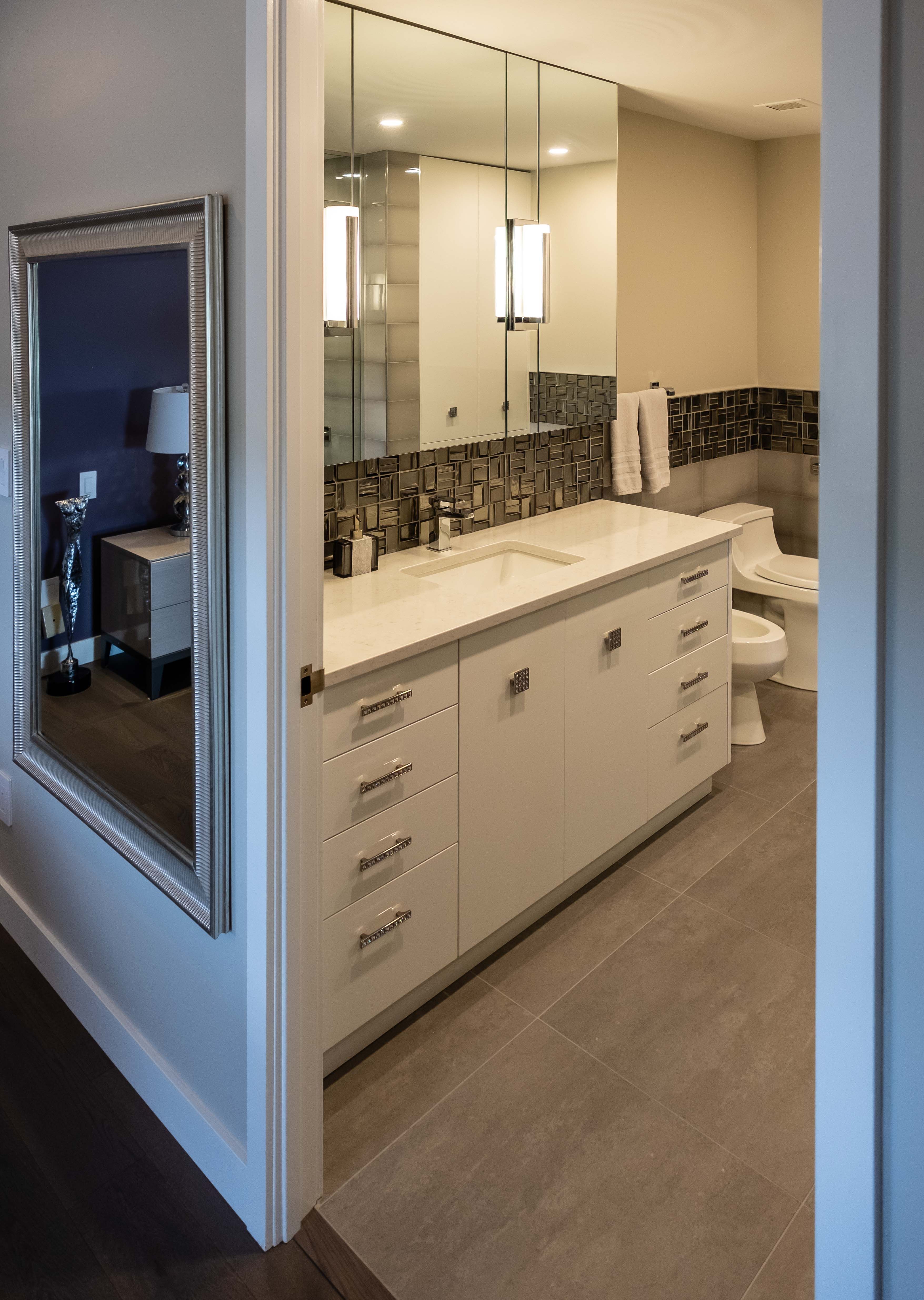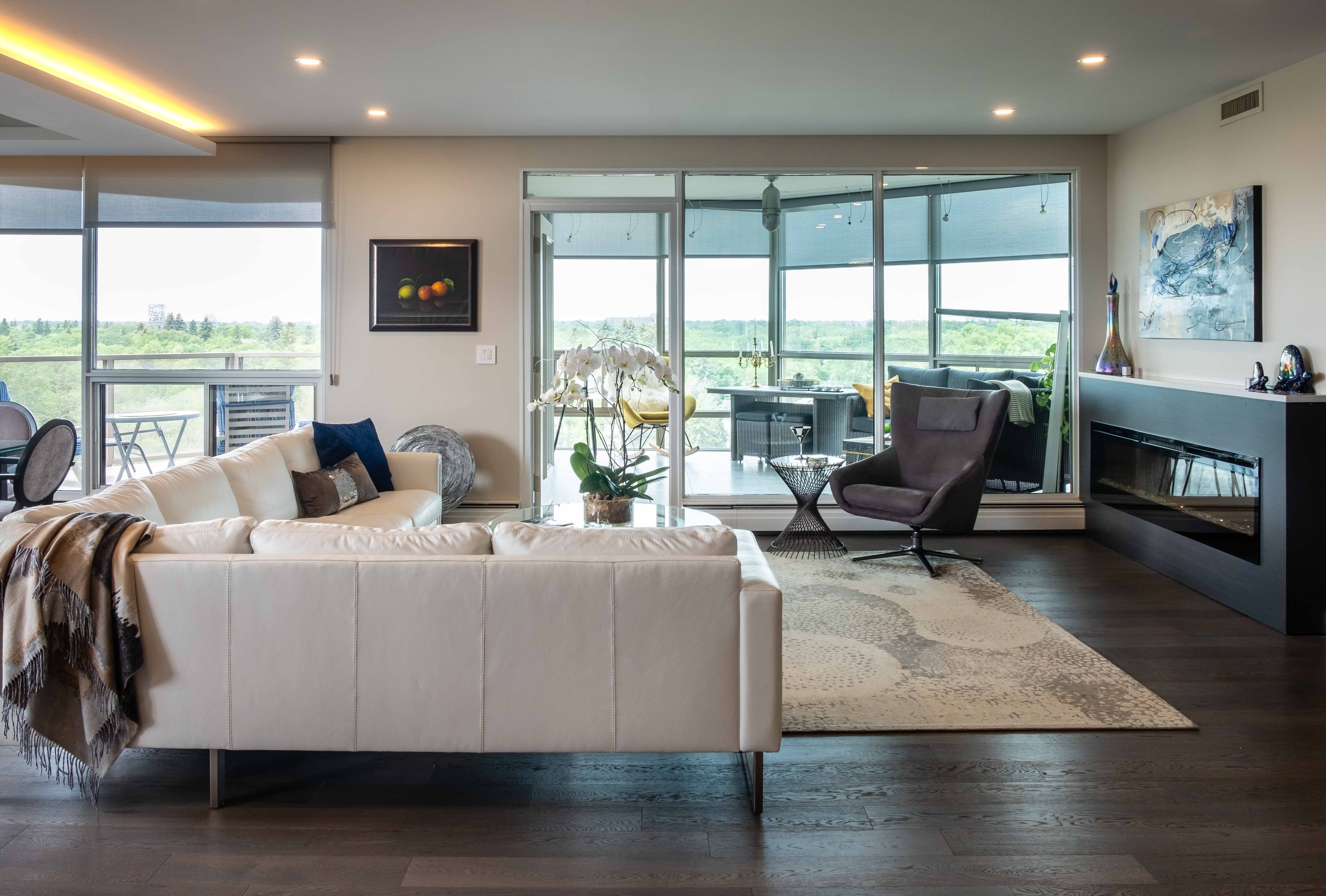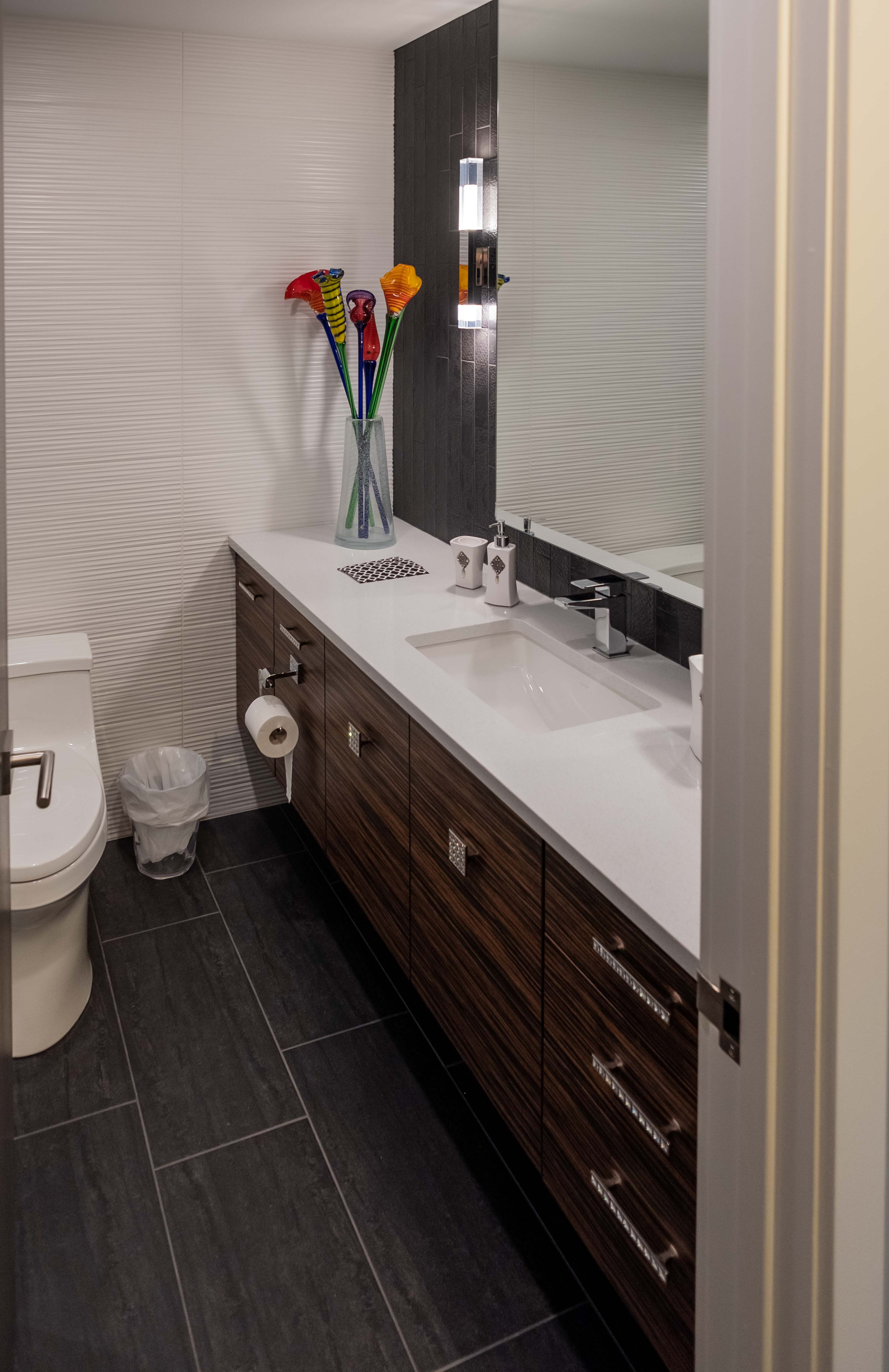 Our client secured a large suite in a much sought-after building. It was dark, dated and dismal. We removed a diagonal wall that had defined a den area (but blocked the view), opened the kitchen, and flipped the location of the dining room and den. This created a better flow between the spaces, put dinner party guests next to windows and provided panoramic treetop views to the south and west. The hall to the bedrooms was widened to further the feeling of spaciousness and to provide better accessibility. Eliminating a jetted tub allowed for a huge glass-screened shower with no door and no shower curb. “Designer grab bars” look pretty, not institutional, while still offering security and safety. Faceted glass tiles in silver are elegant and timeless. The floor tiles are large format and slip resistant; they continue uninterrupted into the shower. In the guest bath, a tiny shower enclosure was replaced with an open shower area defined by a glass screen and minimal threshold. An Ebony Macassar vanity with Swarovski pulls was designed for a glamorous touch. Wide plank matte-finish grey-tone oak hardwood flooring unites most of the space, with heated porcelain tile in the sunroom, guest bath, laundry room and en suite. The large entertaining space is light and bright and the dining area is defined by cove lighting and a modern linear pendant. The living area is warmed by a horizontal fireplace and wired for a TV above. But our client has decided to watch TV in the cozy den with built-in desk, storage and display shelves. The guest bedroom is cozy and the sofa in the den transforms into a bed. This condo has already hosted many overnight family visits, tea, cocktail and dinner parties.