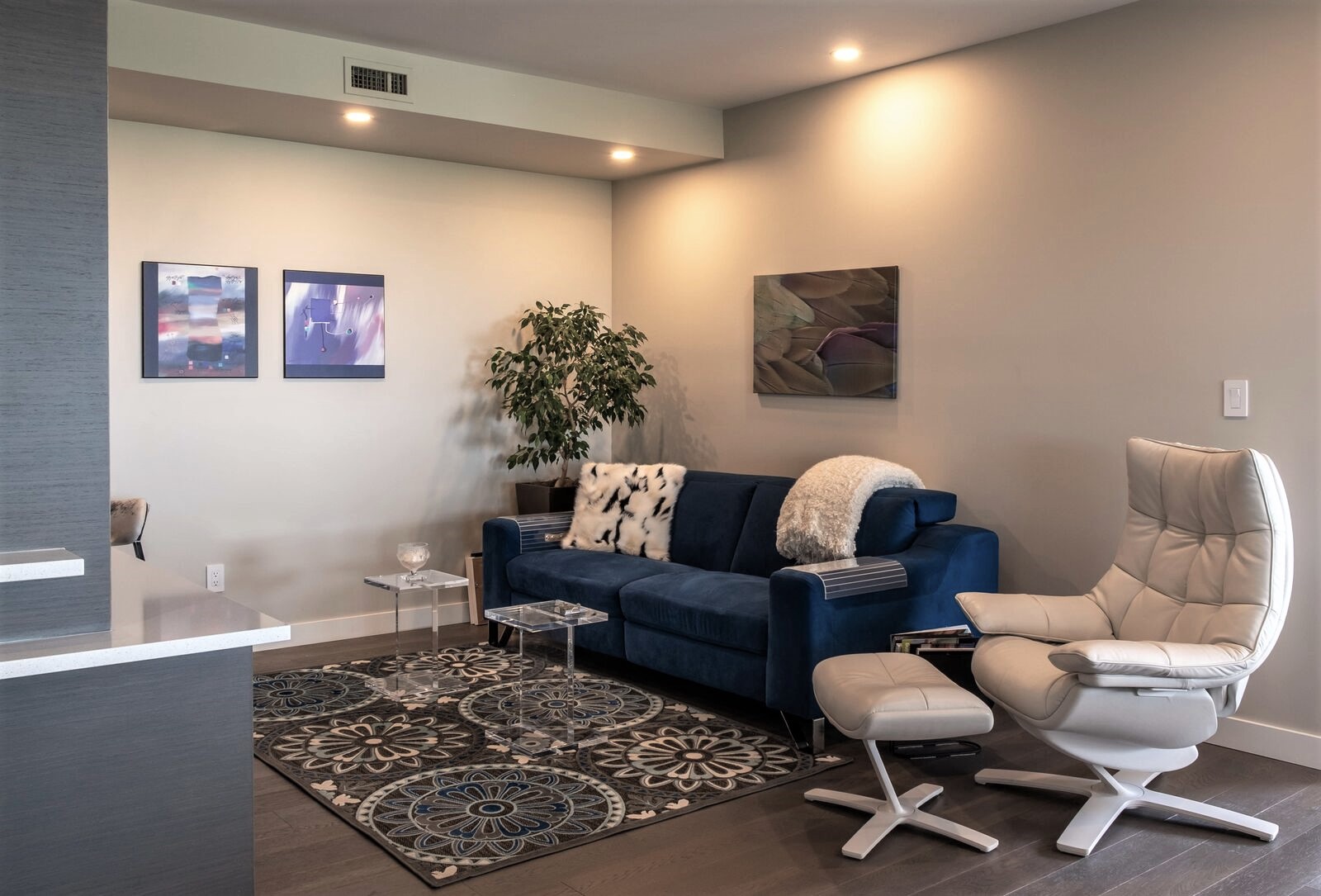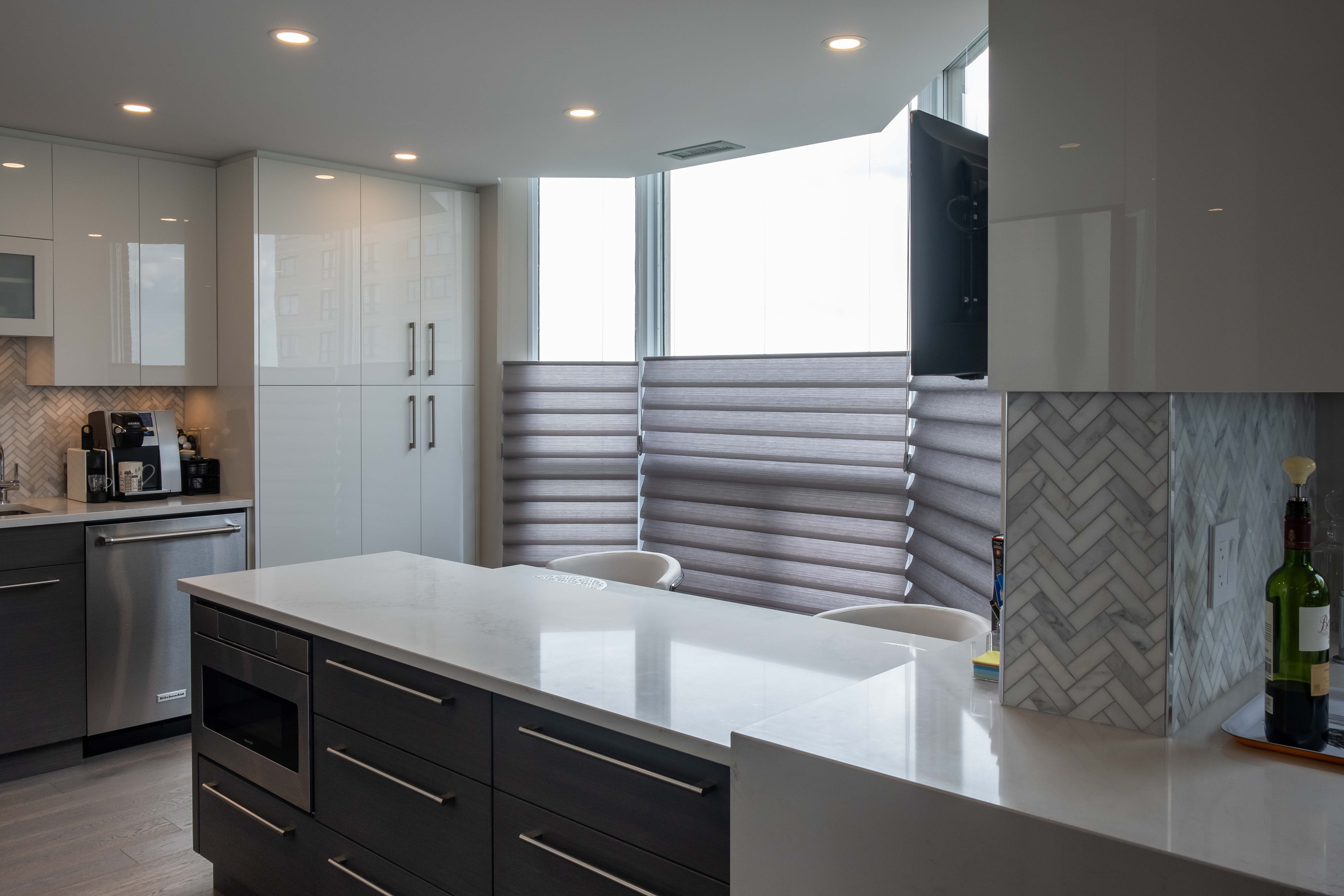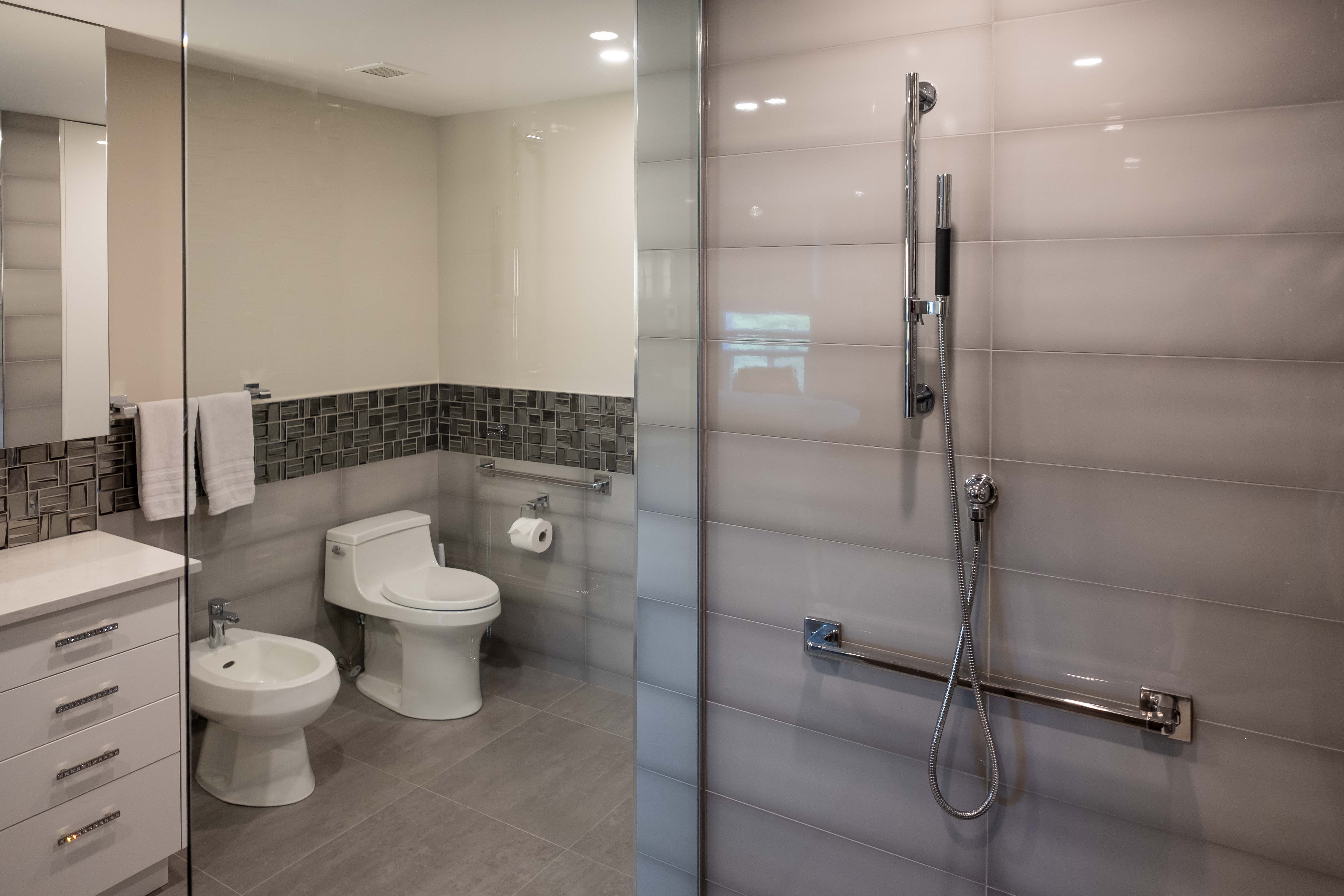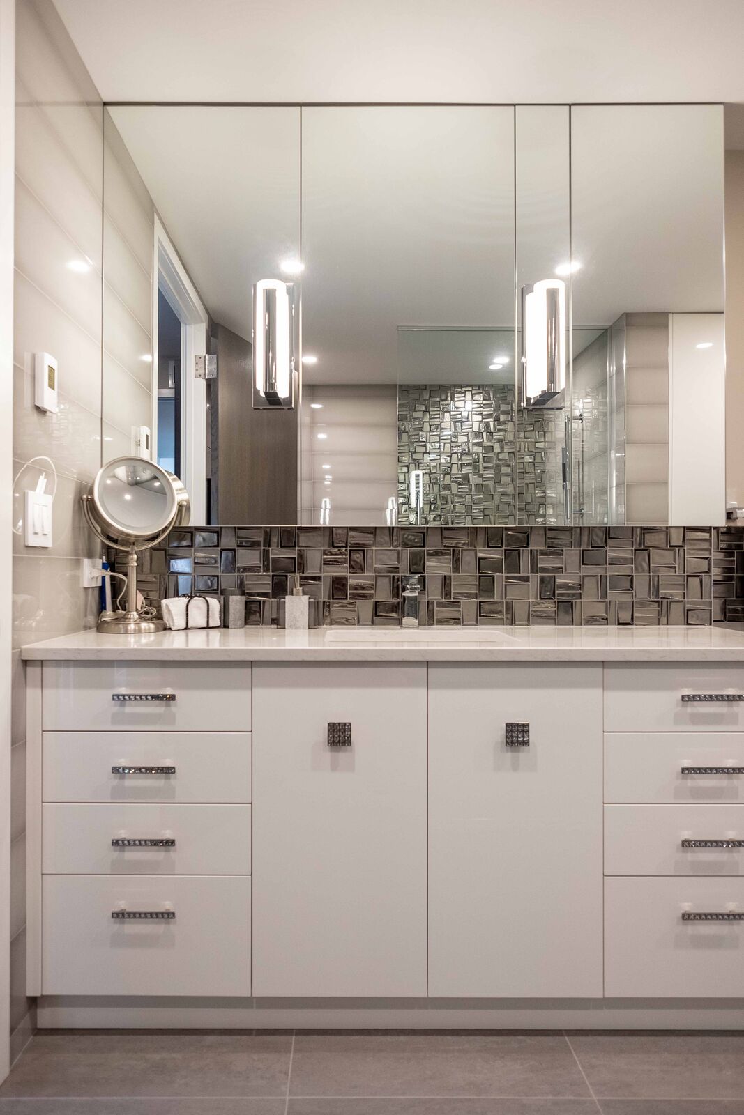 Our client secured a large suite in a much sought-after building. It was dark, dated and dismal. We removed a diagonal wall that had defined a den area (but blocked the view), opened the kitchen, and flipped the location of the dining room and den. This created a better flow between the spaces, put dinner party guests next to windows and provided panoramic treetop views to the south and west. The hall to the bedrooms was widened to further the feeling of spaciousness and to provide better accessibility. Eliminating a jetted tub allowed for a huge glass-screened shower with no door and no shower curb. “Designer grab bars” look pretty, not institutional, while still offering security and safety. Faceted glass tiles in silver are elegant and timeless. The floor tiles are large format and slip resistant; they continue uninterrupted into the shower. In the guest bath, a tiny shower enclosure was replaced with an open shower area defined by a glass screen and minimal threshold. An Ebony Macassar vanity with Swarovski pulls was designed for a glamorous touch. Wide plank matte-finish grey-tone oak hardwood flooring unites most of the space, with heated porcelain tile in the sunroom, guest bath, laundry room and en suite. The large entertaining space is light and bright and the dining area is defined by cove lighting and a modern linear pendant. The living area is warmed by a horizontal fireplace and wired for a TV above. But our client has decided to watch TV in the cozy den with built-in desk, storage and display shelves. The guest bedroom is cozy and the sofa in the den transforms into a bed. This condo has already hosted many overnight family visits, tea, cocktail and dinner parties.