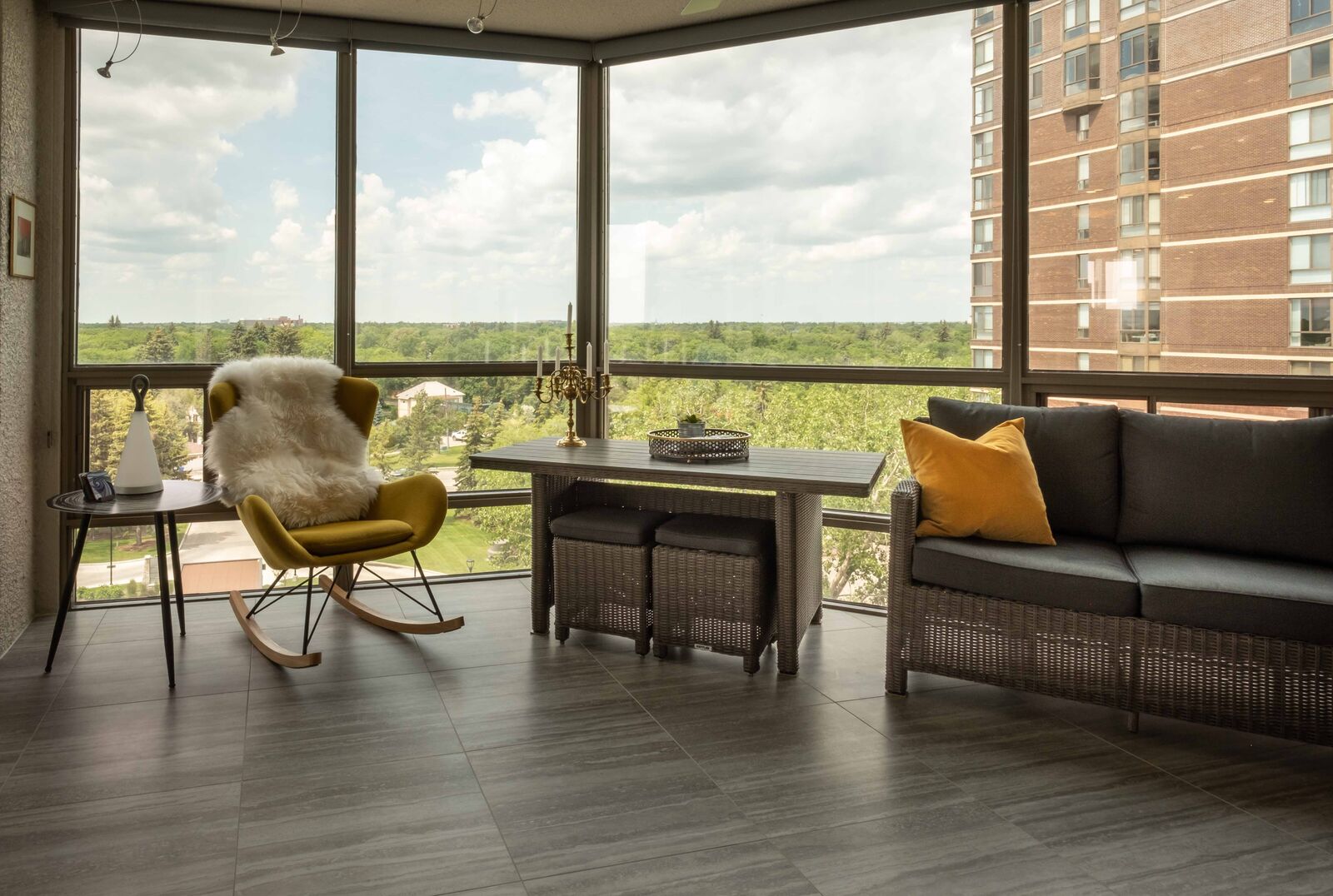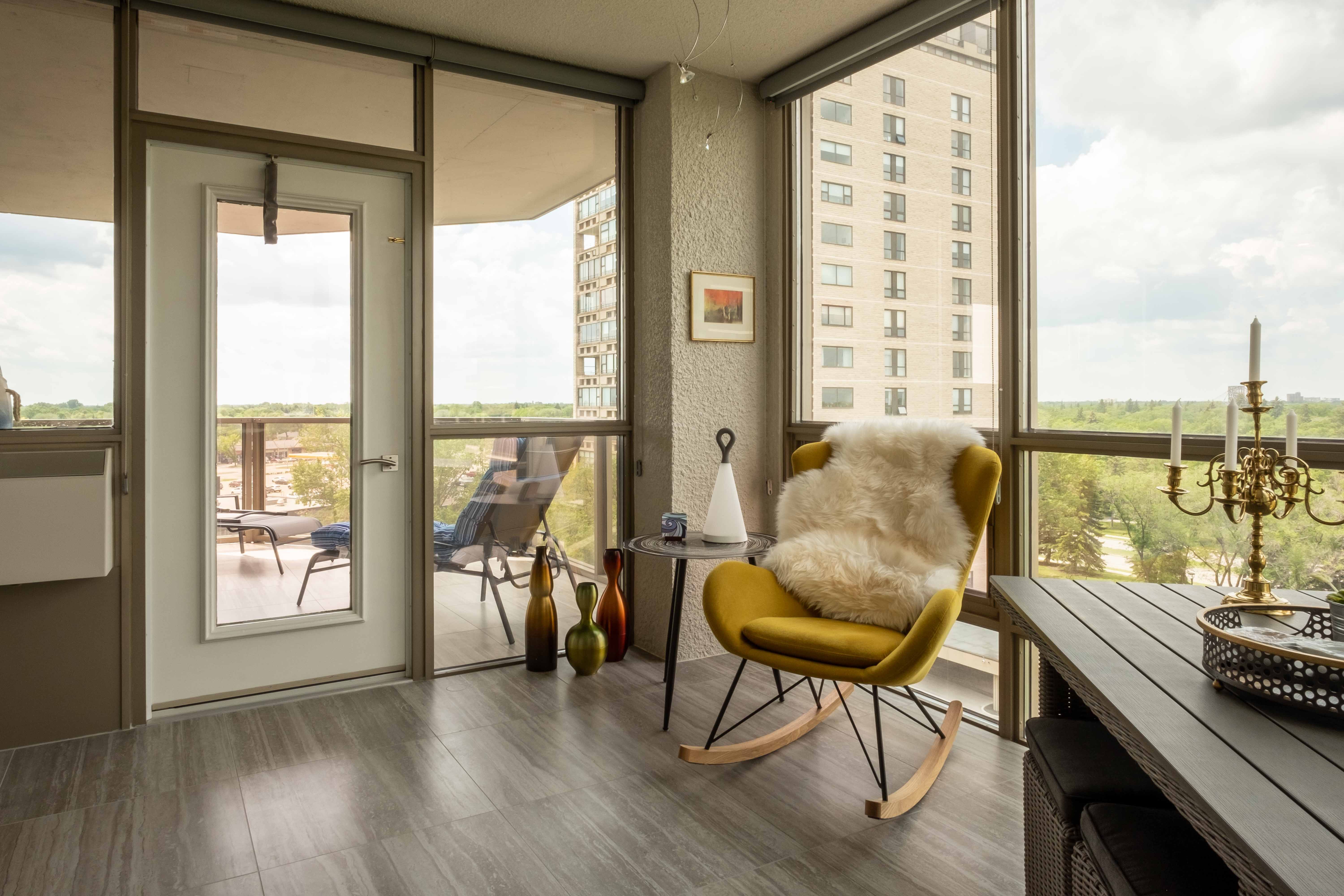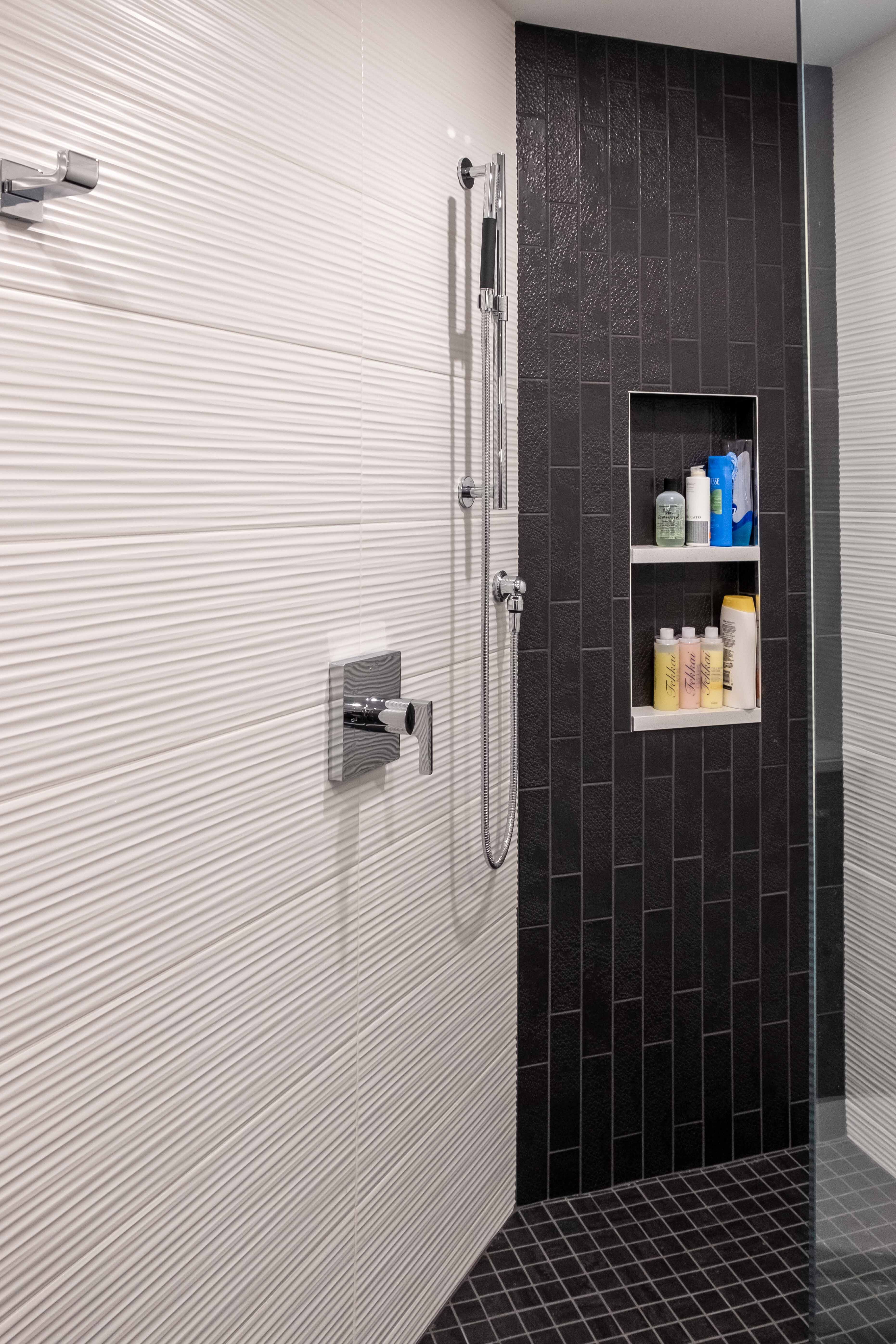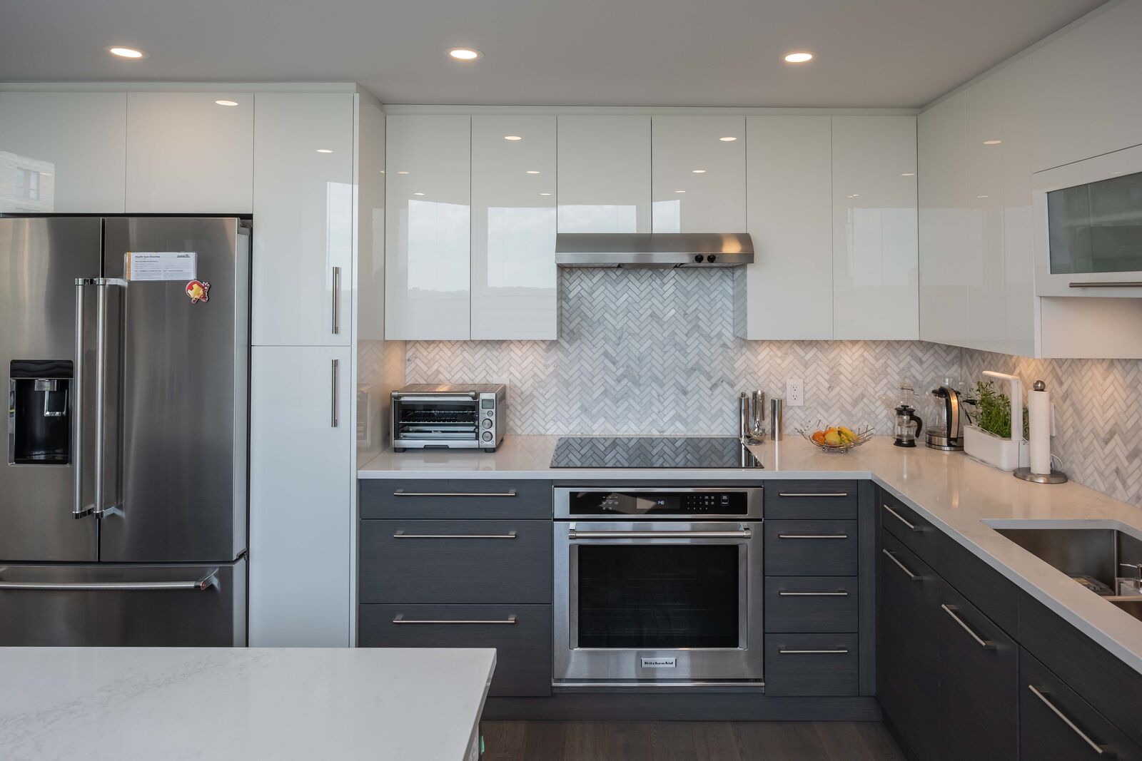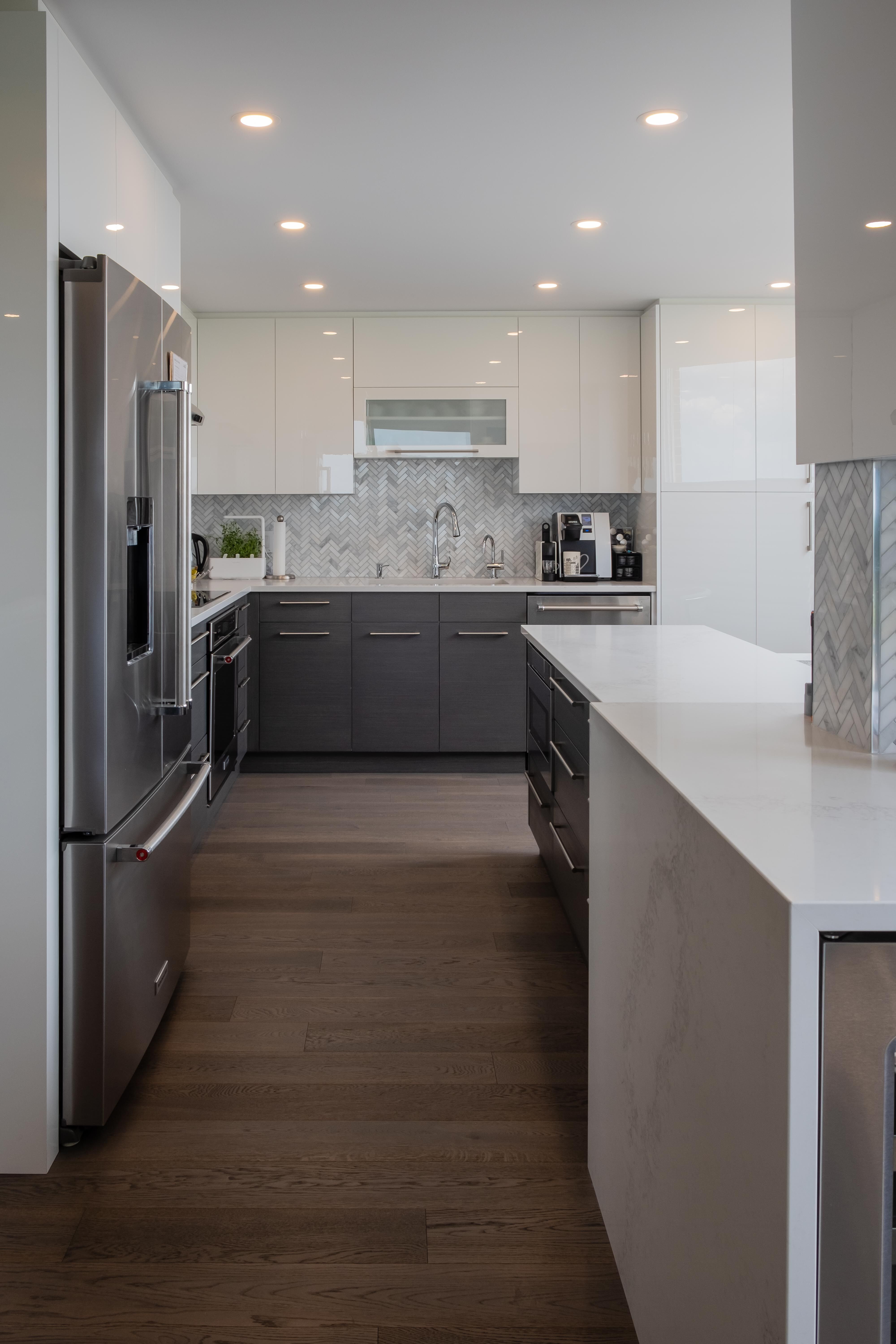 Our client secured a large suite in a much sought-after building. It was dark, dated and dismal. We removed a diagonal wall that had defined a den area (but blocked the view), opened the kitchen, and flipped the location of the dining room and den. This created a better flow between the spaces, put dinner party guests next to windows and provided panoramic treetop views to the south and west. The hall to the bedrooms was widened to further the feeling of spaciousness and to provide better accessibility. Eliminating a jetted tub allowed for a huge glass-screened shower with no door and no shower curb. “Designer grab bars” look pretty, not institutional, while still offering security and safety. Faceted glass tiles in silver are elegant and timeless. The floor tiles are large format and slip resistant; they continue uninterrupted into the shower. In the guest bath, a tiny shower enclosure was replaced with an open shower area defined by a glass screen and minimal threshold. An Ebony Macassar vanity with Swarovski pulls was designed for a glamorous touch. Wide plank matte-finish grey-tone oak hardwood flooring unites most of the space, with heated porcelain tile in the sunroom, guest bath, laundry room and en suite. The large entertaining space is light and bright and the dining area is defined by cove lighting and a modern linear pendant. The living area is warmed by a horizontal fireplace and wired for a TV above. But our client has decided to watch TV in the cozy den with built-in desk, storage and display shelves. The guest bedroom is cozy and the sofa in the den transforms into a bed. This condo has already hosted many overnight family visits, tea, cocktail and dinner parties.