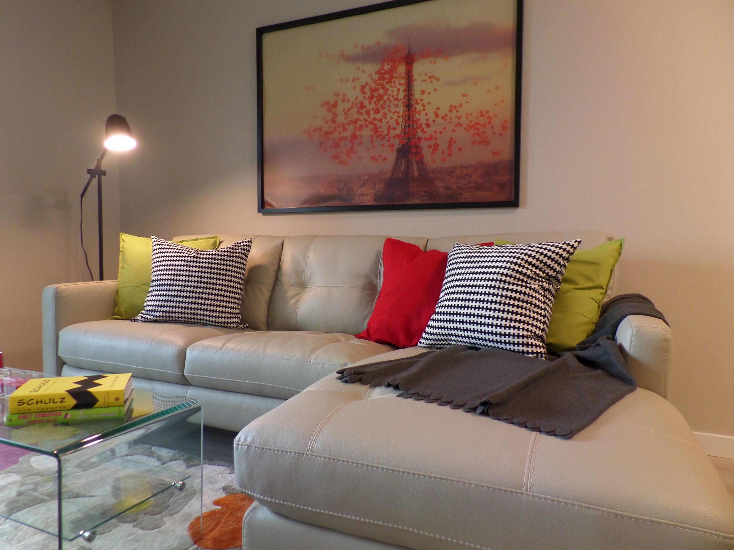 The one-bedroom became a hip apartment with vibrant colors and patterns. In the living room, a neutral faux-leather sectional is paired with a bold floral area rug. The dining area features bright yellow chairs around a glass-top table. The bedroom furniture is black metal and dark-brown wood-grain; the duvet cover is a bold black and white print; and the wall art is bright pink peonies.