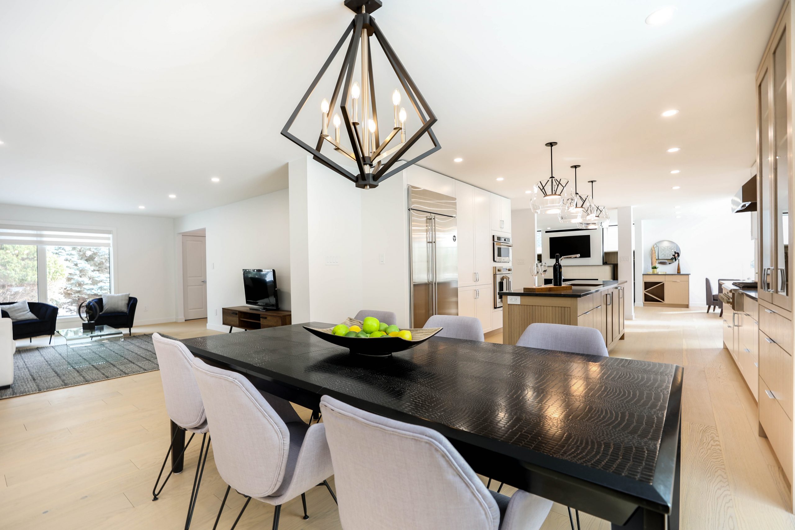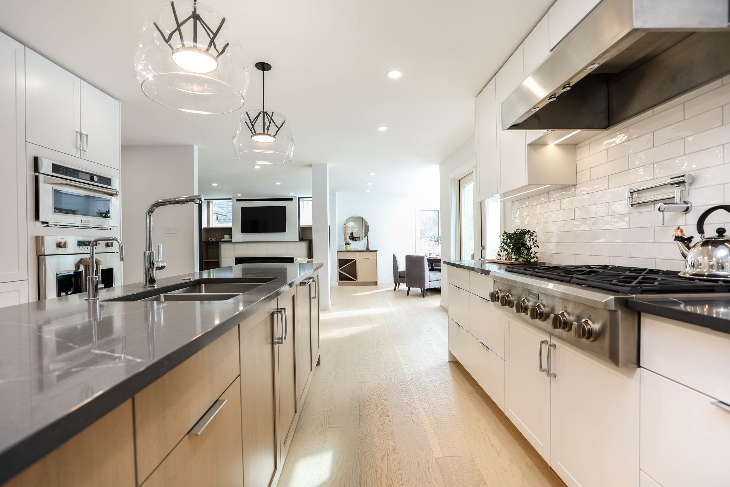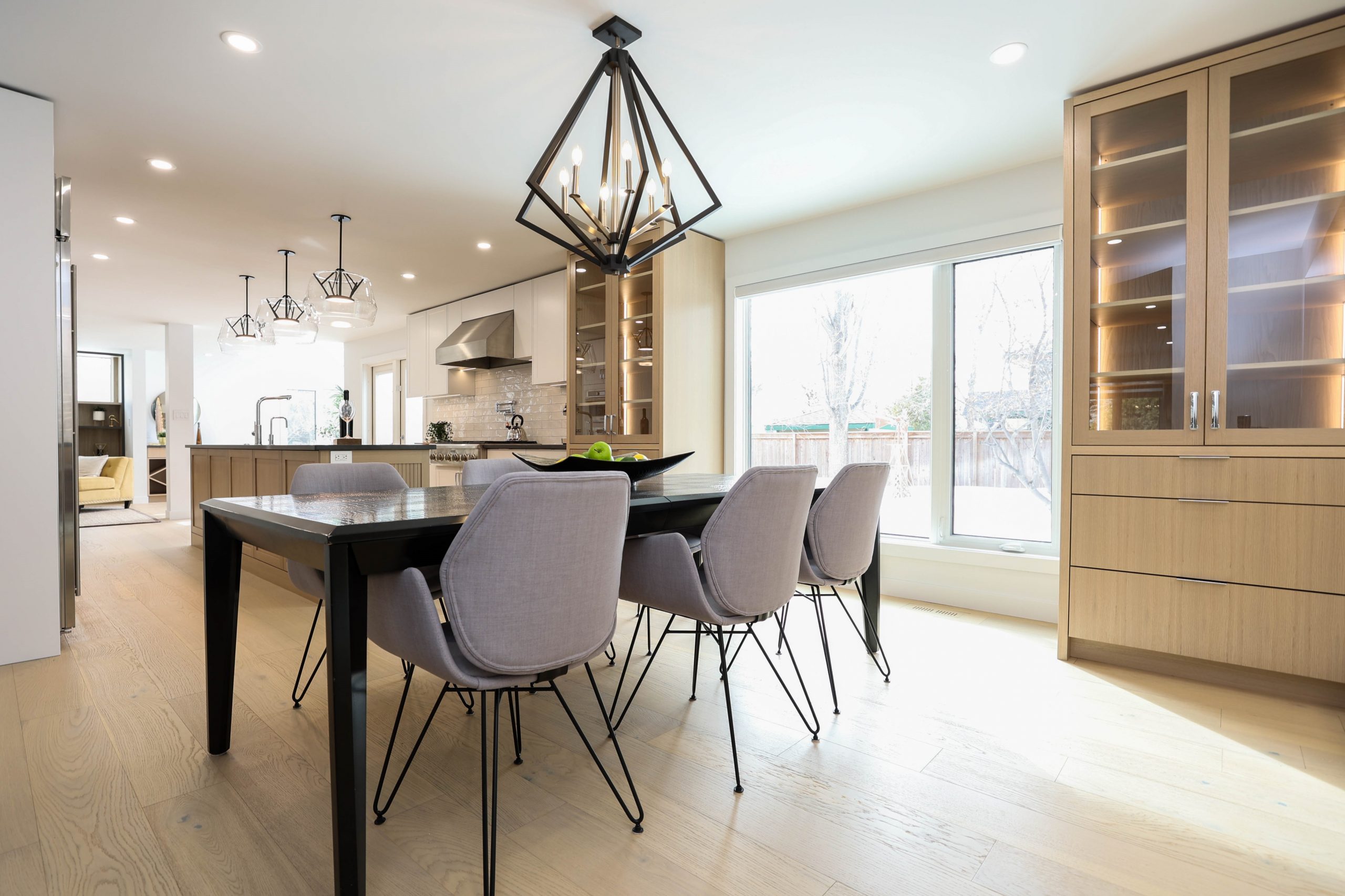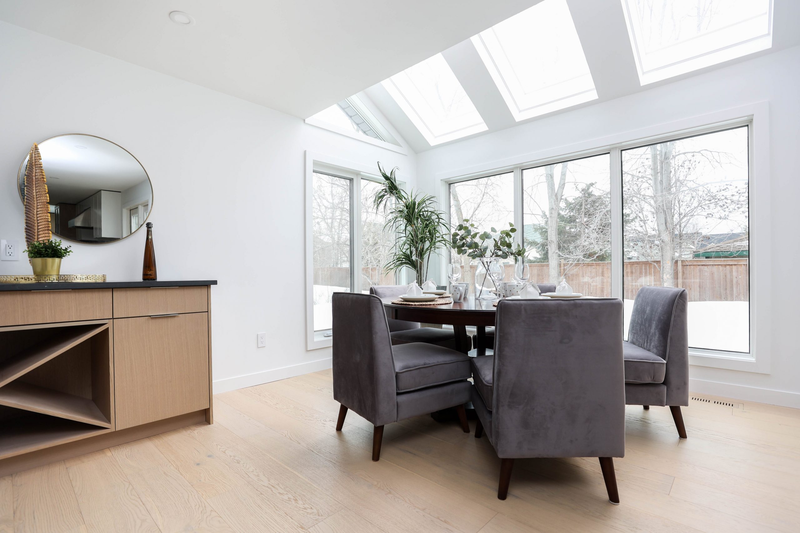 We transformed this 1986 2-storey into a modern open-plan home to inspire entertaining and family life. A backdrop of crisp white highlights the wide-plank platinum blonde oak floors, white and white oak cabinetry, charcoal grey counters, and details in polished chrome and black. The kitchen boasts luxury Monogram appliances, and is open to the dining room, sunroom and family room. A long linear gas fireplace, flanked by display shelves, creates a cozy family room space. The second-floor loft space was added to the primary suite. This allowed for an amazing dressing room with island, and doubled the size of the en suite. The basement was developed to provide a fourth bedroom, full bath, TV/ games area, home gym, and ample storage space.