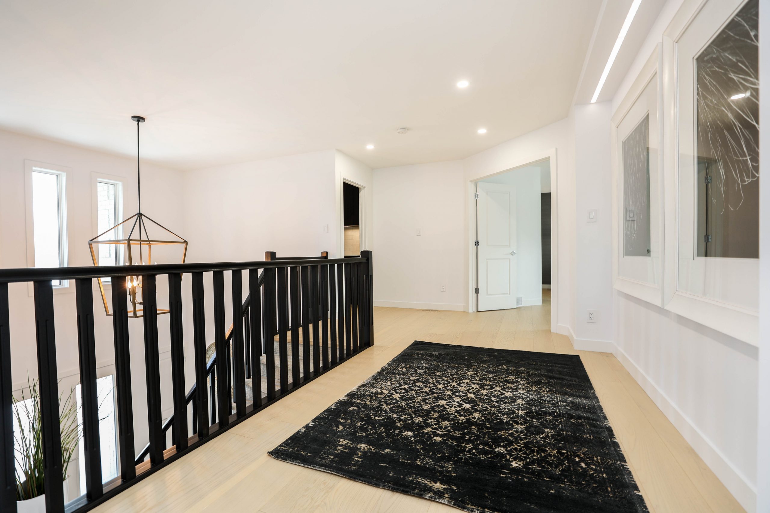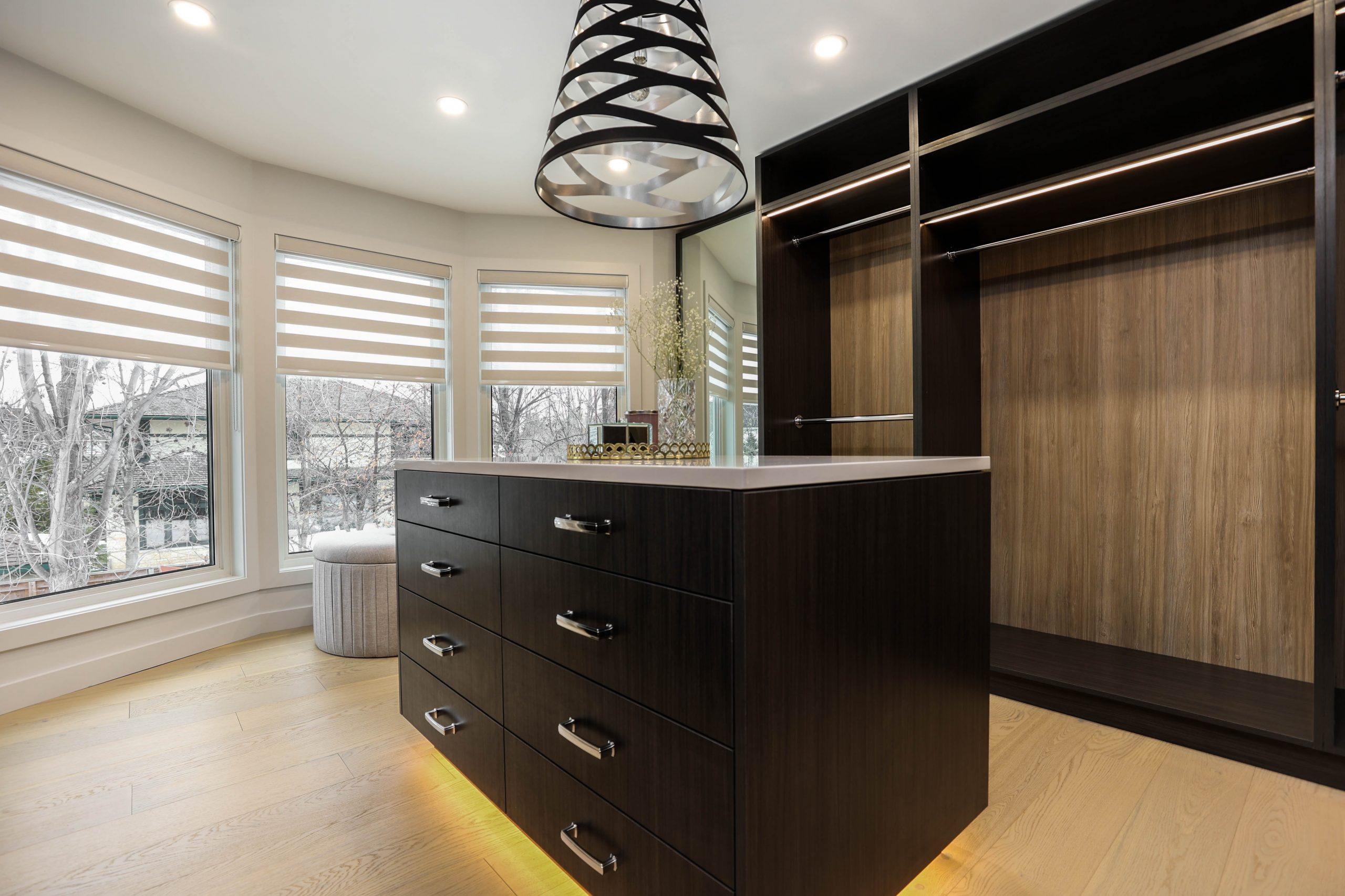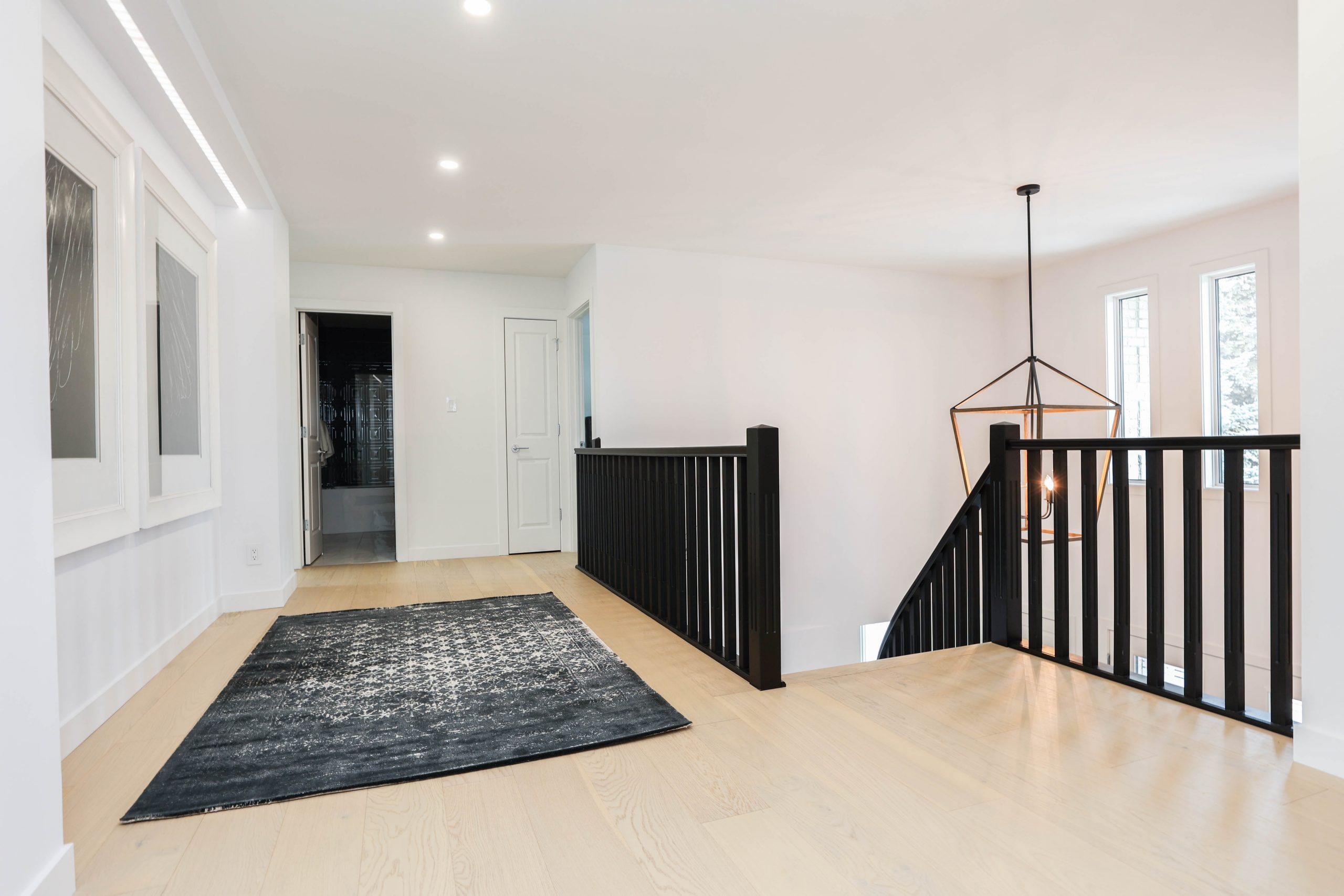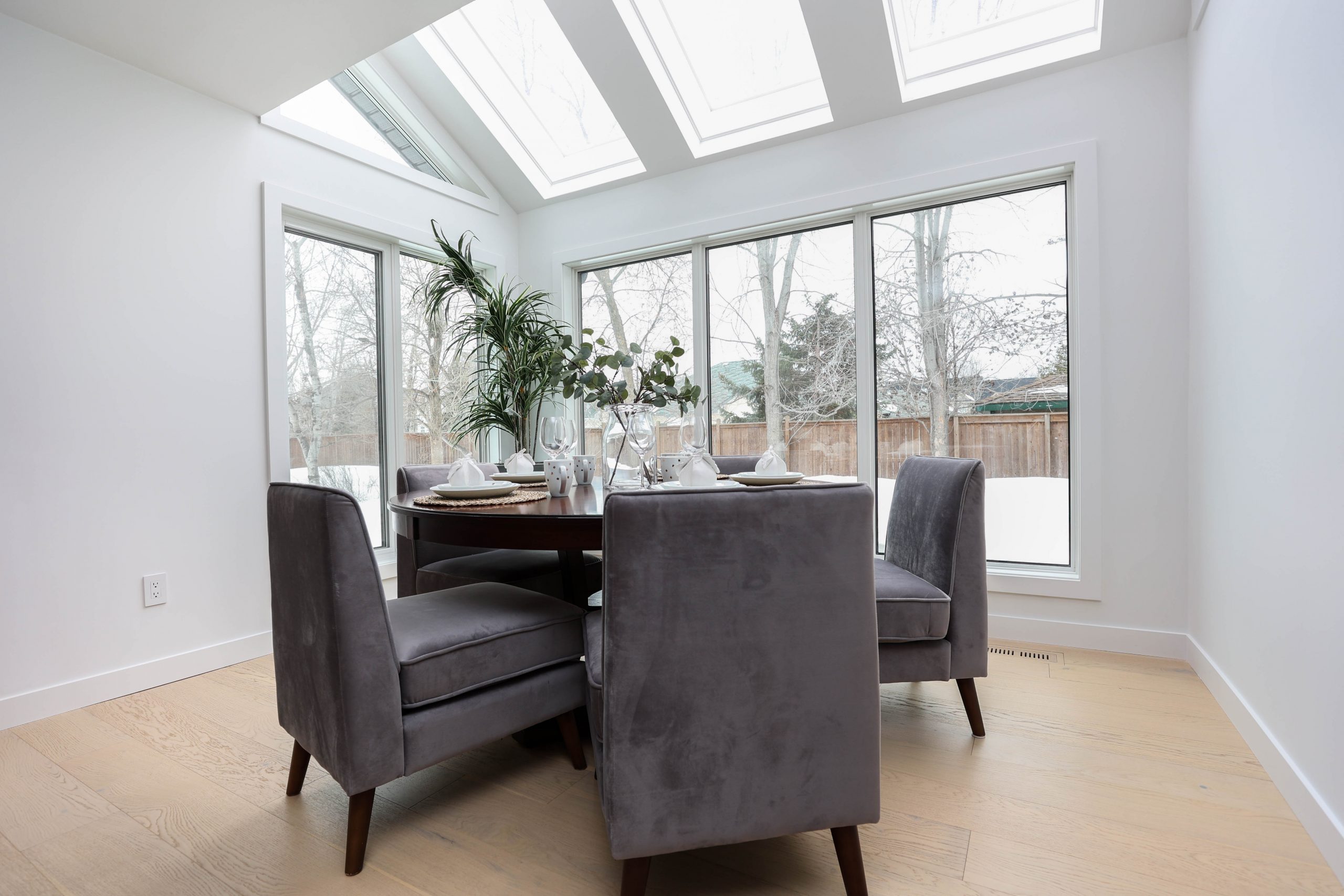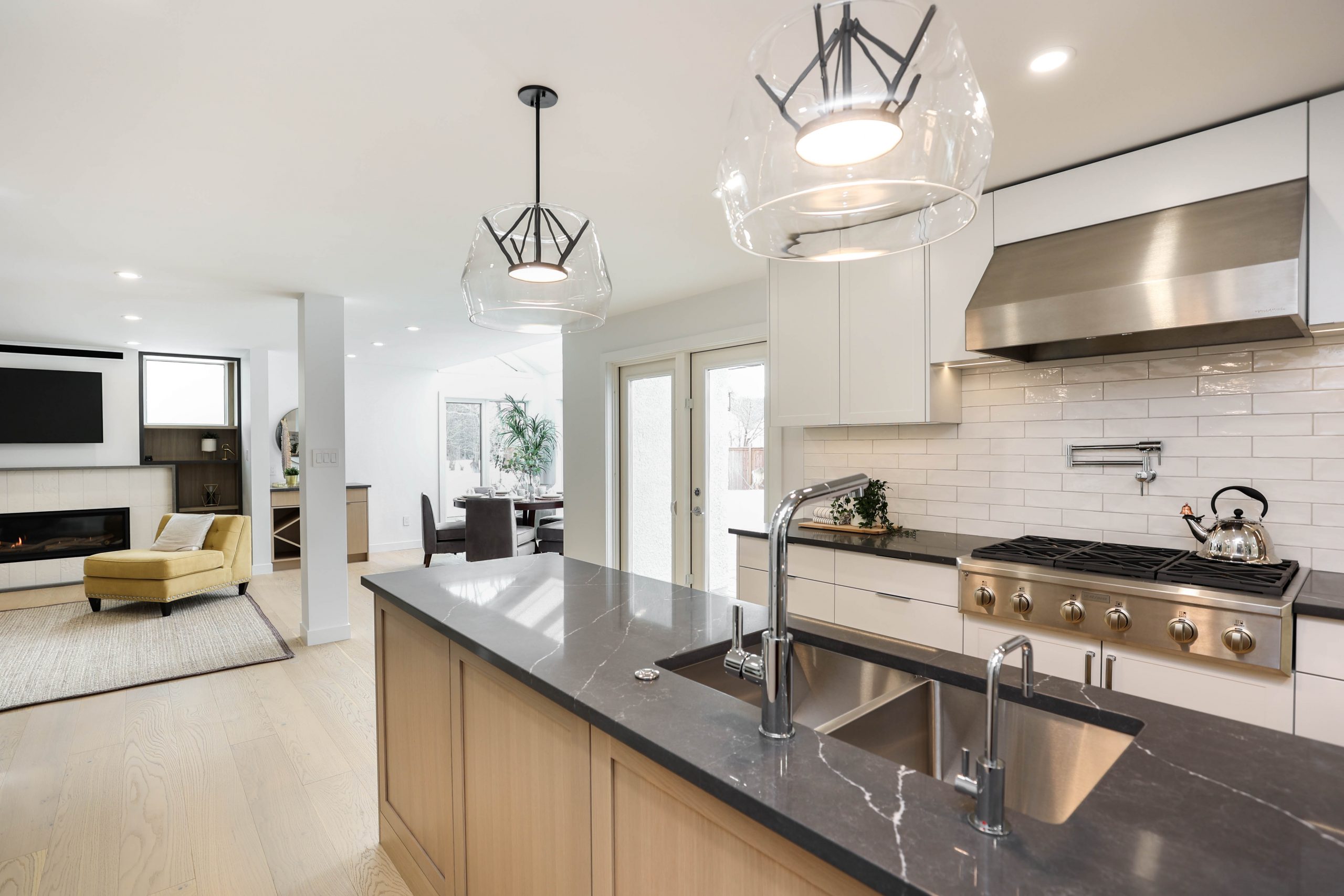 We transformed this 1986 2-storey into a modern open-plan home to inspire entertaining and family life. A backdrop of crisp white highlights the wide-plank platinum blonde oak floors, white and white oak cabinetry, charcoal grey counters, and details in polished chrome and black. The kitchen boasts luxury Monogram appliances, and is open to the dining room, sunroom and family room. A long linear gas fireplace, flanked by display shelves, creates a cozy family room space. The second-floor loft space was added to the primary suite. This allowed for an amazing dressing room with island, and doubled the size of the en suite. The basement was developed to provide a fourth bedroom, full bath, TV/ games area, home gym, and ample storage space.