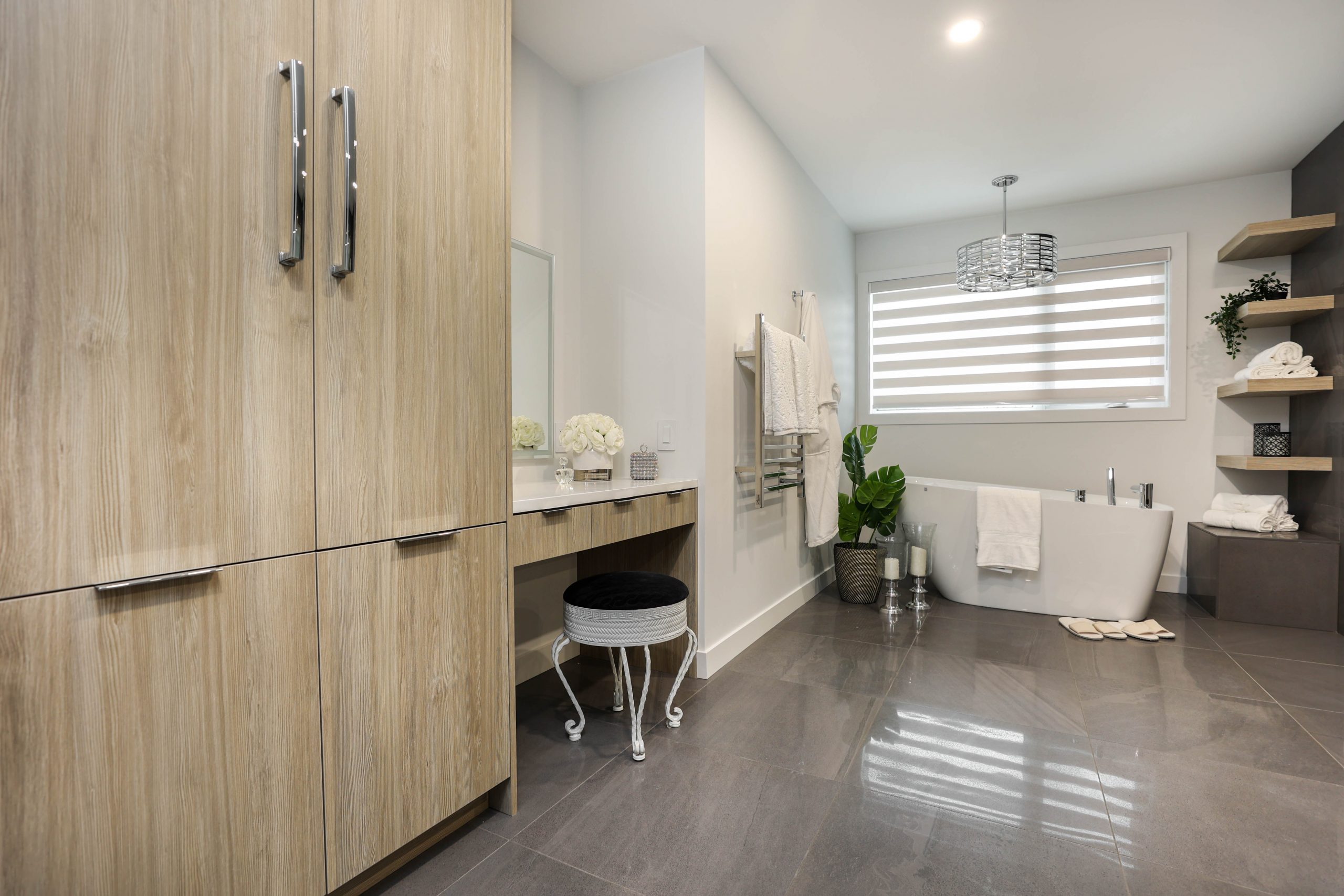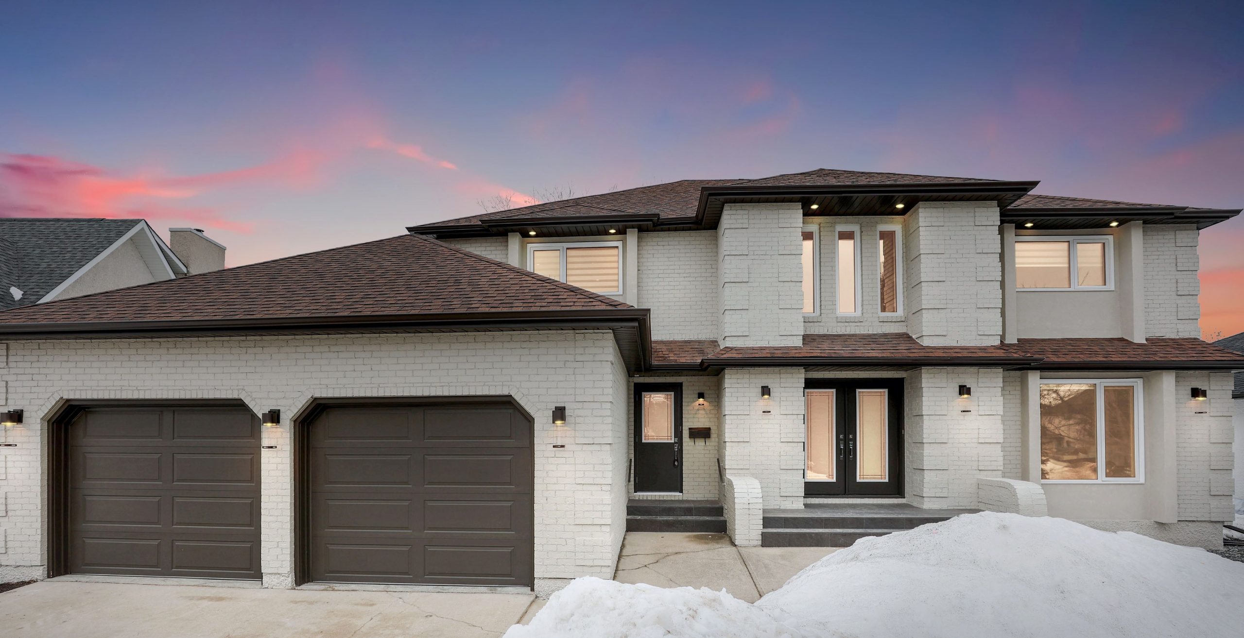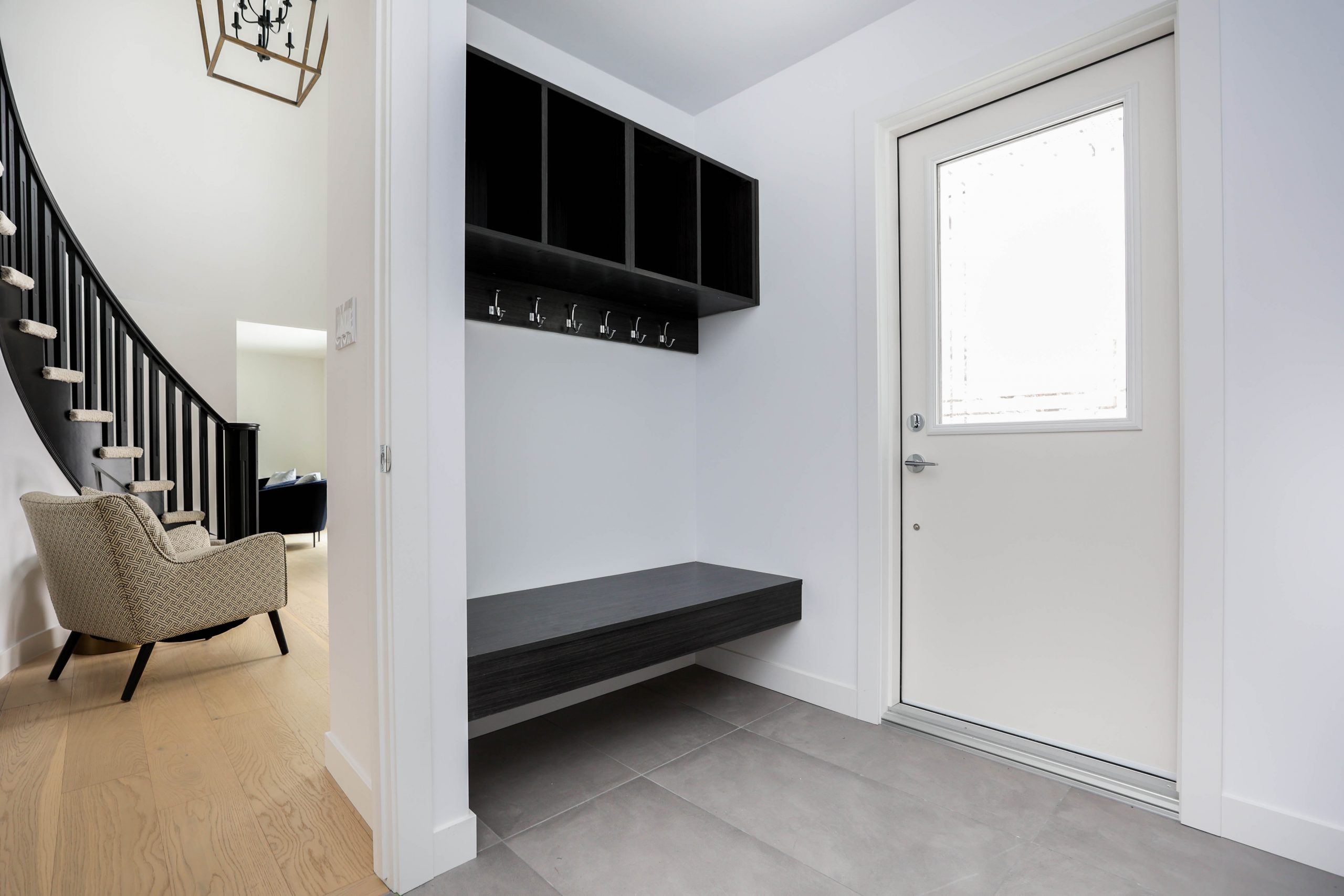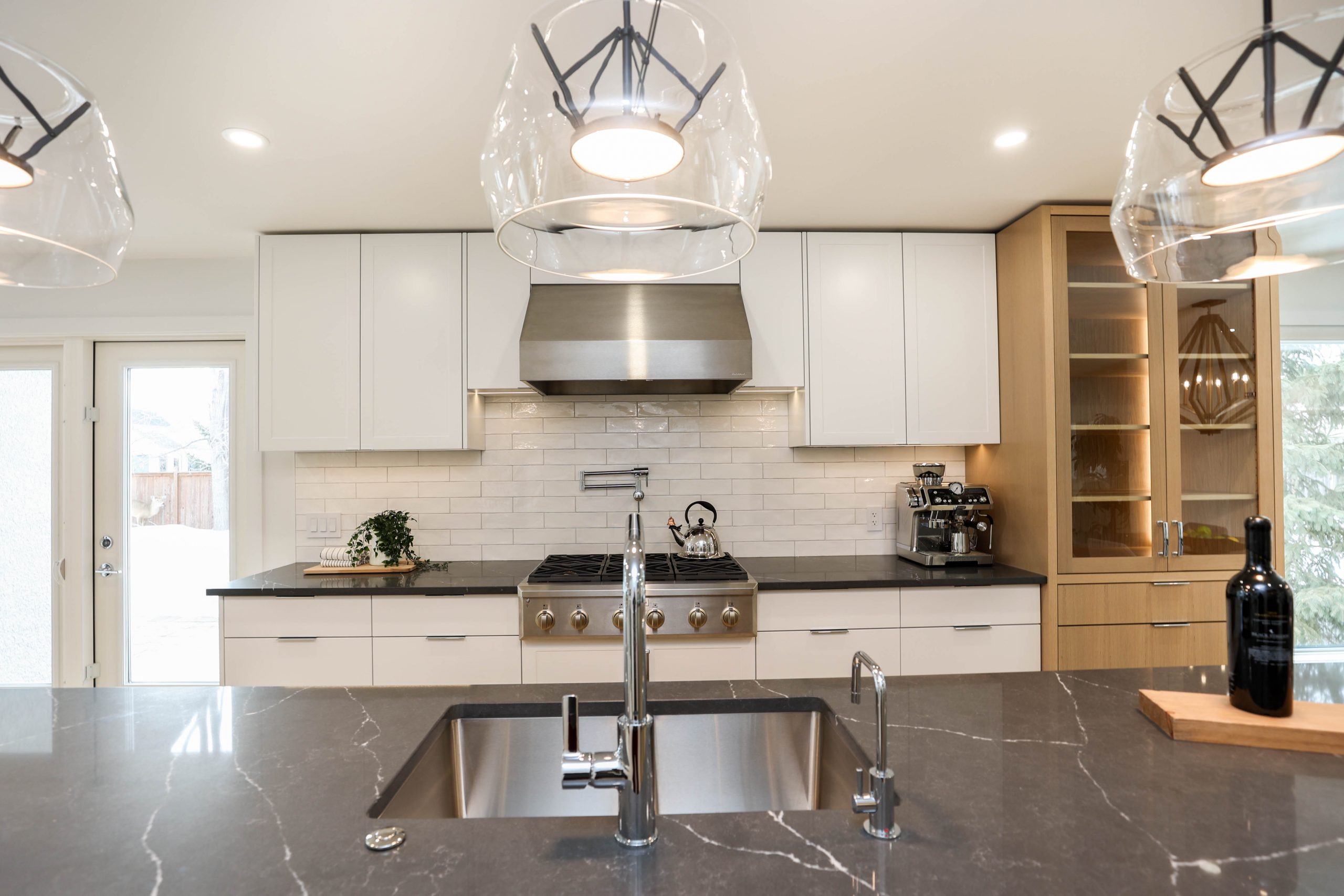 We transformed this 1986 2-storey into a modern open-plan home to inspire entertaining and family life. A backdrop of crisp white highlights the wide-plank platinum blonde oak floors, white and white oak cabinetry, charcoal grey counters, and details in polished chrome and black. The kitchen boasts luxury Monogram appliances, and is open to the dining room, sunroom and family room. A long linear gas fireplace, flanked by display shelves, creates a cozy family room space. The second-floor loft space was added to the primary suite. This allowed for an amazing dressing room with island, and doubled the size of the en suite. The basement was developed to provide a fourth bedroom, full bath, TV/ games area, home gym, and ample storage space.