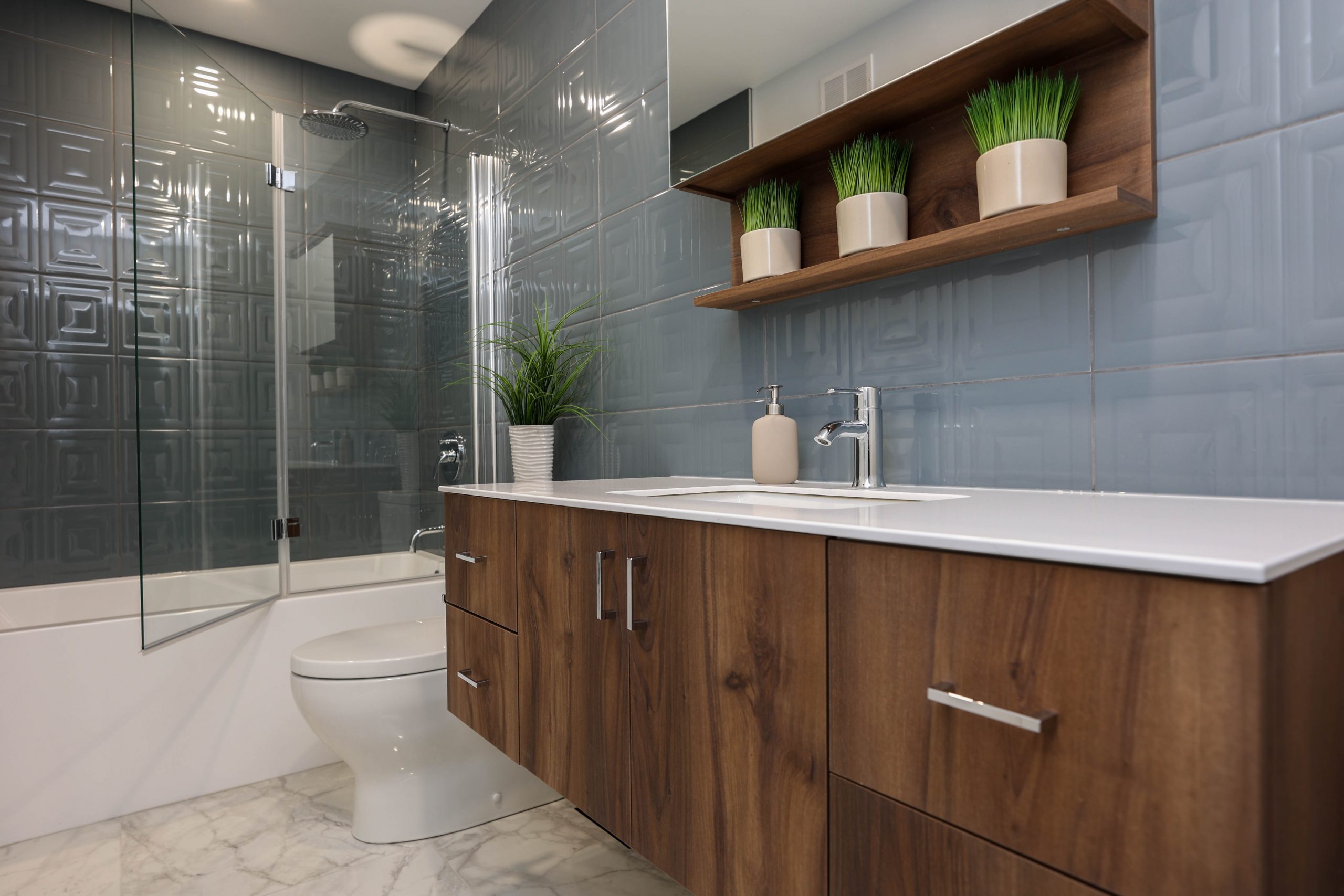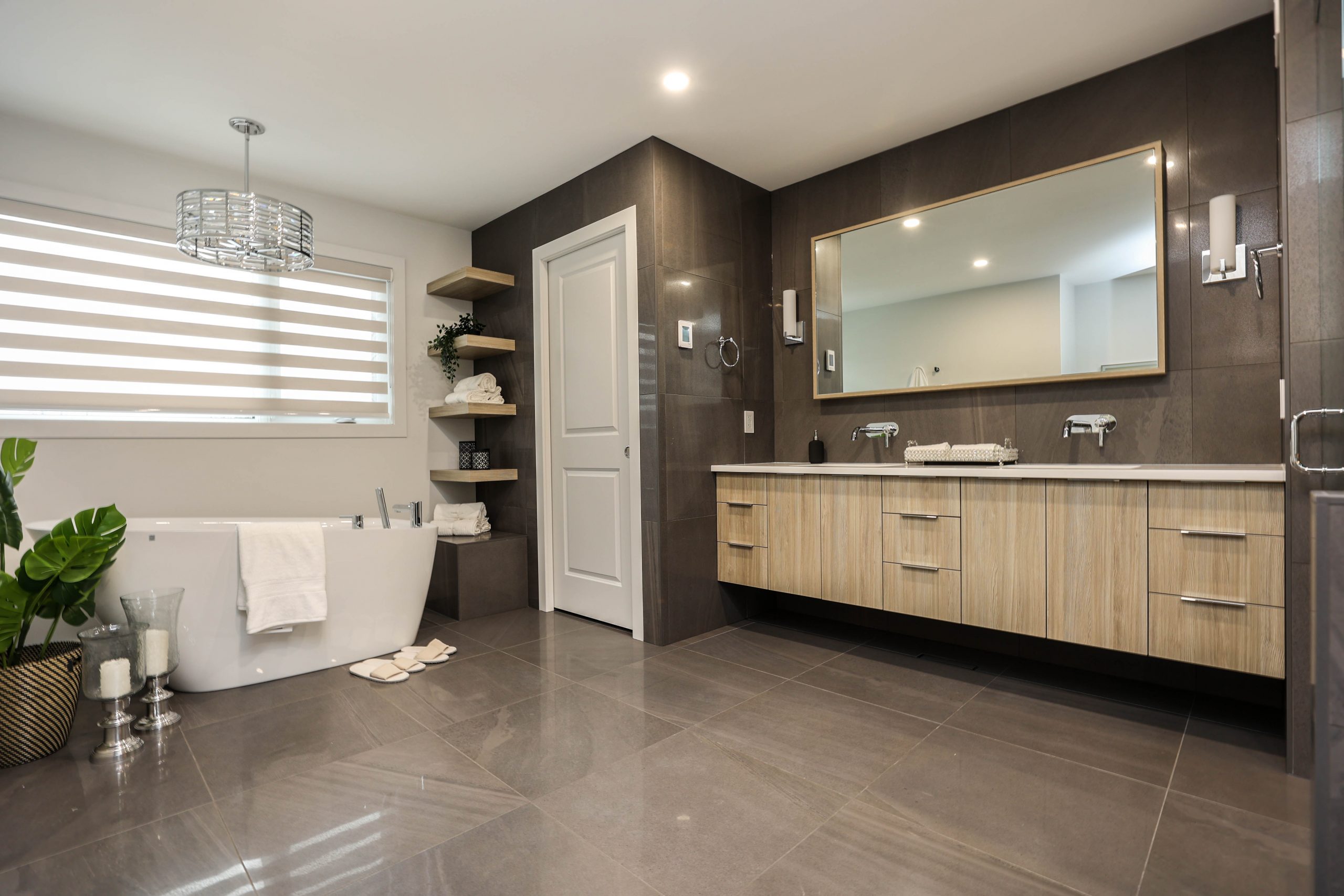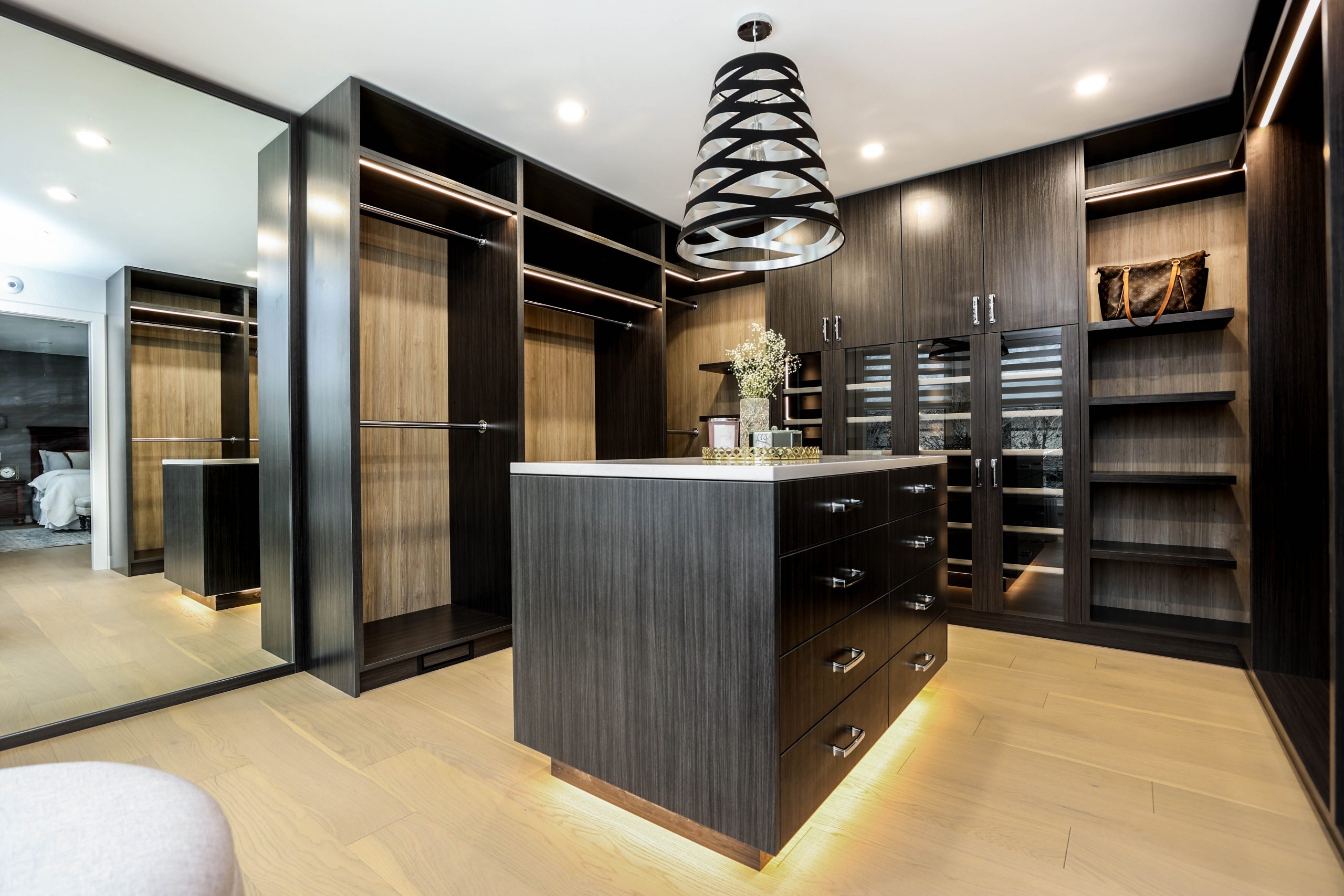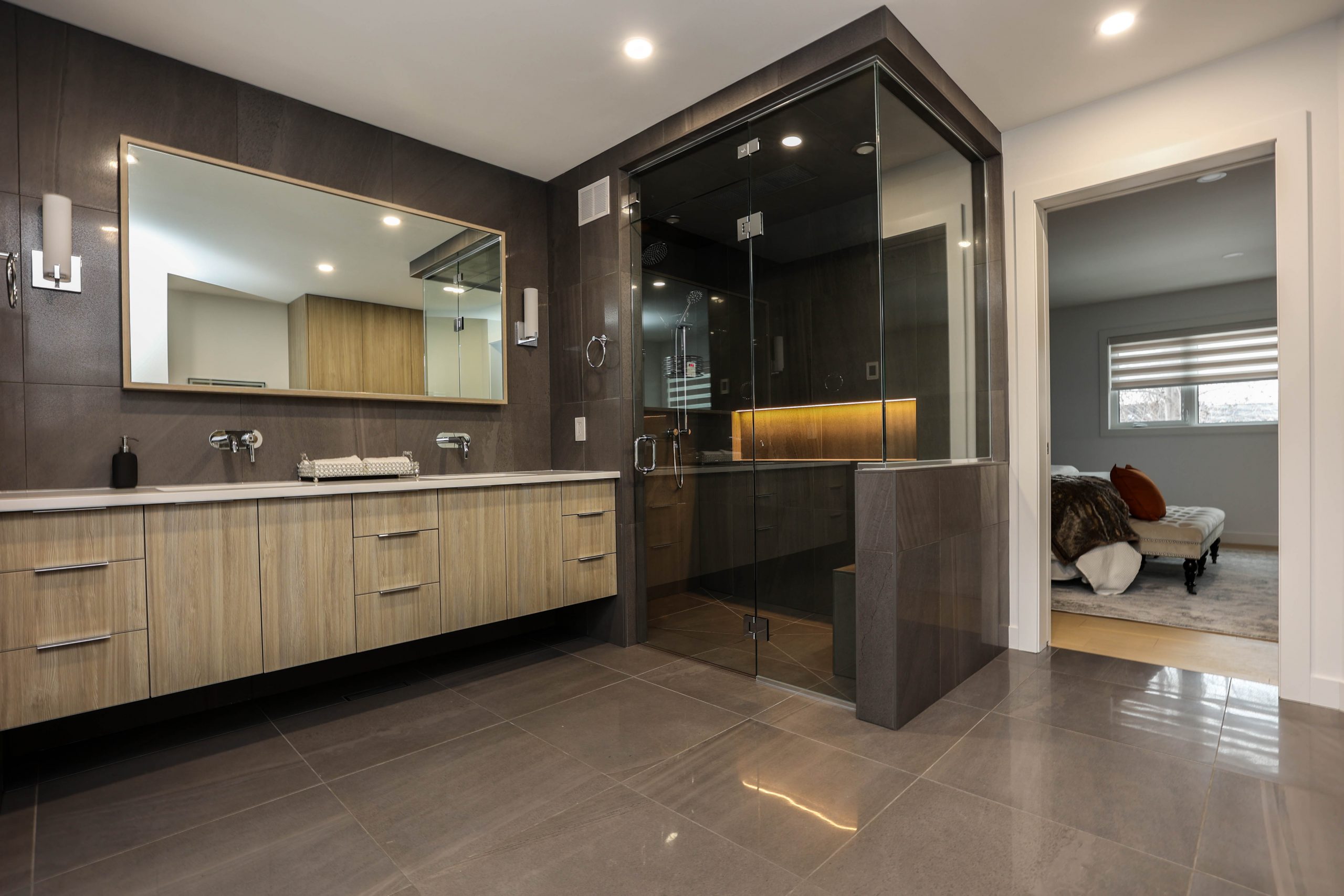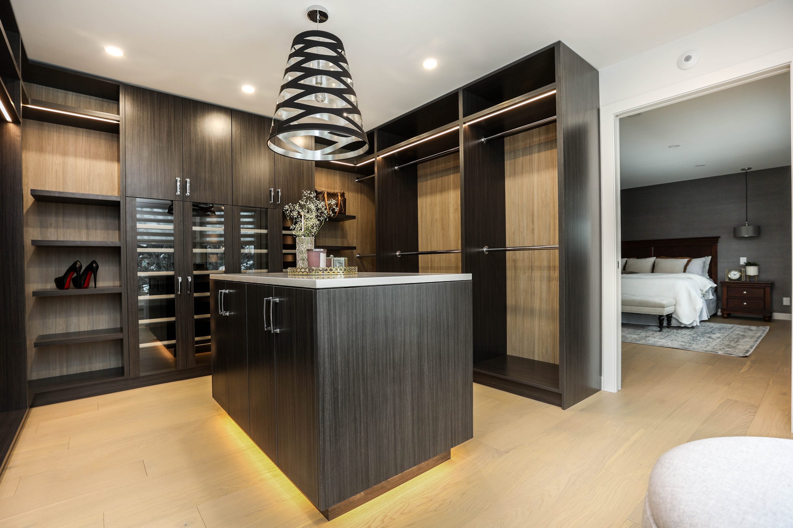 We transformed this 1986 2-storey into a modern open-plan home to inspire entertaining and family life. A backdrop of crisp white highlights the wide-plank platinum blonde oak floors, white and white oak cabinetry, charcoal grey counters, and details in polished chrome and black. The kitchen boasts luxury Monogram appliances, and is open to the dining room, sunroom and family room. A long linear gas fireplace, flanked by display shelves, creates a cozy family room space. The second-floor loft space was added to the primary suite. This allowed for an amazing dressing room with island, and doubled the size of the en suite. The basement was developed to provide a fourth bedroom, full bath, TV/ games area, home gym, and ample storage space.