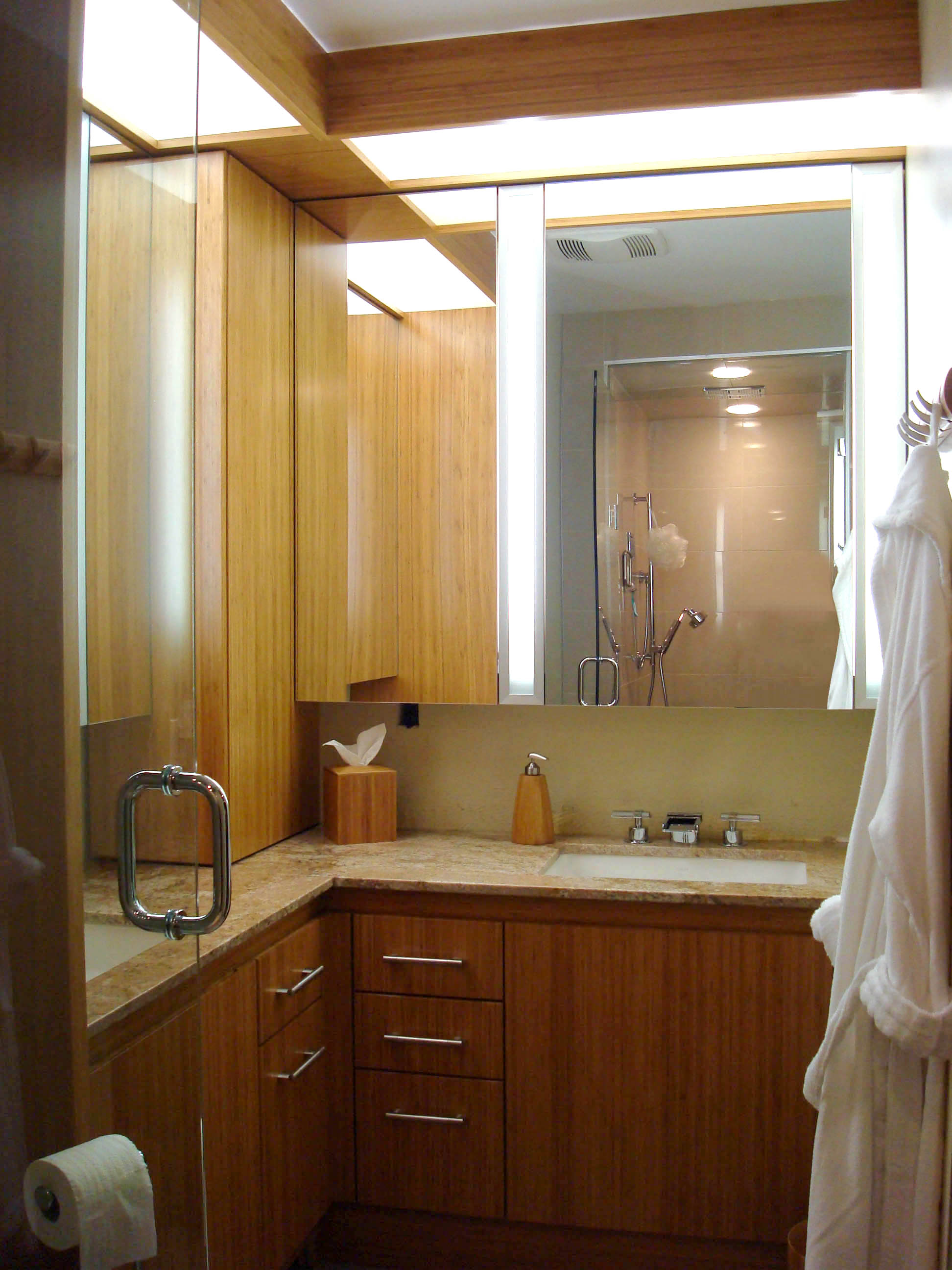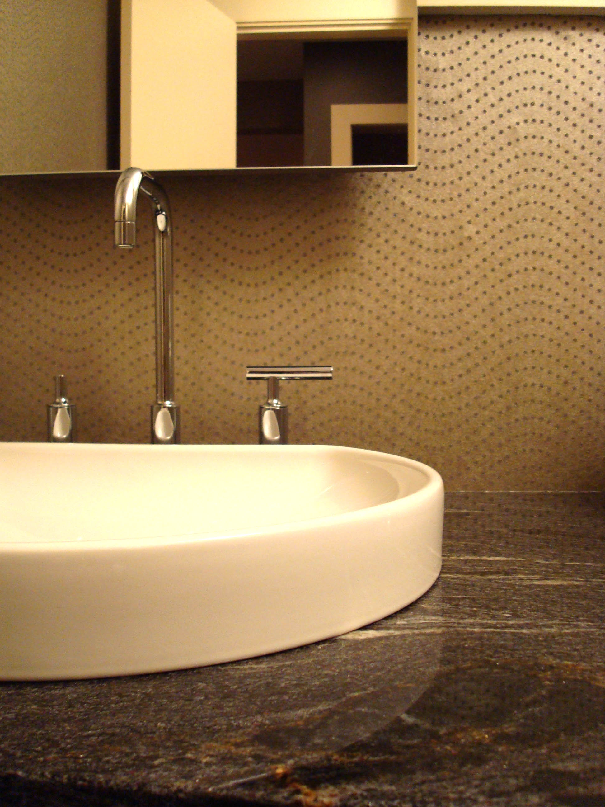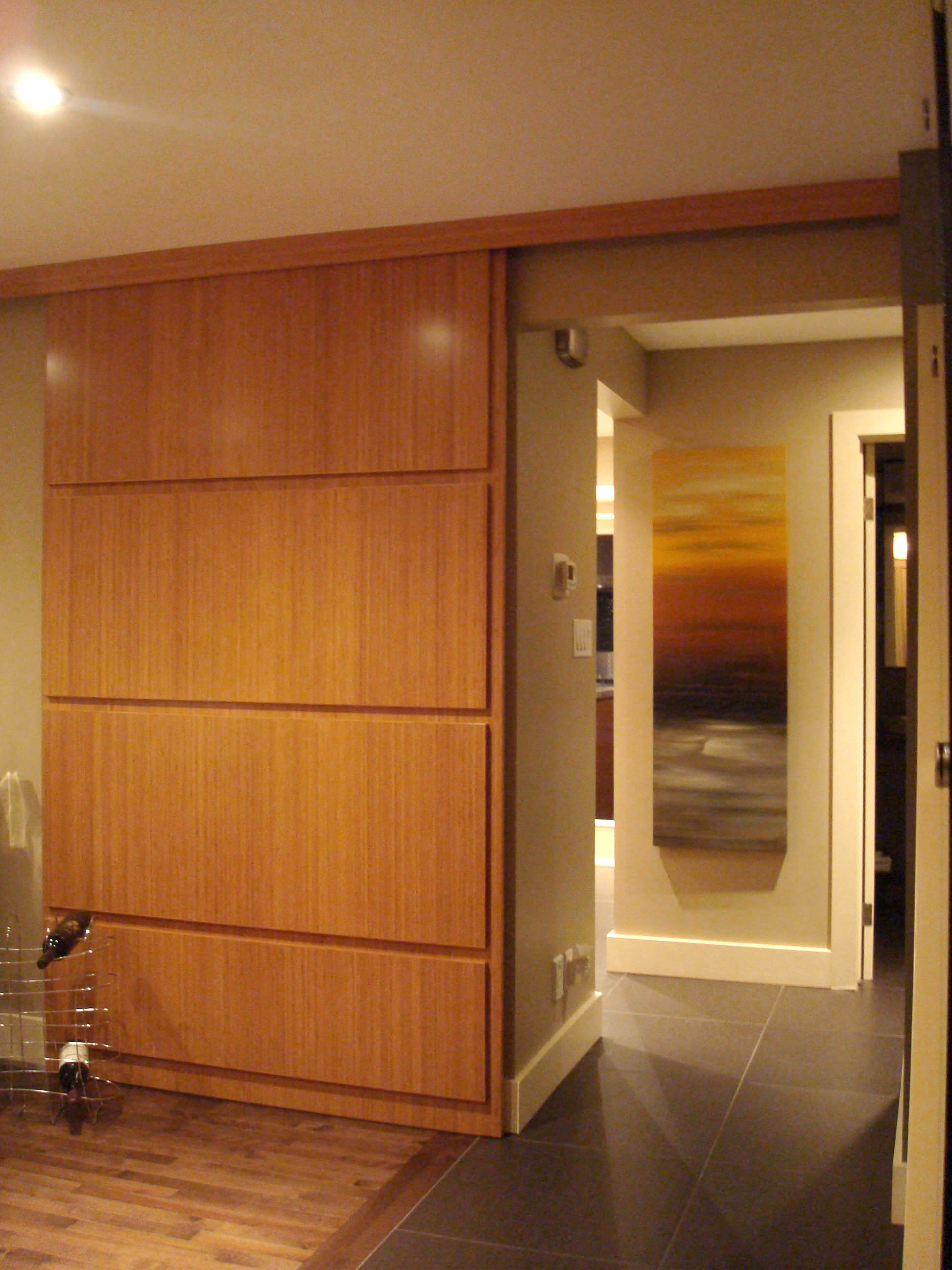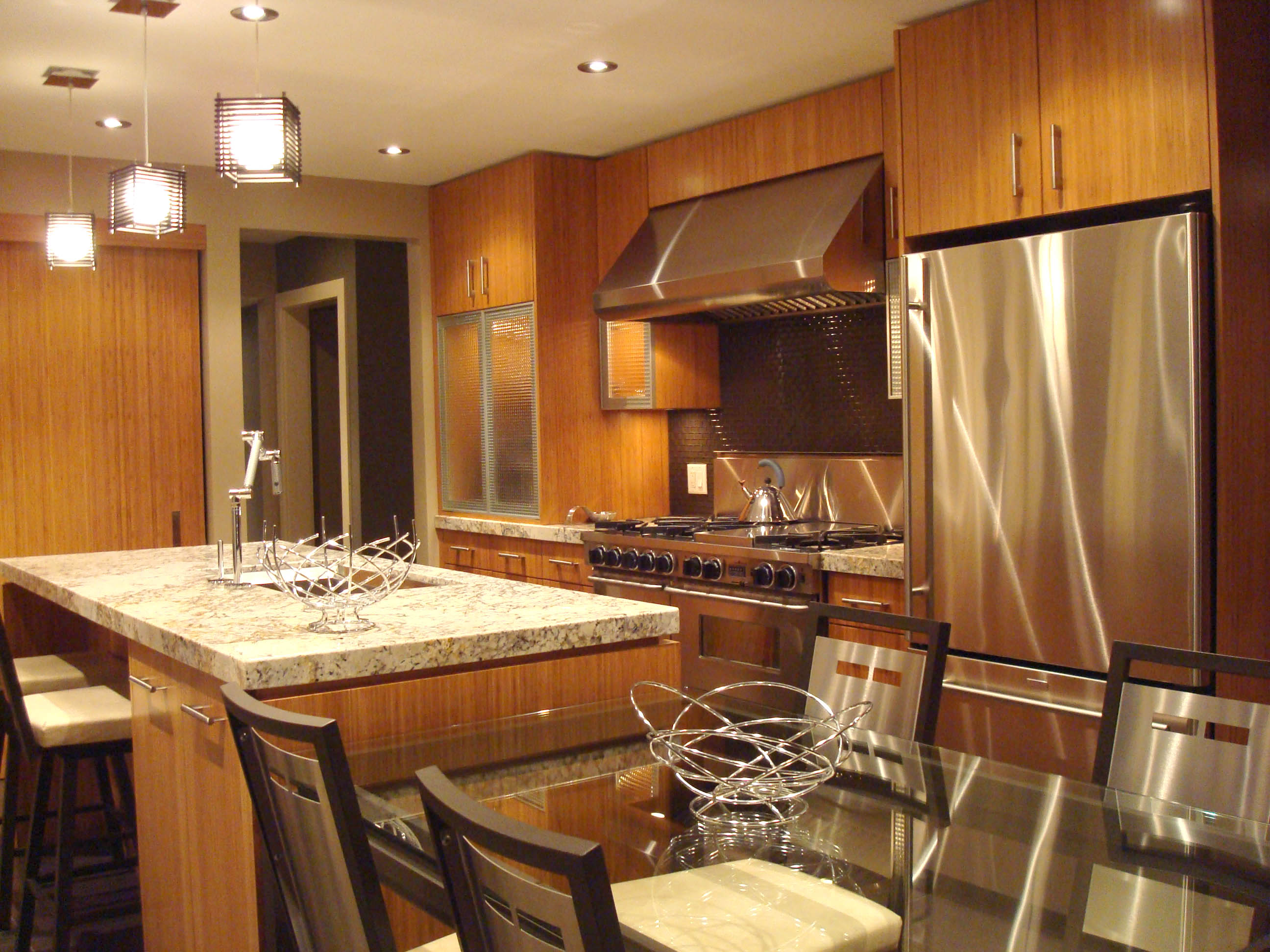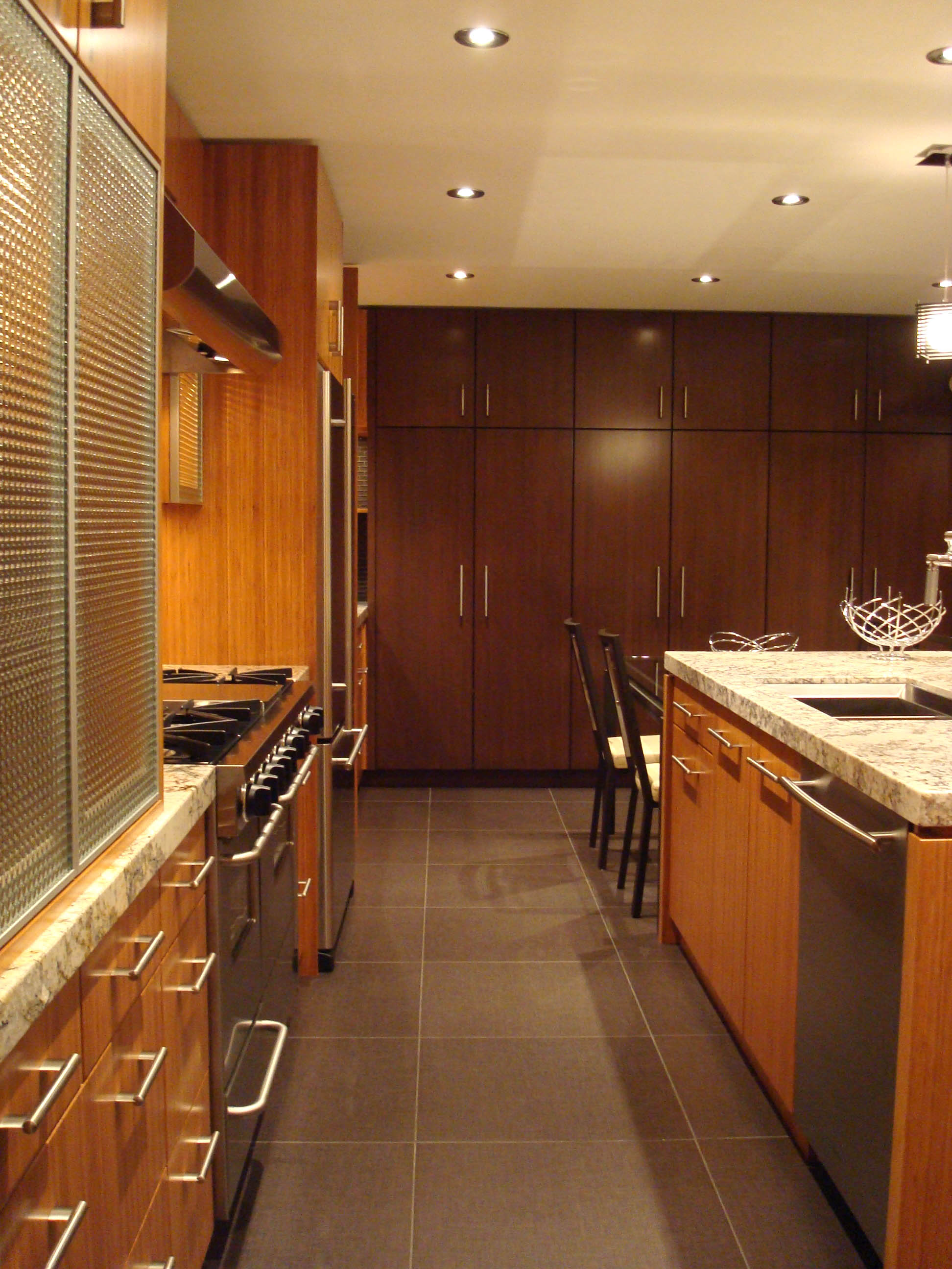 A young couple ready to start a family purchased a home which was virtually untouched since its construction in 1973. To meet the needs of a modern family, the kitchen was enlarged, a mud room was added, and the finishes were upgraded throughout. The wood-spindle railing was replaced by glass and stainless steel. In the kitchen, pro-style stainless steel appliances are warmed by bamboo cabinets. An appliance center is concealed by sliding doors, and ample storage is provided by a full wall of cabinets that were stained a darker brown.
