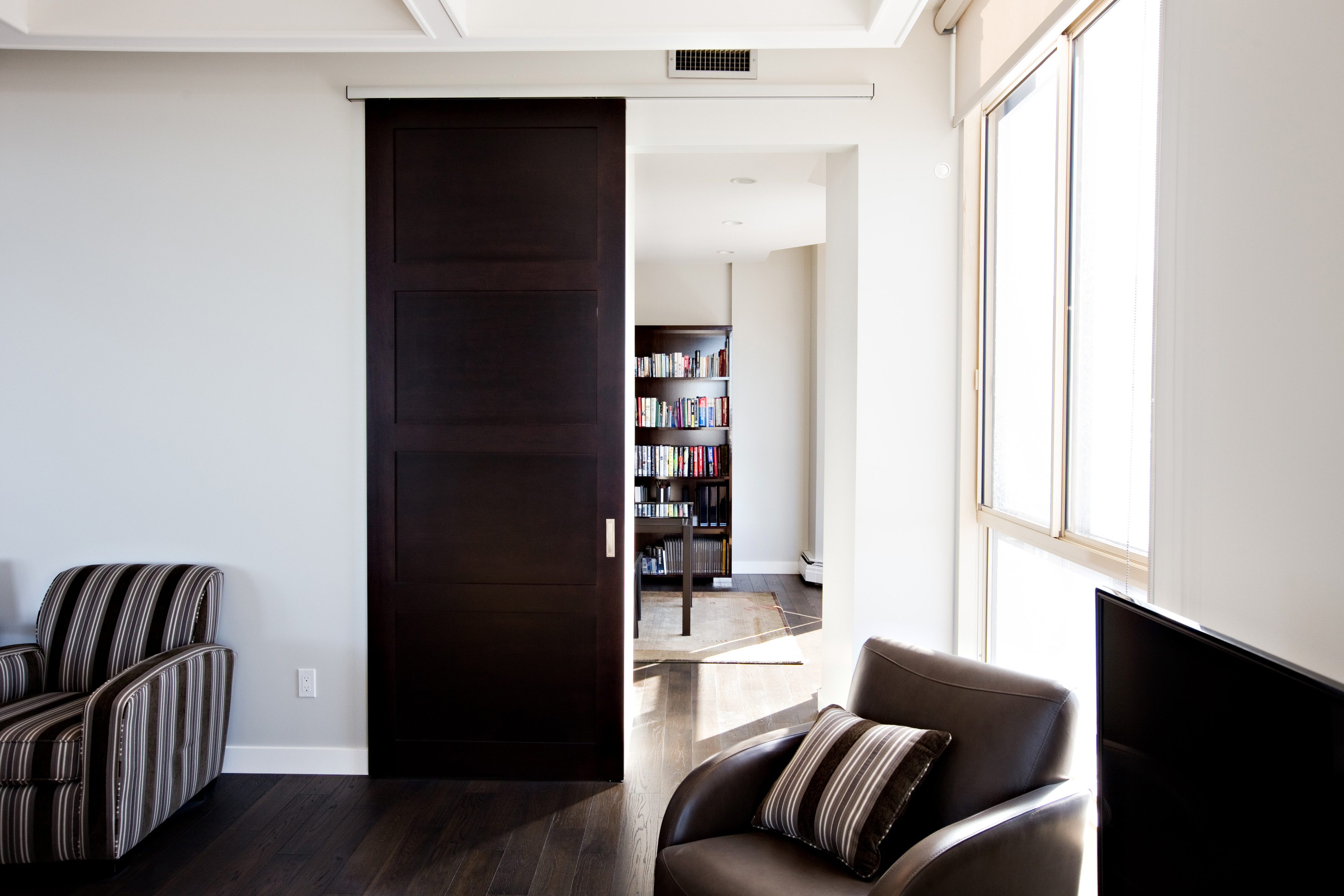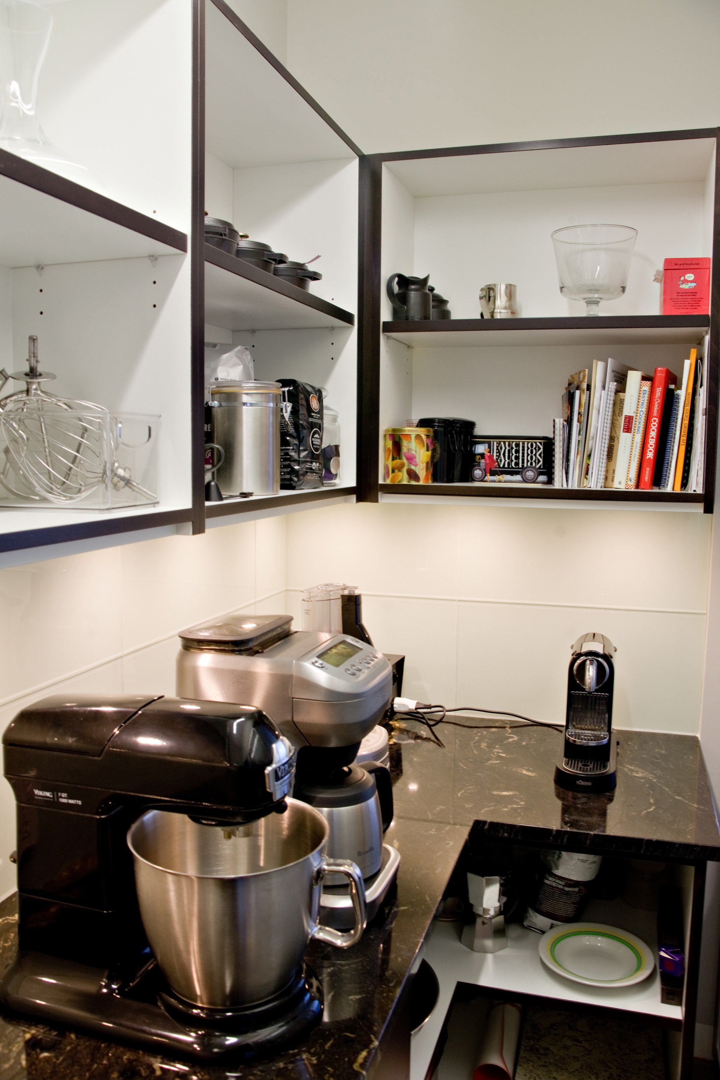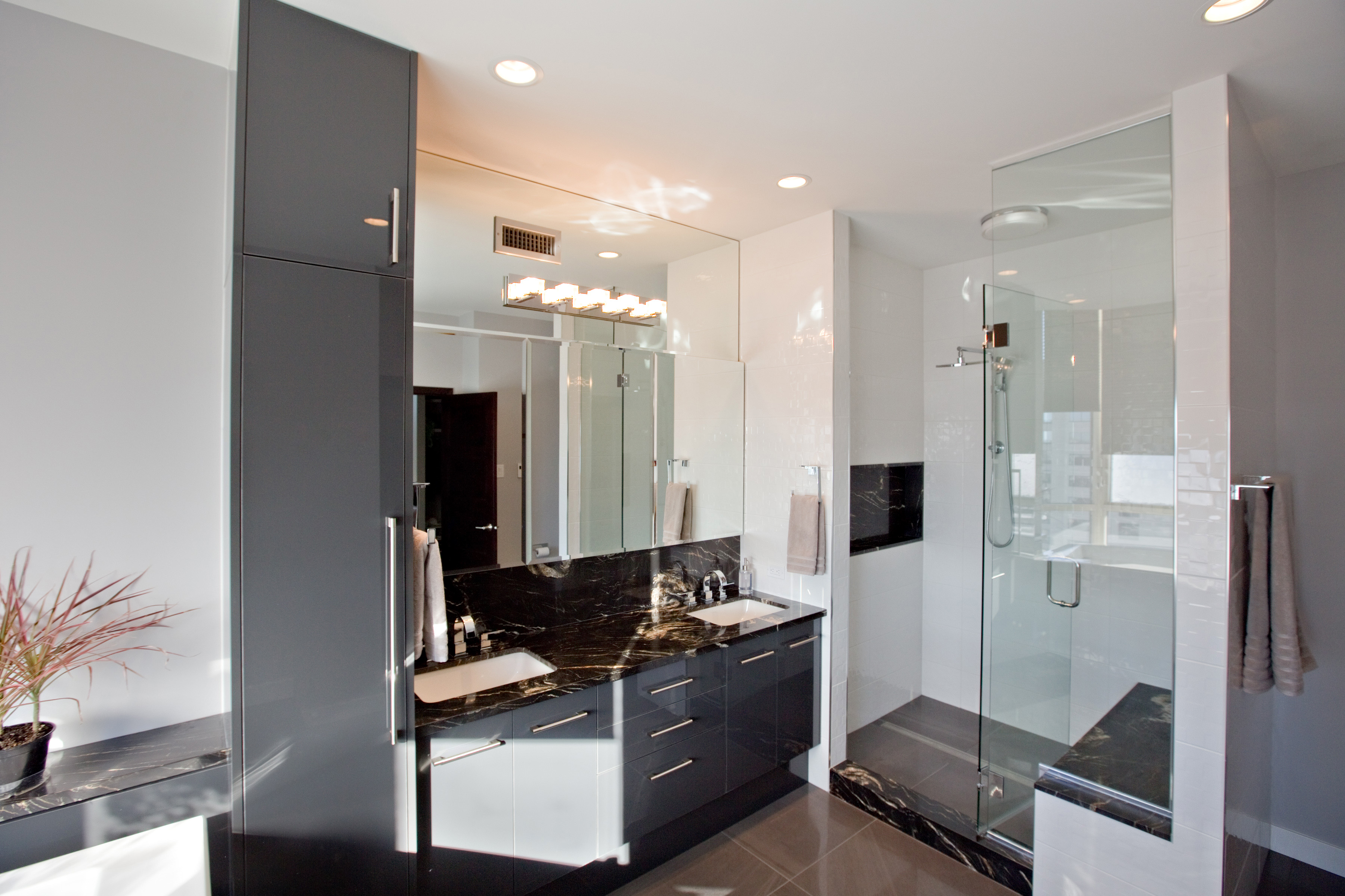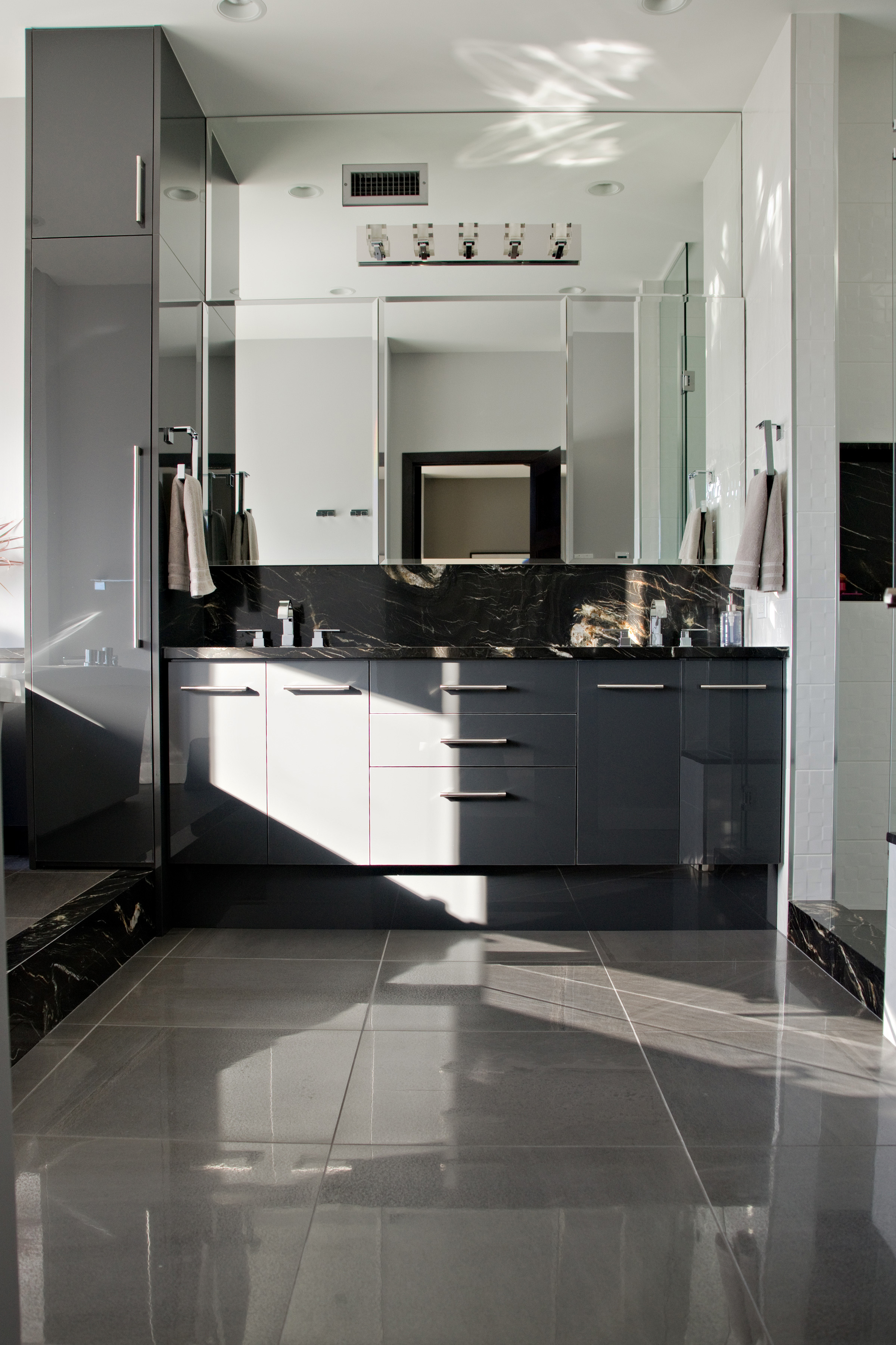 A dated space was extensively renovated to create something truly incredible. No surface was left untouched. The kitchen was opened to the dining room flooding the space with light. A lower granite pastry counter and space to house small appliances is concealed with three telescoping glass doors. The en suite is glammed up with high gloss grey cabinets, 24×24 lappato-finish floor tiles, and stone slabs that look like marble, but are a more-durable granite. When our clients moved onto their next adventure, their condo sold in less than 24 hours setting a record price for 160 Tuxedo Avenue.