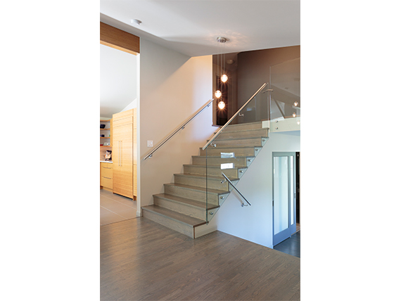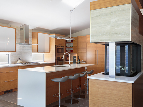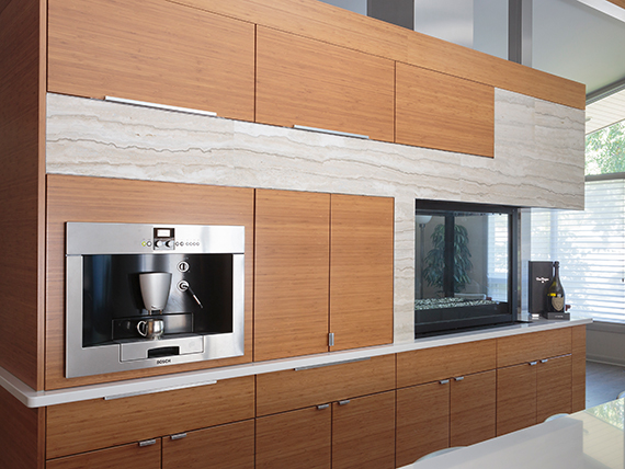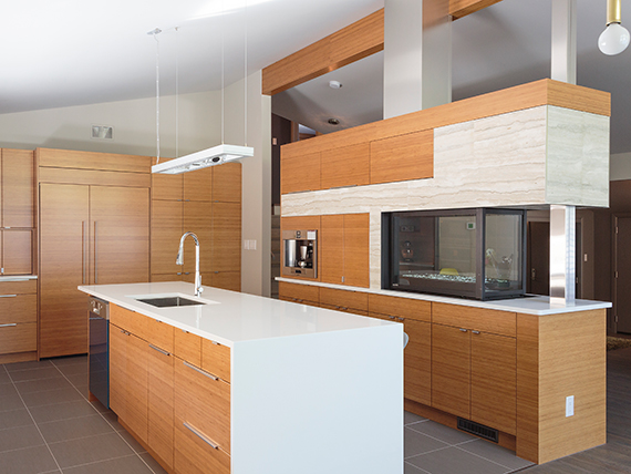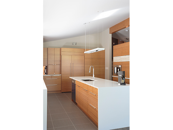 This large family home was segmented, dark and dated. A spectacular kitchen was designed and opened up to the living and dining rooms. The cabinets and large refrigerator are finished with horizontal-grain bamboo; countertops are white engineered quartz with a waterfall edge on the island; and striking natural travertine slabs are featured at the cooktop and fireplace. No surface of this home was left untouched; creating light open spaces in a beautifully layered home.