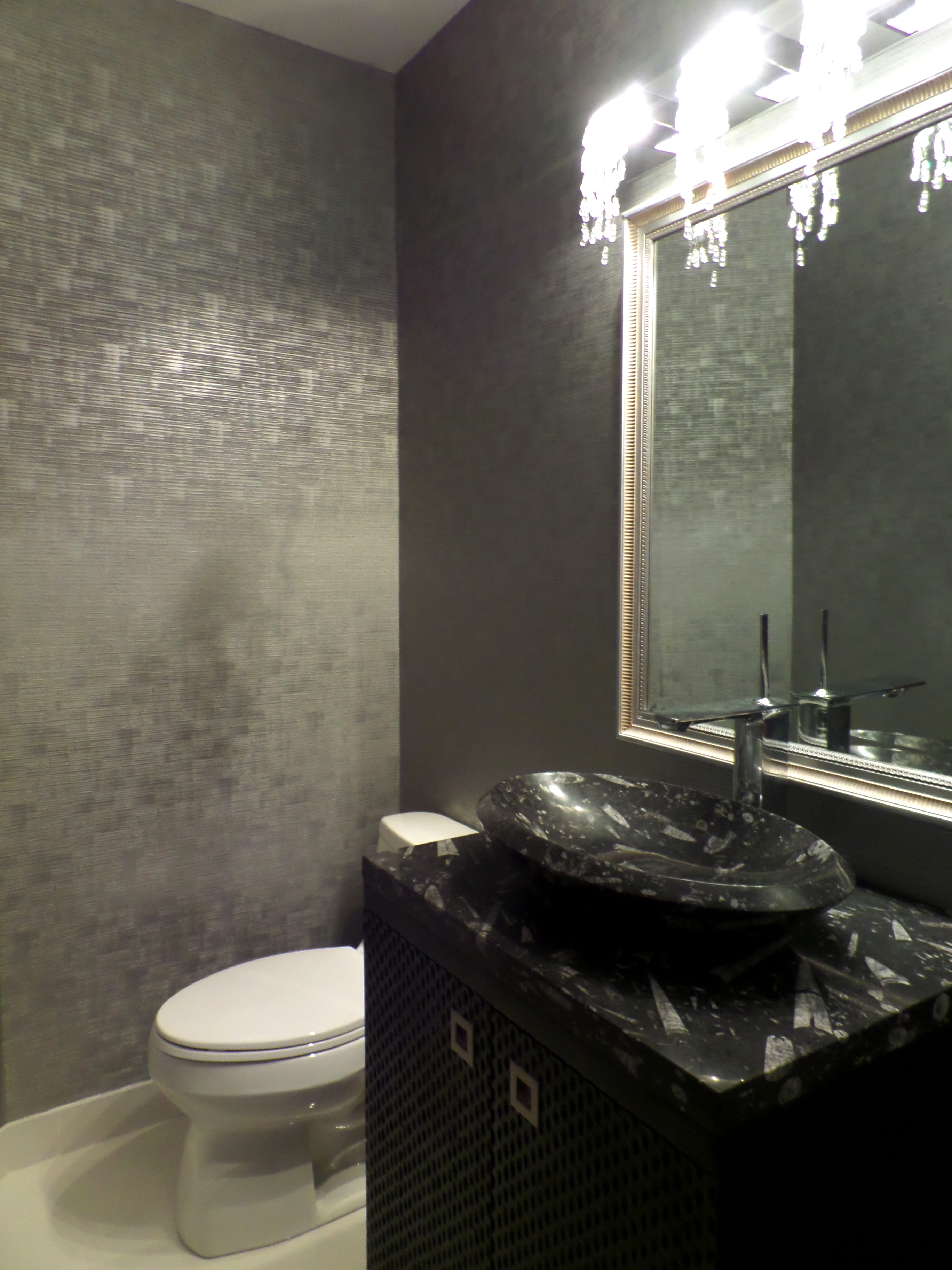 There is no trace of the original kitchen’s traditional design. This now-striking kitchen features black glass cabinets imported from Europe; fully-integrated luxury appliances; white engineered quartz countertops and backsplashes; white, polished porcelain floor tiles; and a linear crystal chandelier.