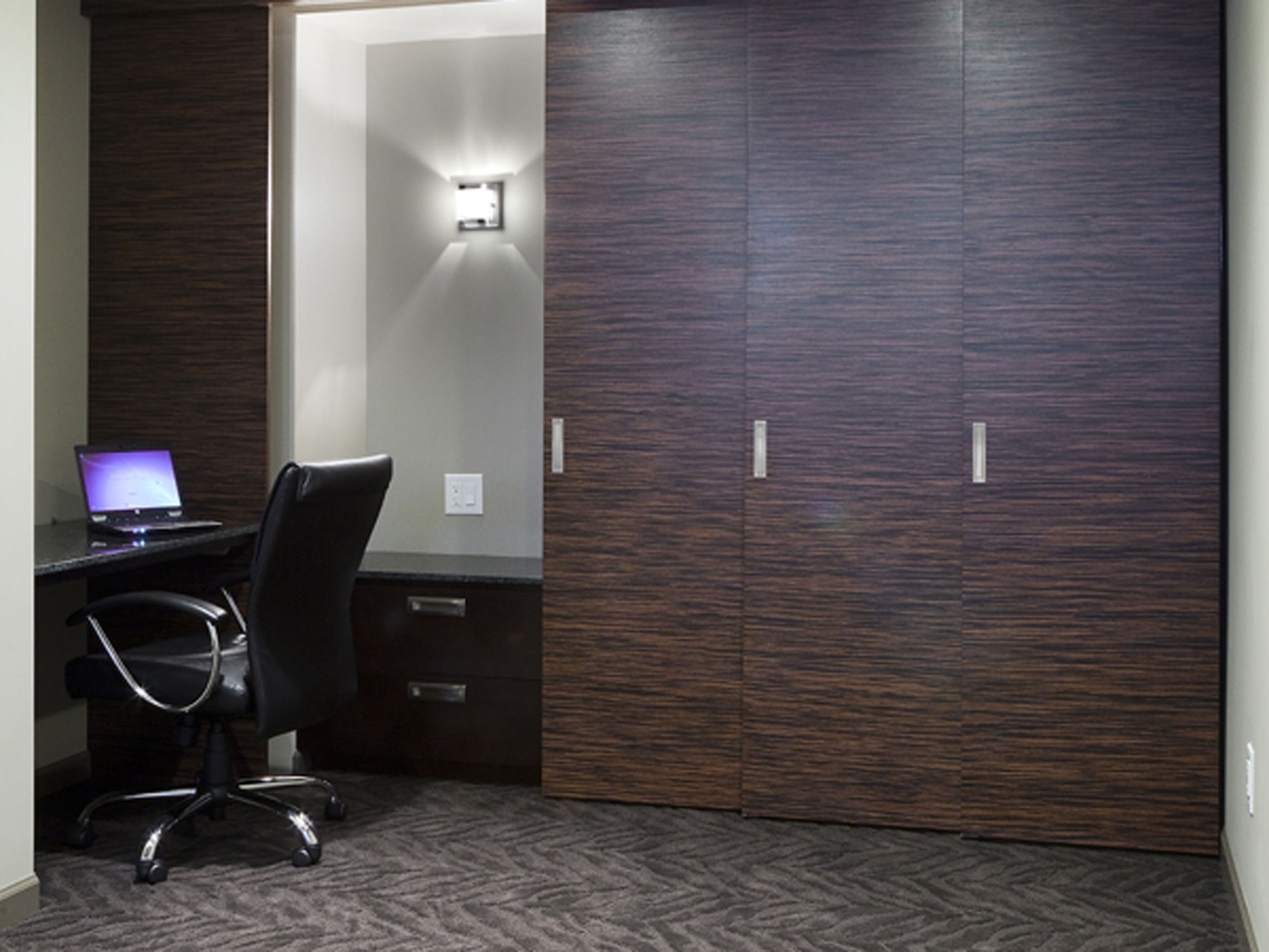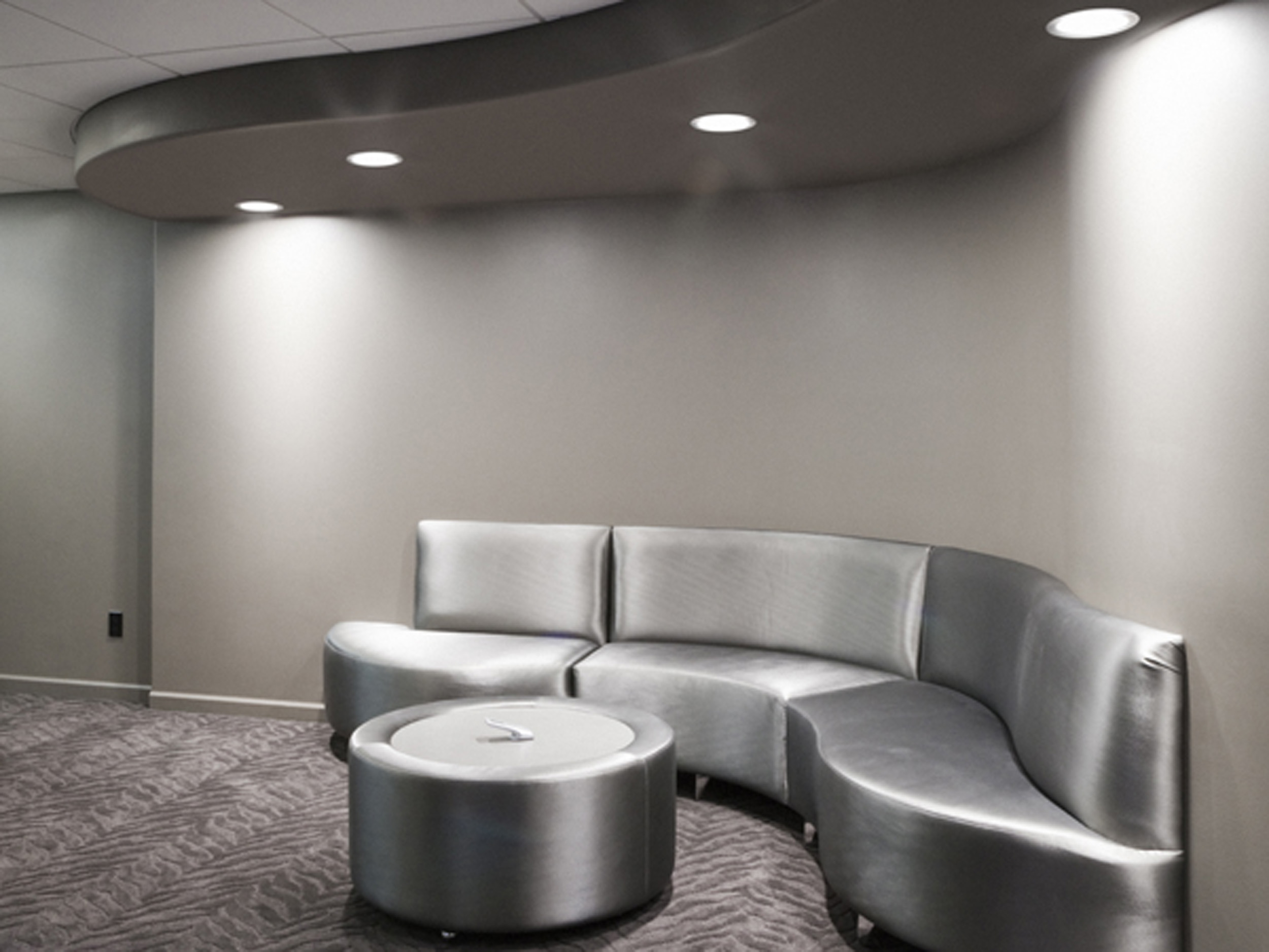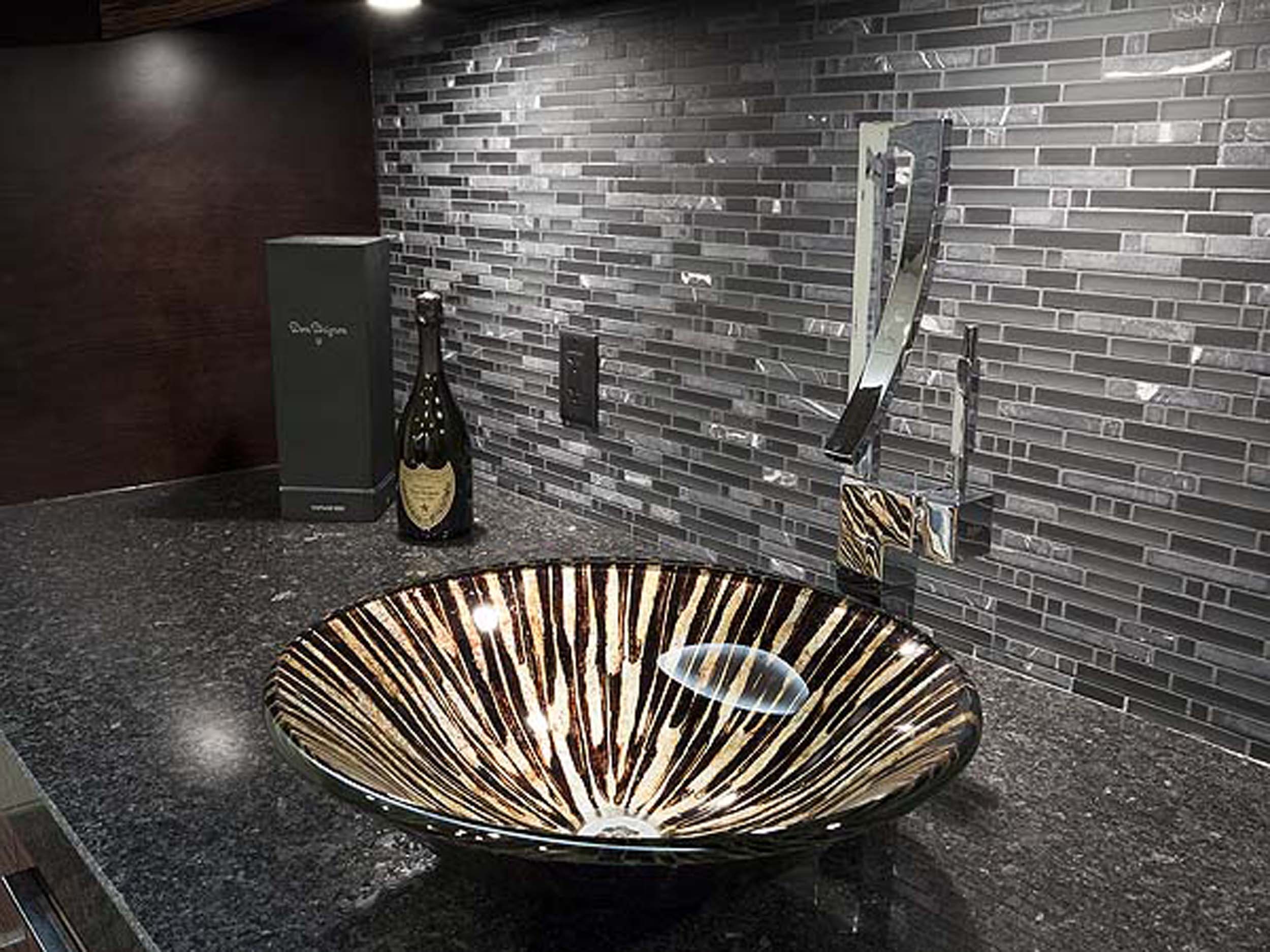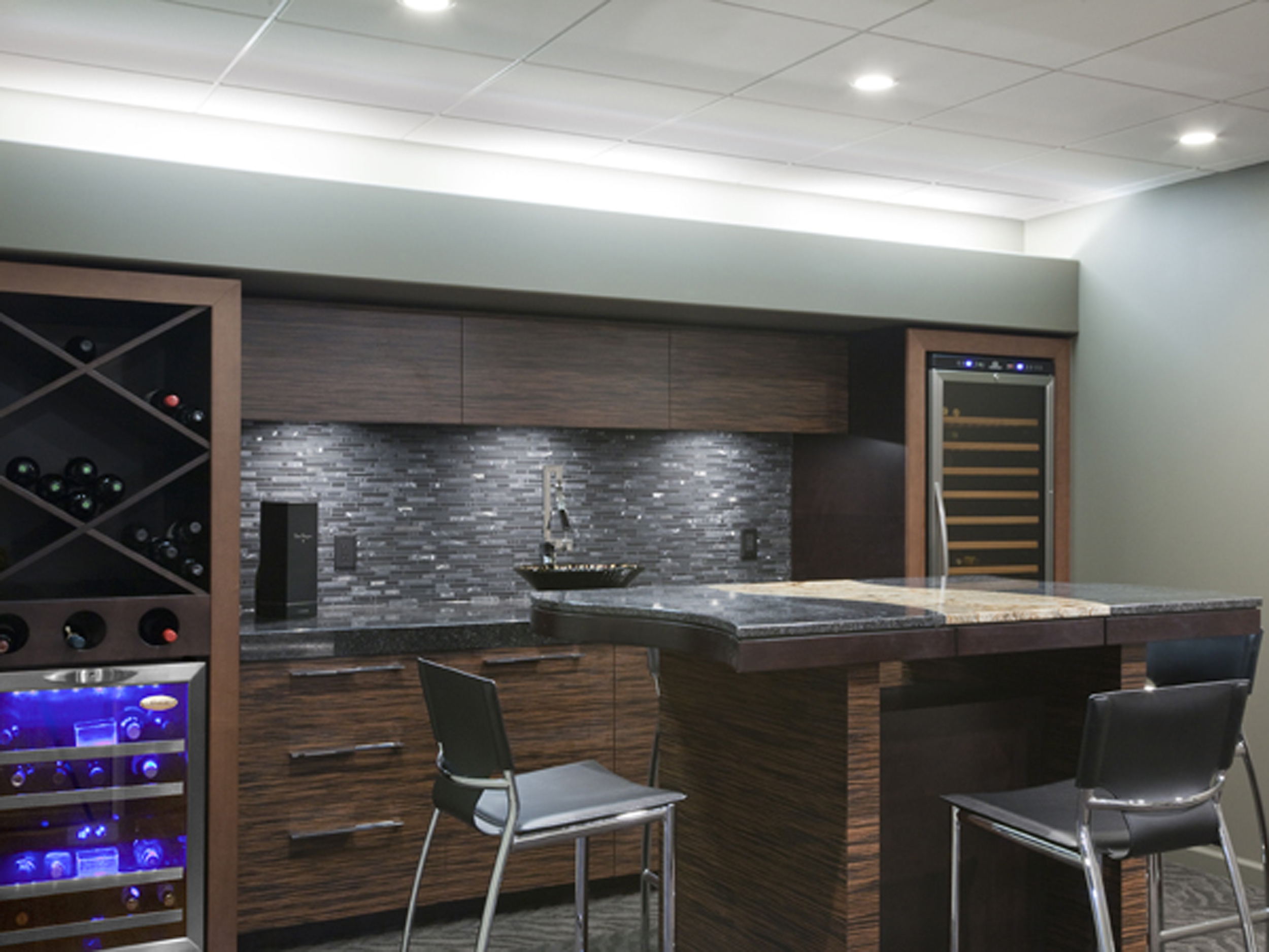 ‘The lower level of this newer residence was developed to provide luxurious entertaining spaces and a study with a wall bed. The bar area houses a large wine cooler, wine rack, beverage cooler and a mobile island. A silver metallic banquette follows the curve of the wall and is topped by a drywall bulkhead. The natural ledgestone surrounding the gas ribbon fireplace is softened by the plush herringbone-pattern carpet; and the spaces are warmed by horizontal-grain zebrawood millwork. Our Park Place basement development project won GOLD in the 2011 Renovation of the Year Awards, MHBA | Manitoba Home Builders’ Association.