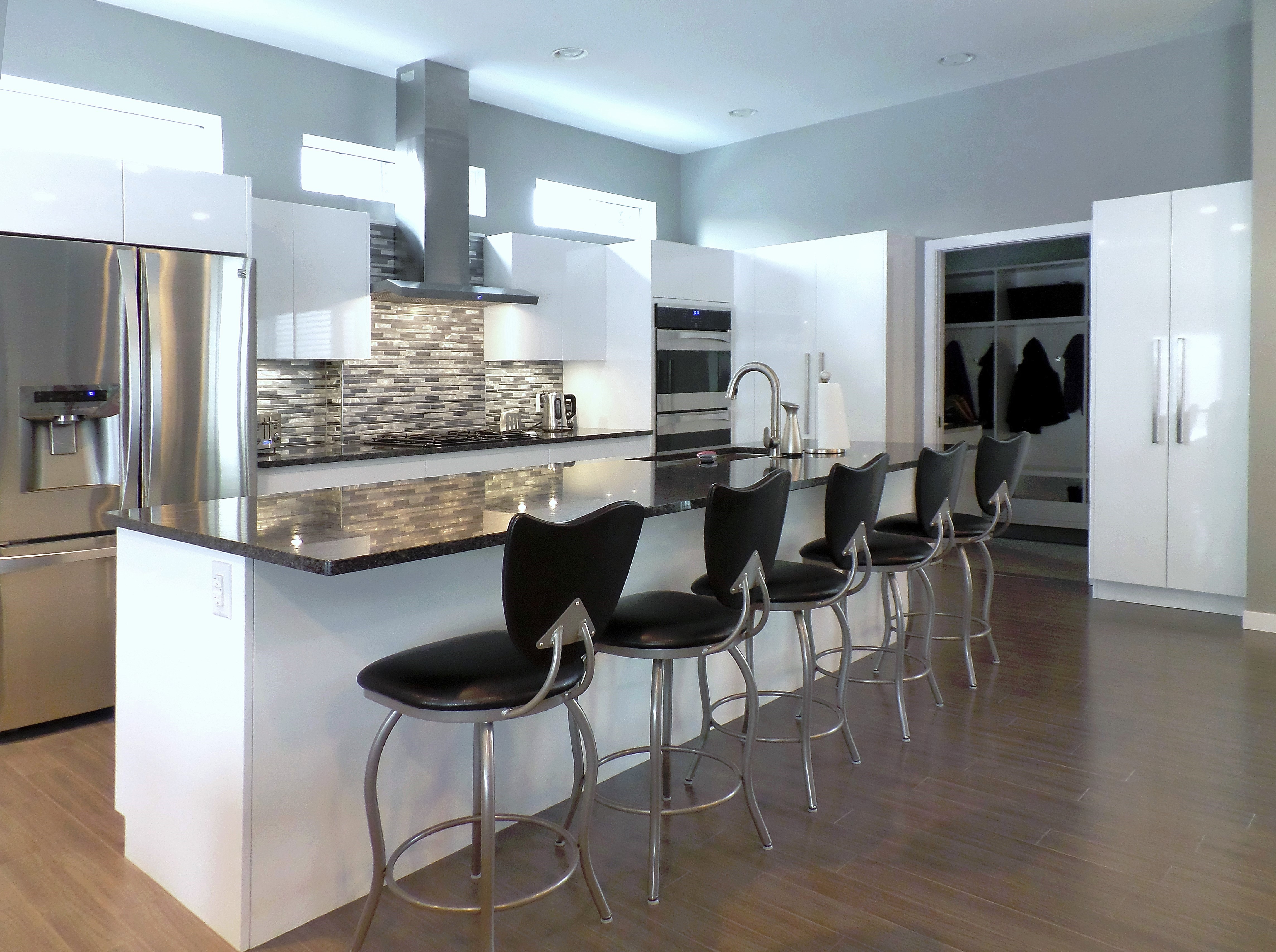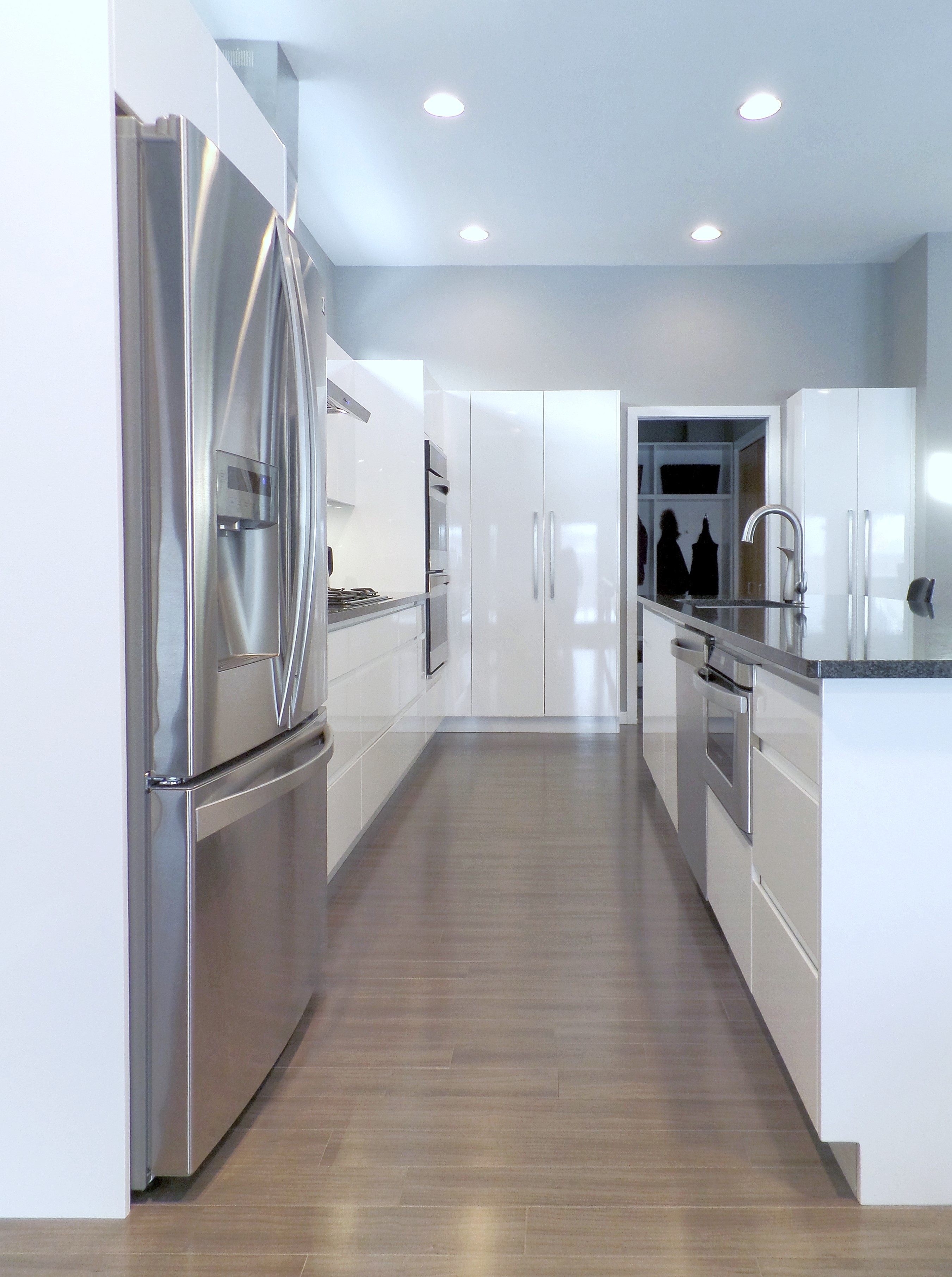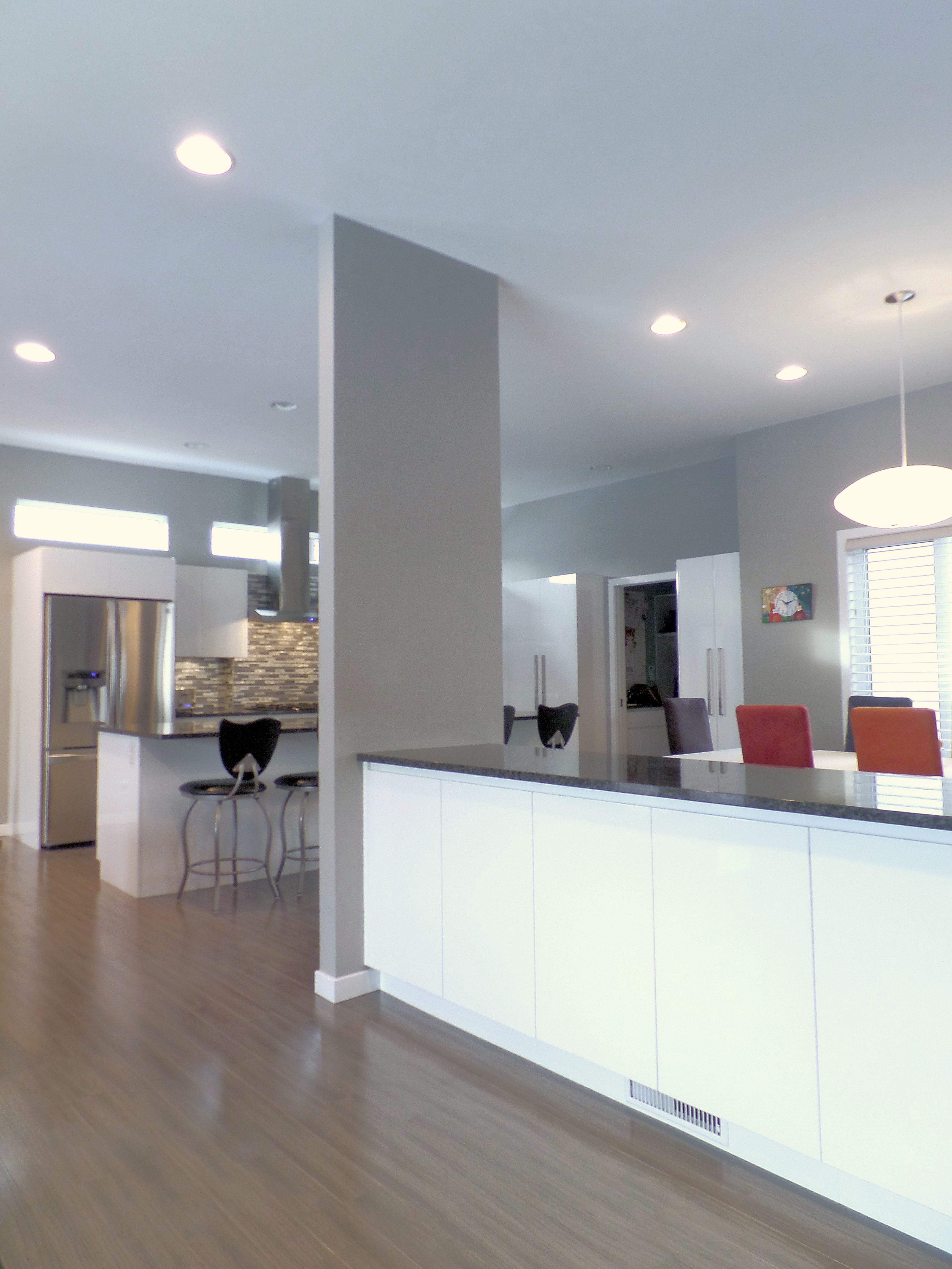 The living area of a Tuxedo home was segmented into several spaces; none large enough to suit this busy family. We reconfigured the space into an open area with spacious kitchen, breakfast, dining and living spaces. Natural light floods the spaces, which are linked with continuous hardwood floors, white cabinetry and dark engineered quartz countertops. This project was featured in the Winter 2014 issue of Covet Magazine pp. 30-34.