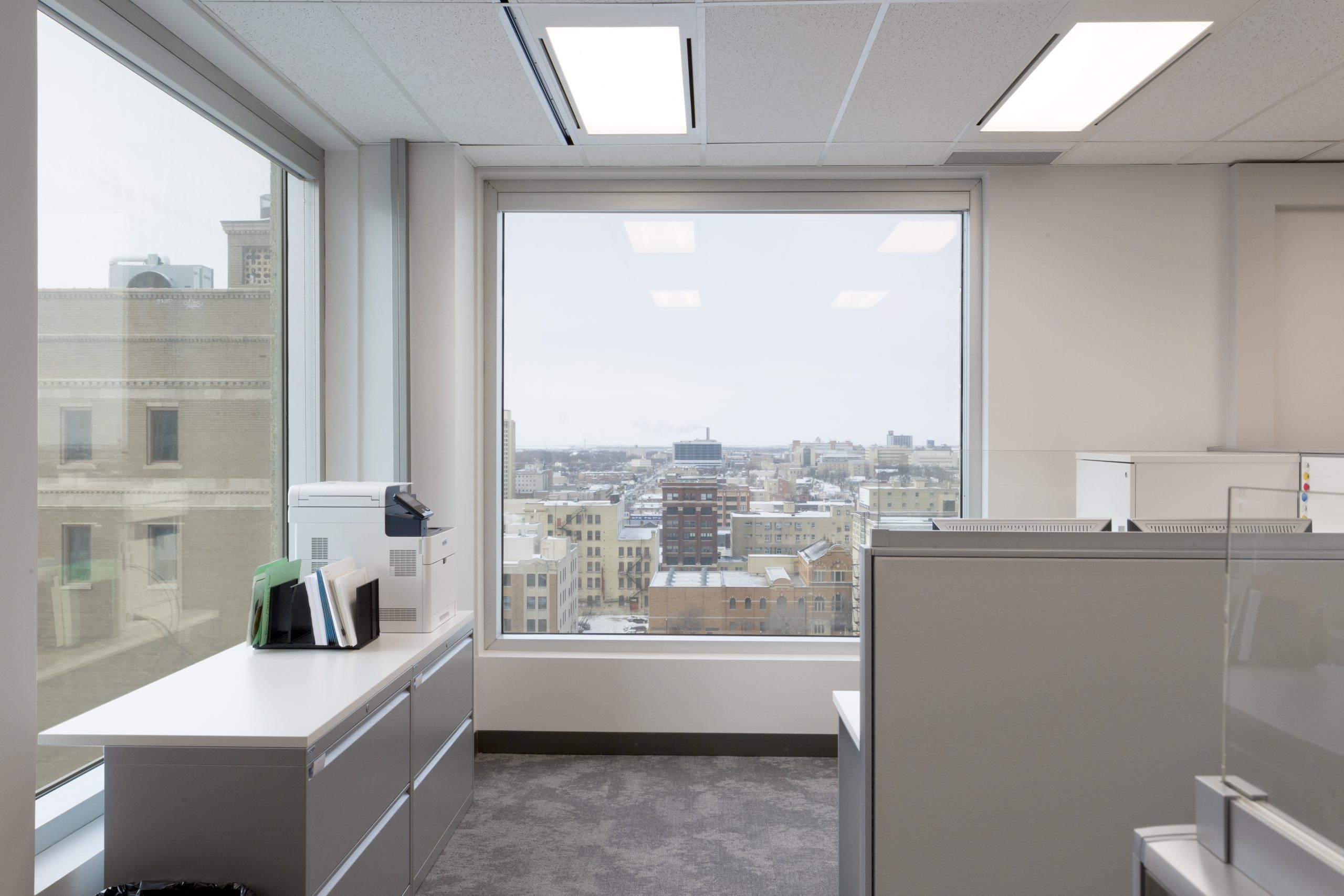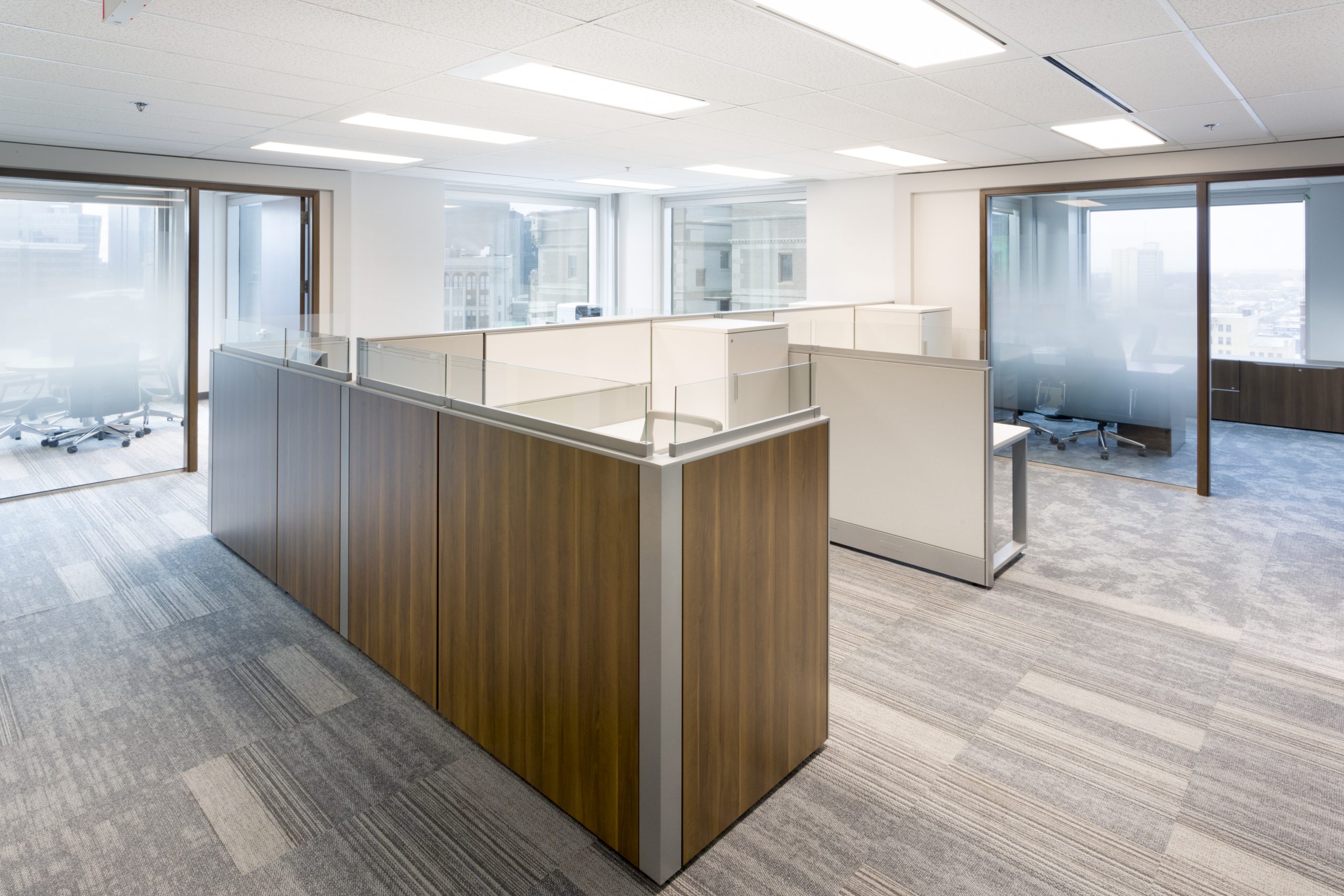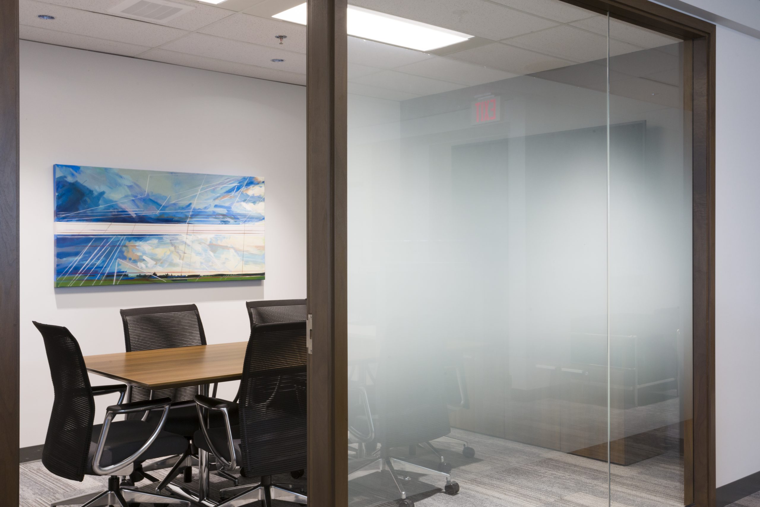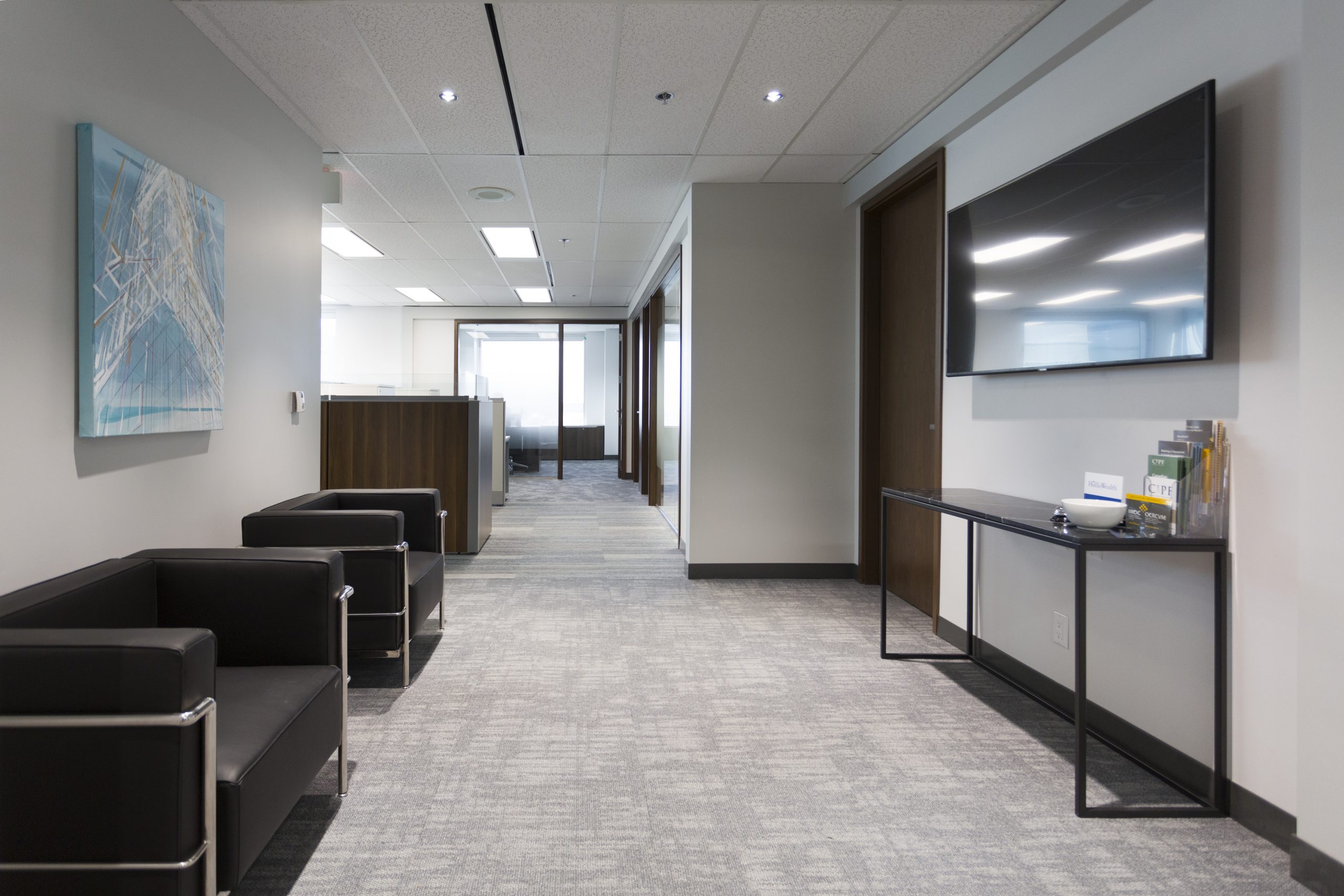 Wealth Management with A View: You would not think that a corner office on the 11th floor could be dark. However, our client took over a 1900 s.f. space at the city’s #1 business address, where the private offices monopolized all of the light, and the dated furnishings and finishes added to the gloom. Reconfiguring the space maintained 3 windowed offices, added a meeting room and flooded the open office area with light. Large panels of glass share light, while graduated glazing film provides some privacy. New furniture, with clean lines and finishes, modernizes the space. Carpet tile in three coordinating styles is practical and adds pattern. White walls add further brightness as they contrast with the walnut wood doors and furniture. Beautiful artwork by Winnipeg’s Michel Saint Hilaire, adds color and interest. Move-in was December 2019.