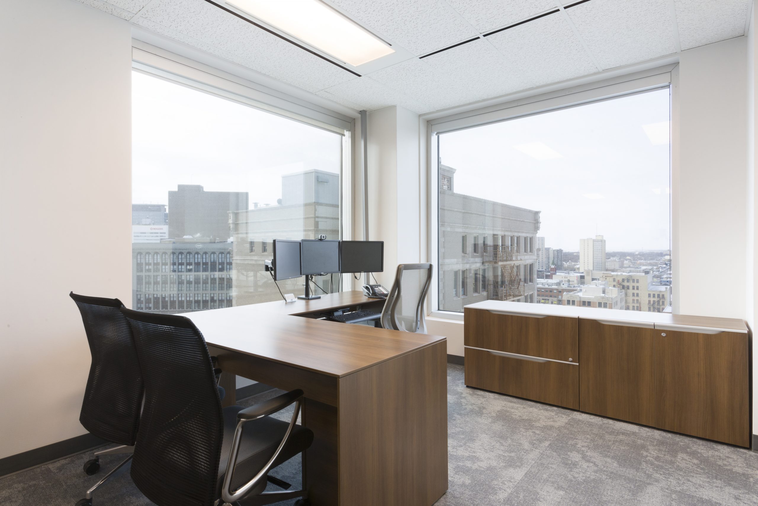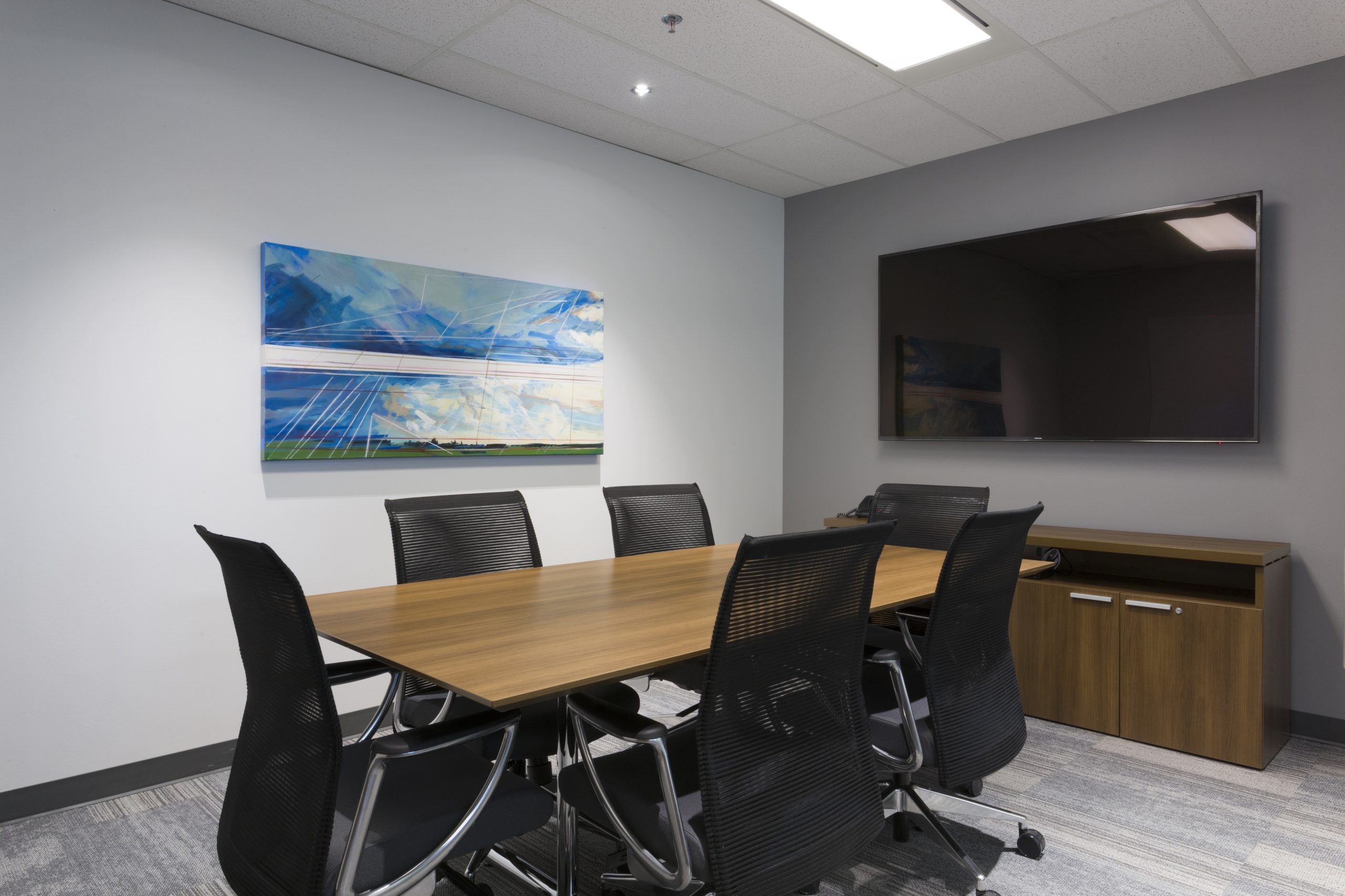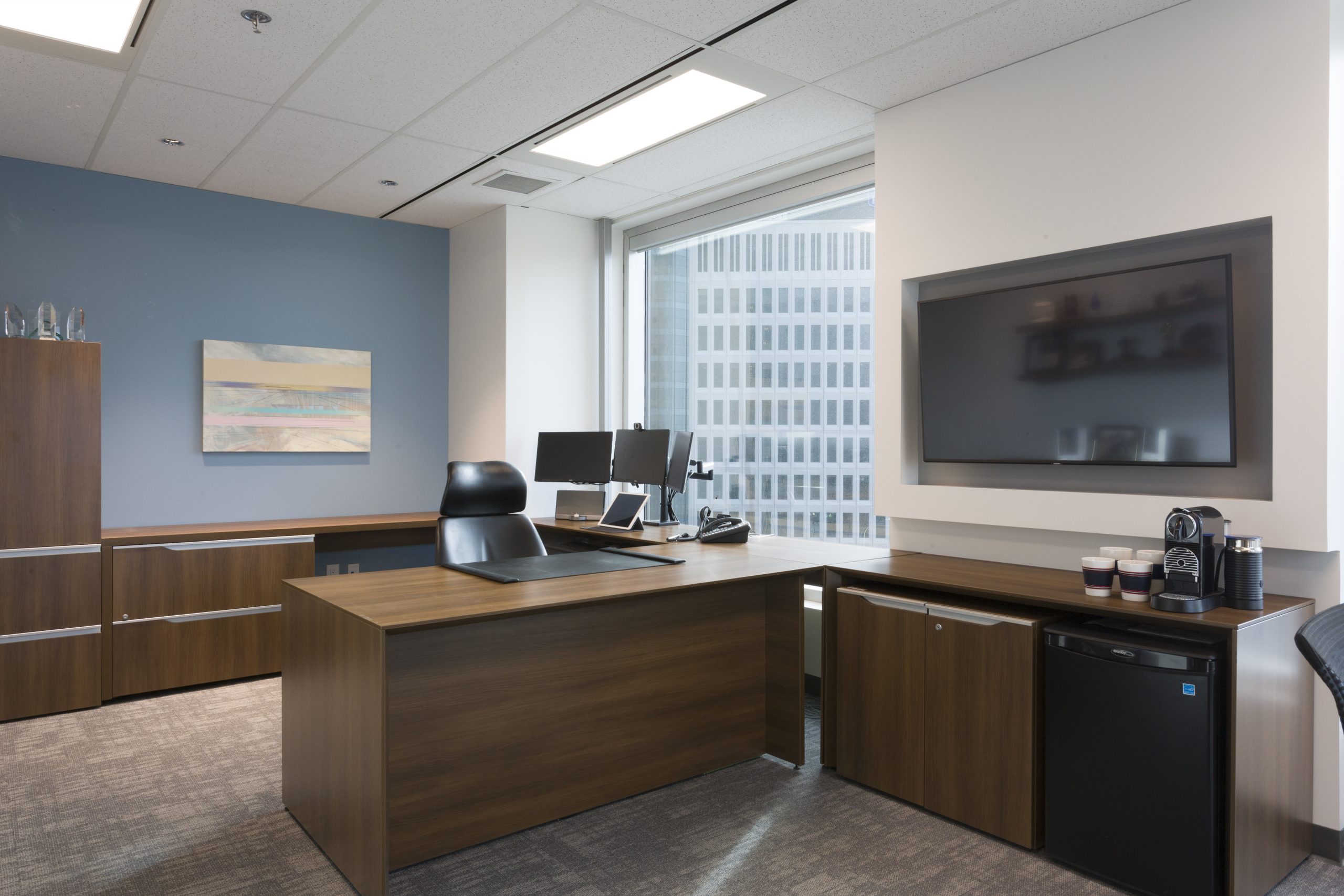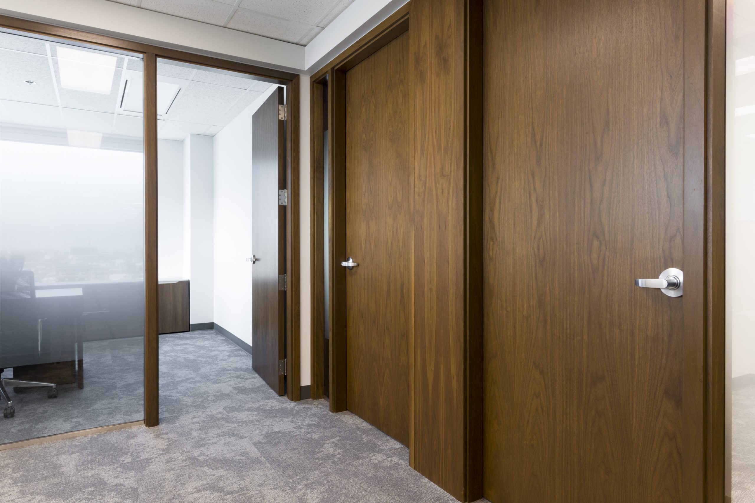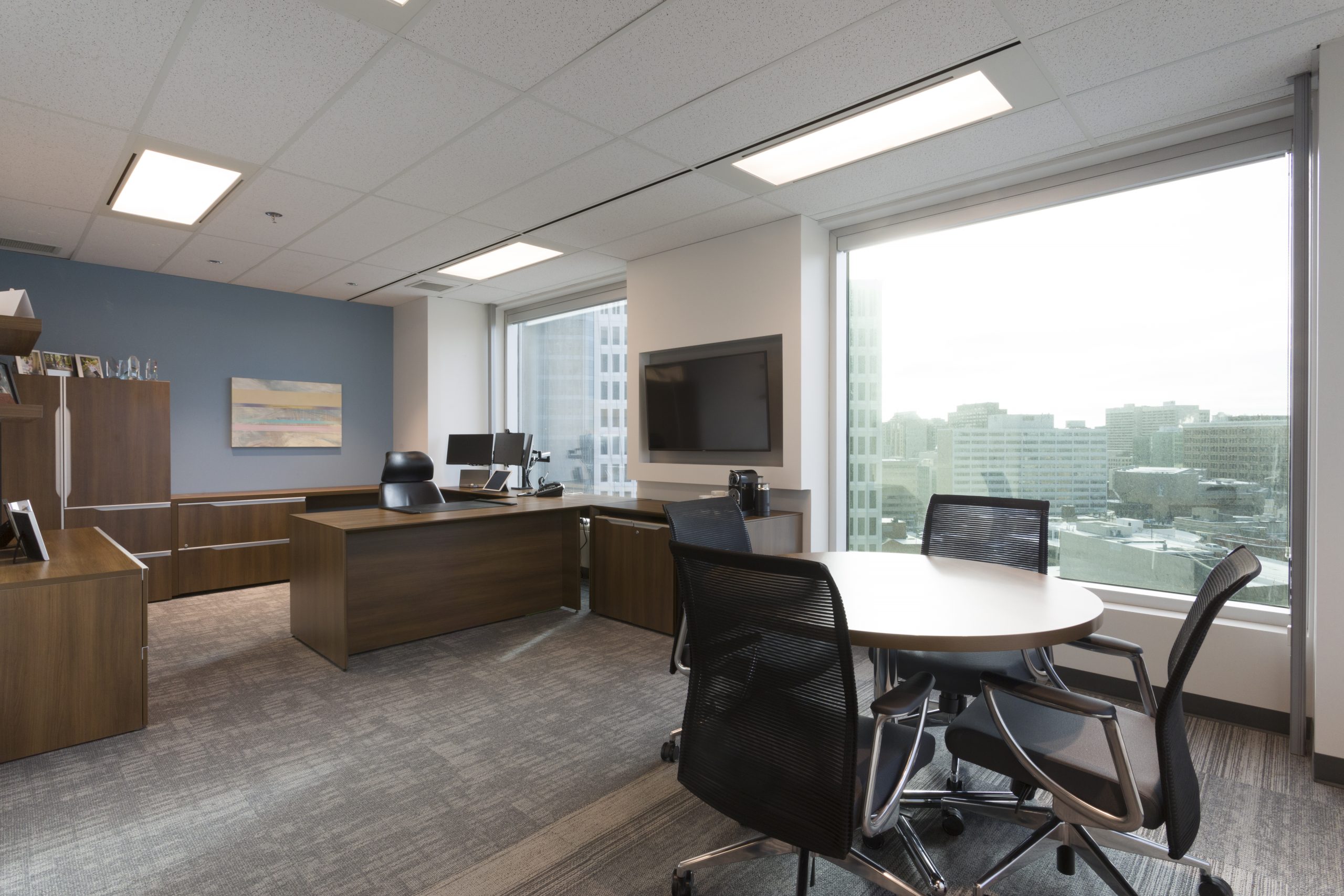Wealth Management with A View: You would not think that a corner office on the 11th floor could be dark. However, our client took over a 1900 s.f. space at the city’s #1 business address, where the private offices monopolized all of the light, and the dated furnishings and finishes added to the gloom. Reconfiguring the space maintained 3 windowed offices, added a meeting room and flooded the open office area with light. Large panels of glass share light, while graduated glazing film provides some privacy. New furniture, with clean lines and finishes, modernizes the space. Carpet tile in three coordinating styles is practical and adds pattern. White walls add further brightness as they contrast with the walnut wood doors and furniture. Beautiful artwork by Winnipeg’s Michel Saint Hilaire, adds color and interest. Move-in was December 2019.