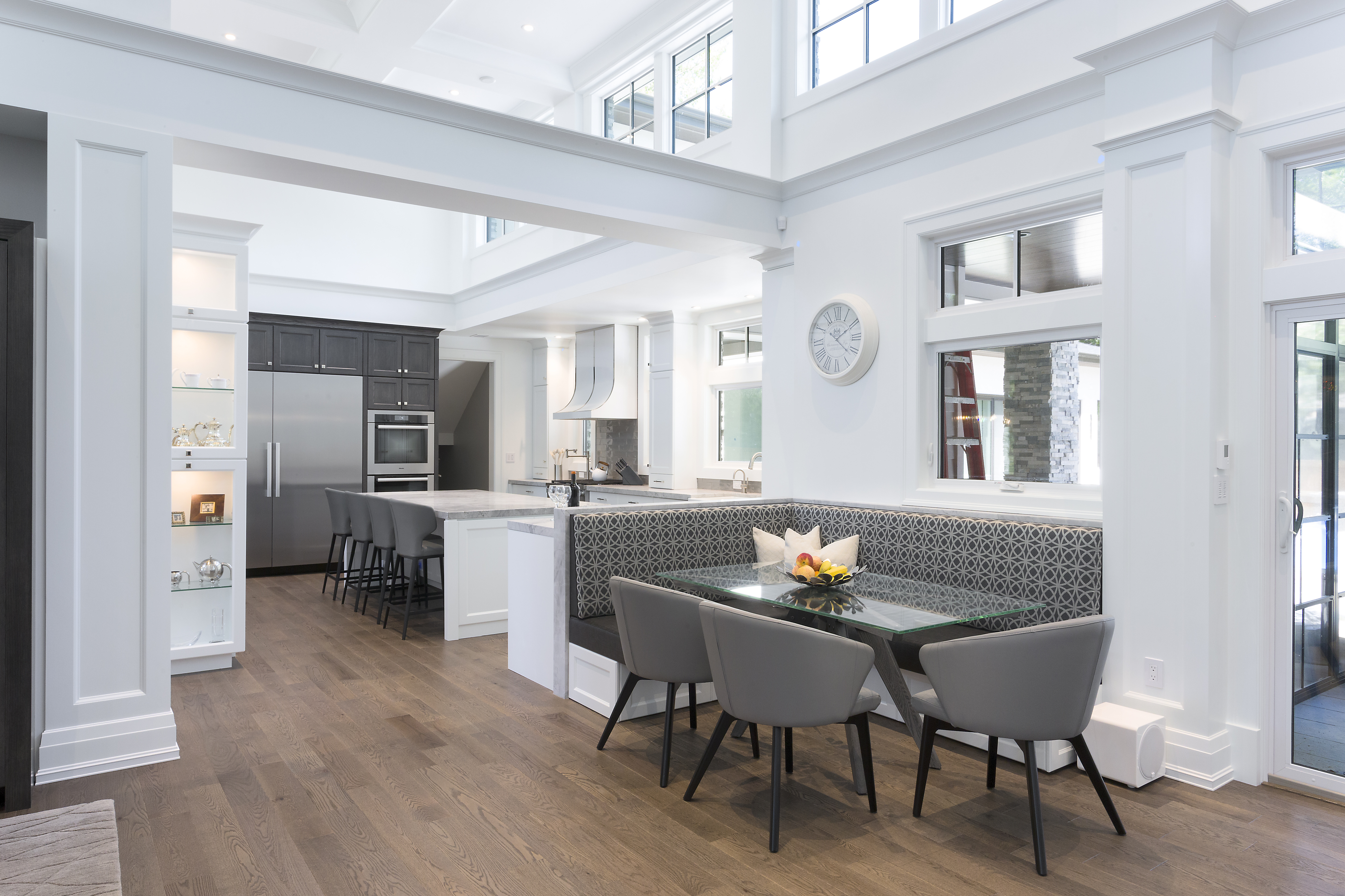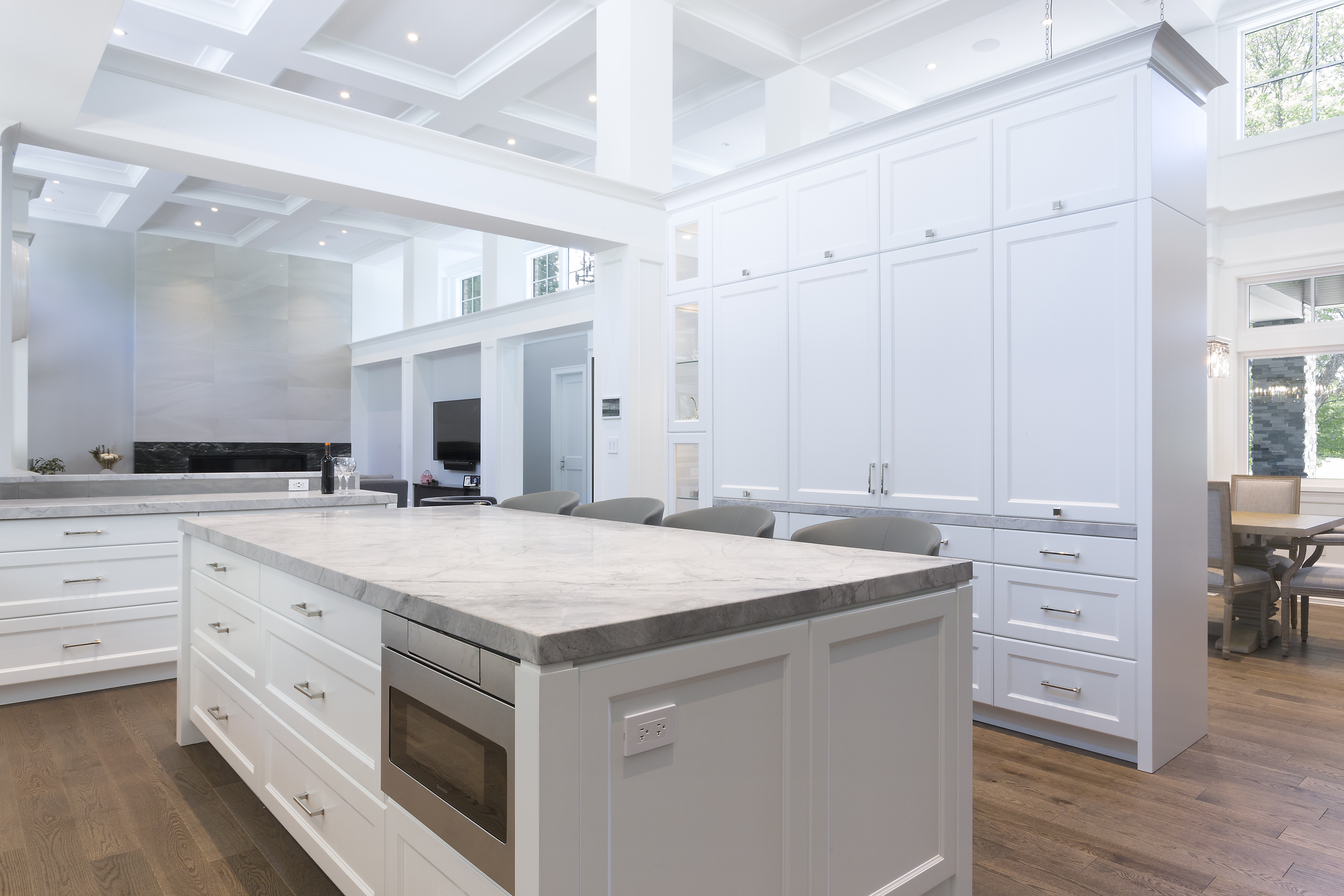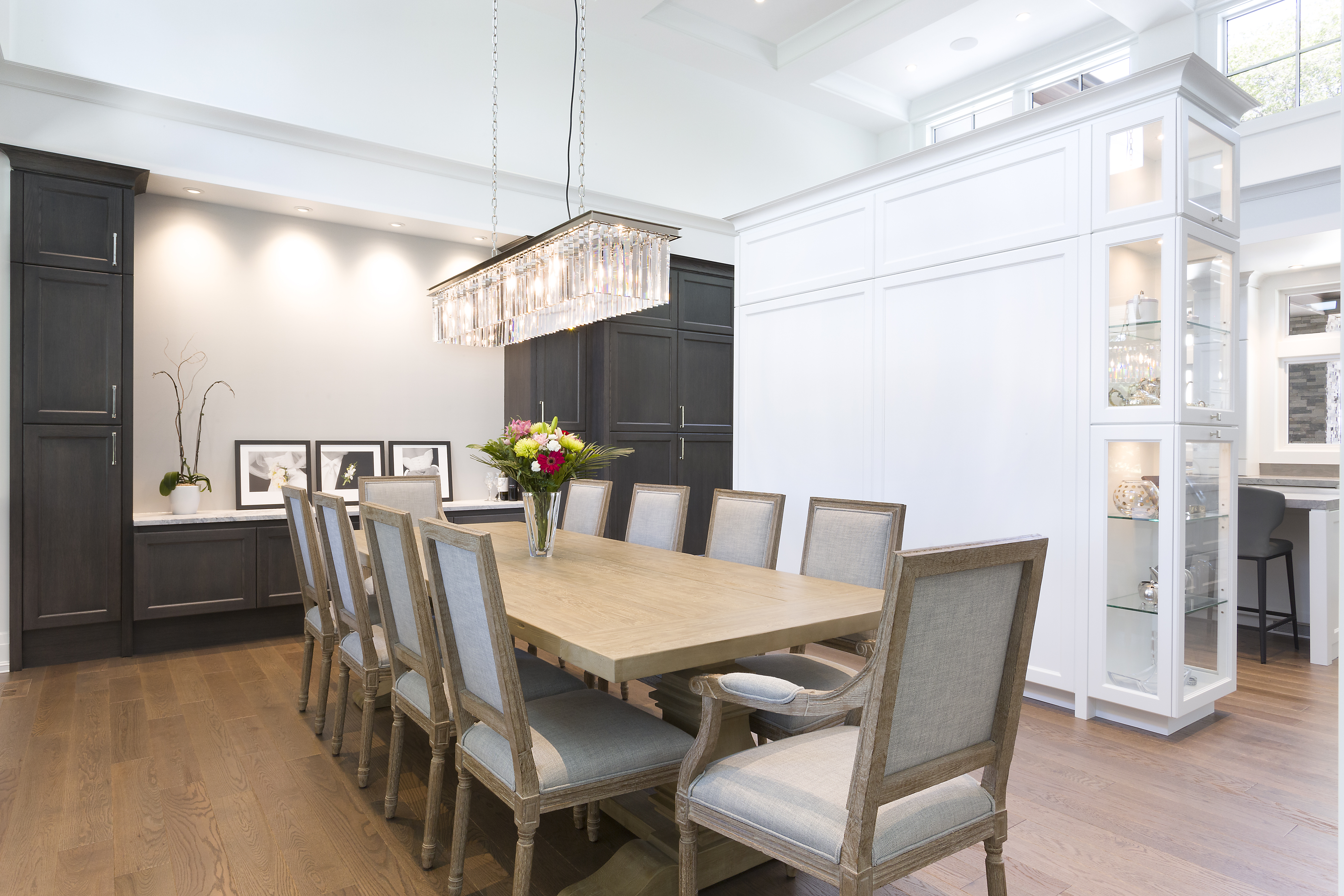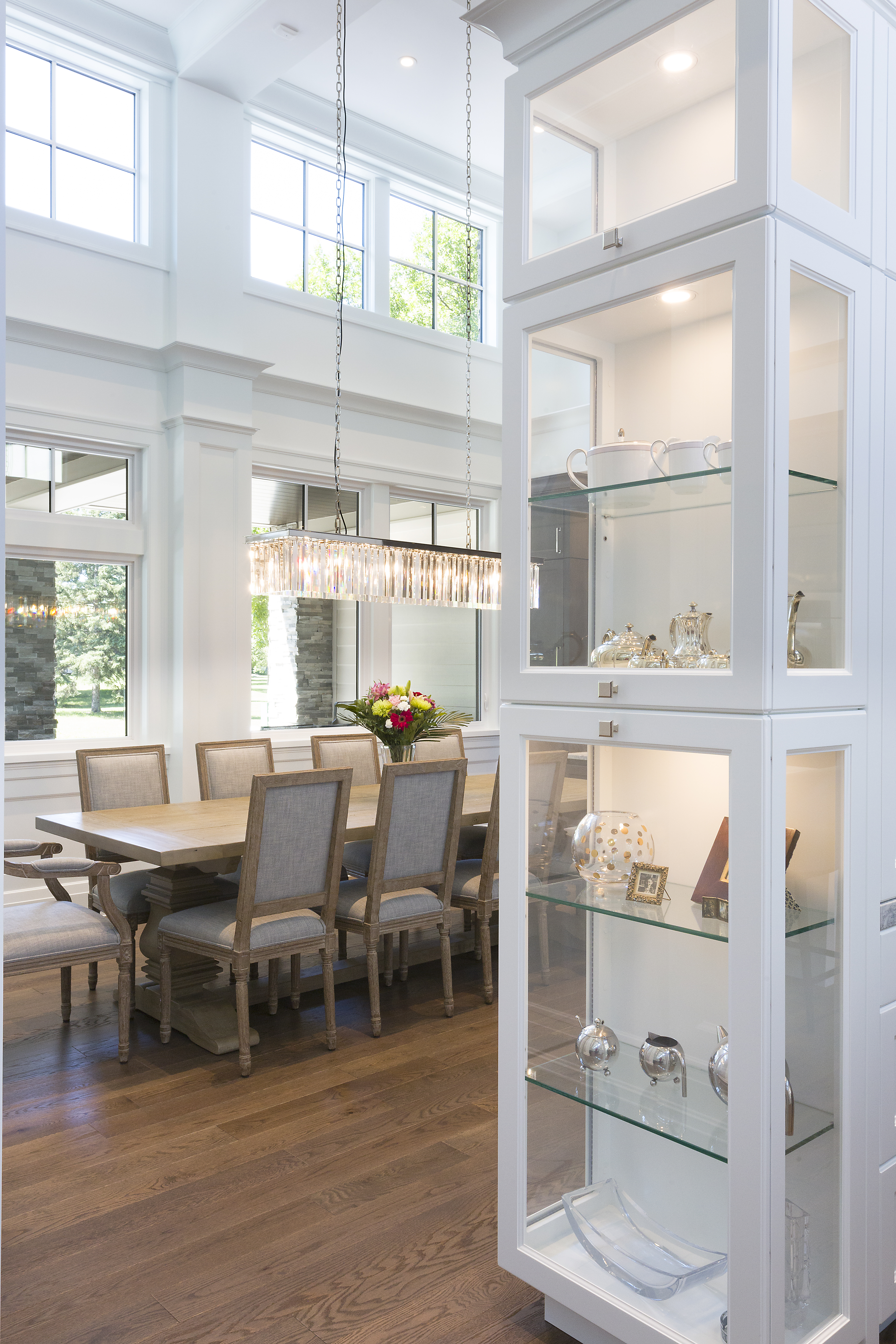 With their children in middle school, our clients wanted a larger home with more space to entertain. They wanted a transitional style with some modern elements. All spaces were to be efficient and clutter-free, with plenty of storage space. It was to be elegant, stately and luxurious; yet durable and easy to maintain. They wanted a home that was cozy and comfortable for their family; yet light, open and spacious. Main floor spaces are delineated by a grid of columns and beams, and highlighted by large pendant lights. We detailed the white woodwork, selecting stock moldings to avoid the upcharge of custom. All floor tile is stone-look porcelain, to provide the glamour of natural stone with ease of maintenance. Engineered hardwood flooring was on the must-have list. The matt finish will help to conceal wear.