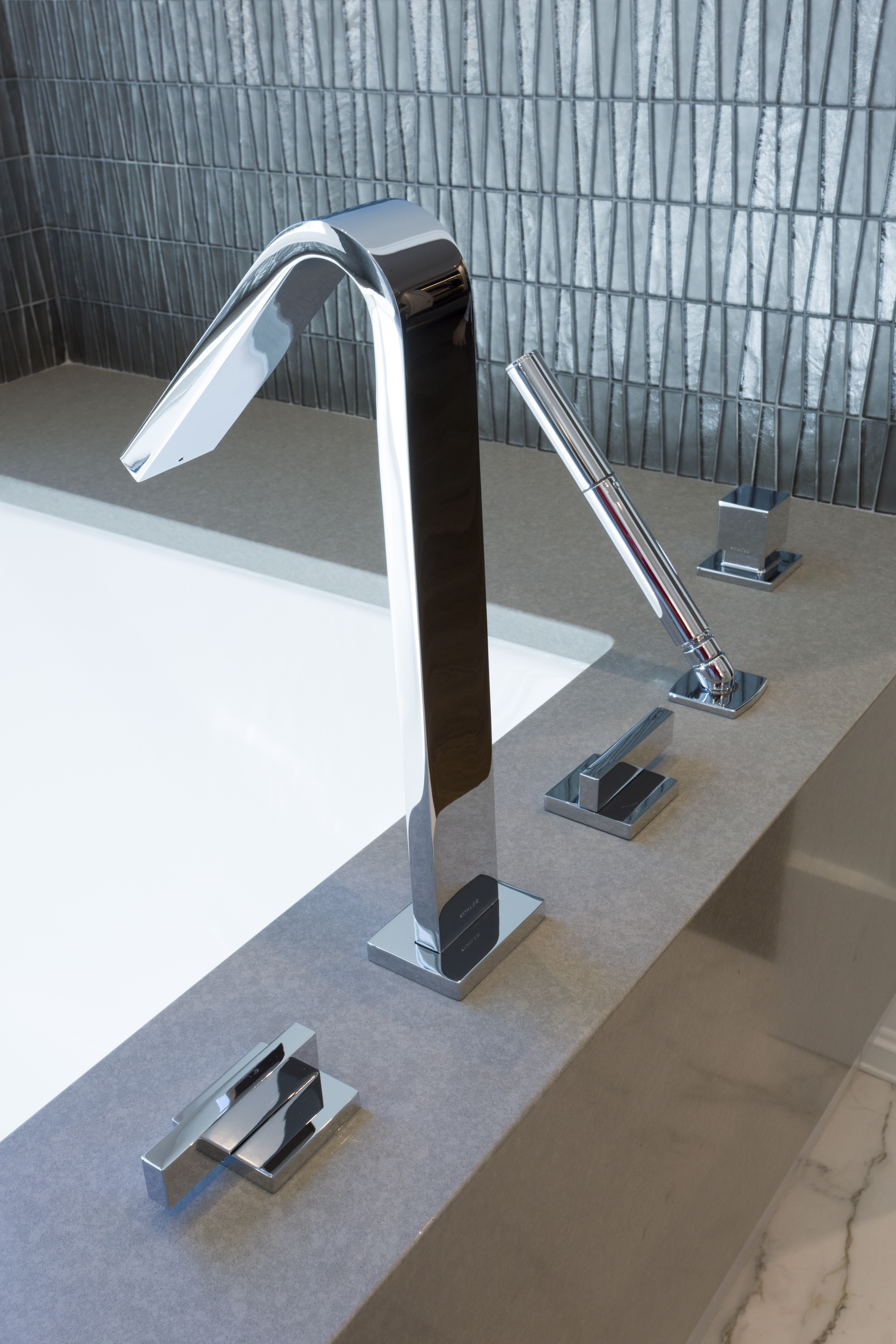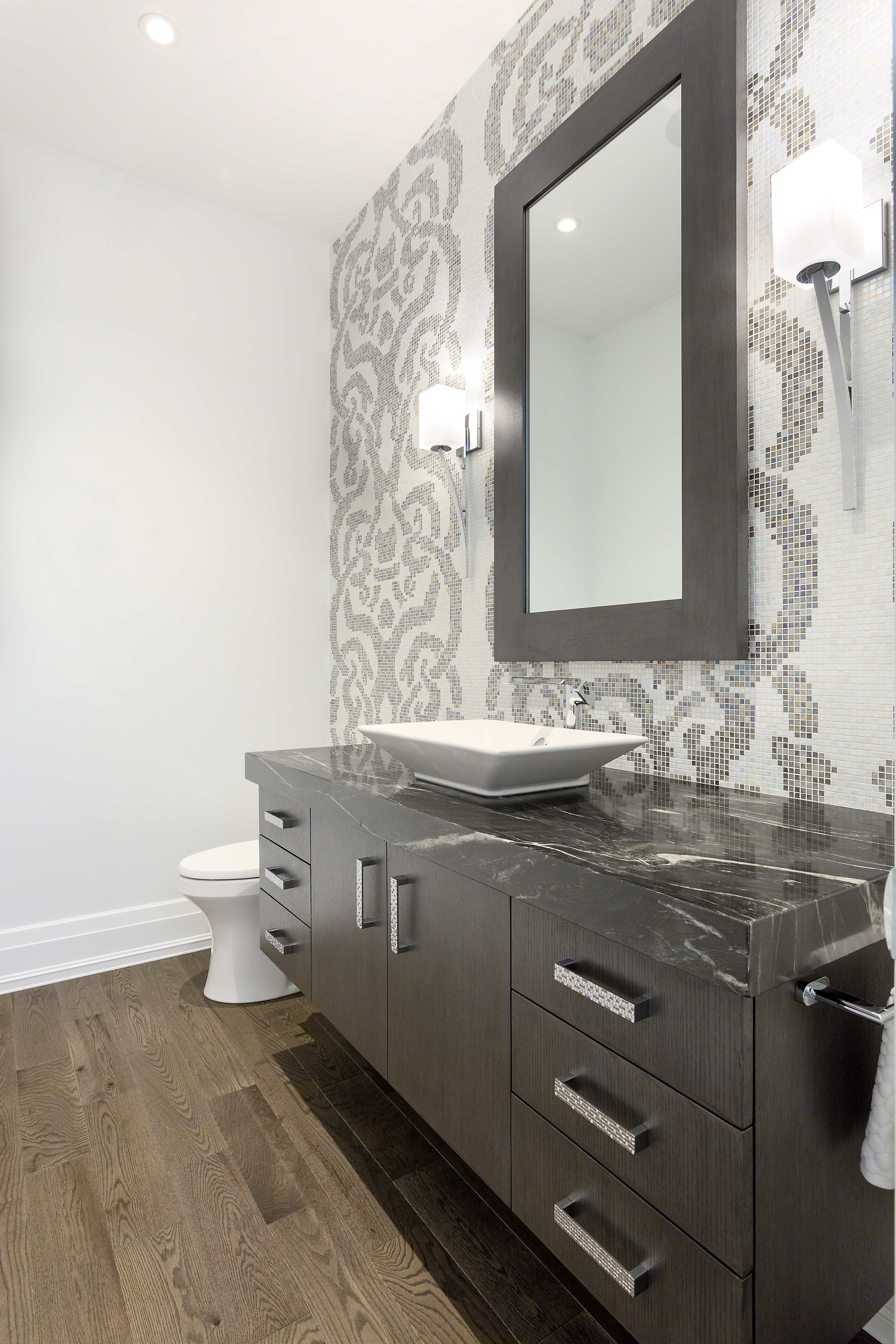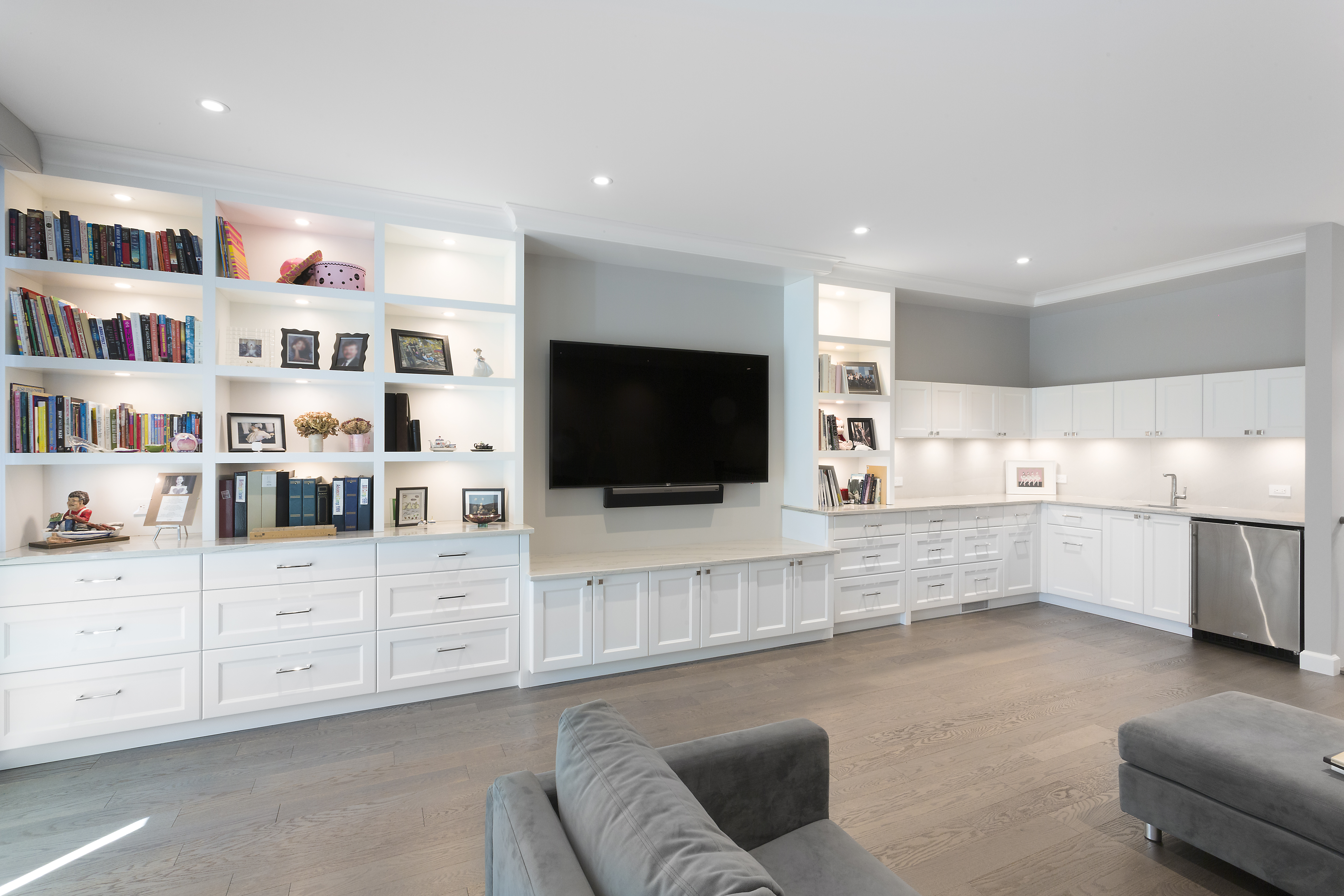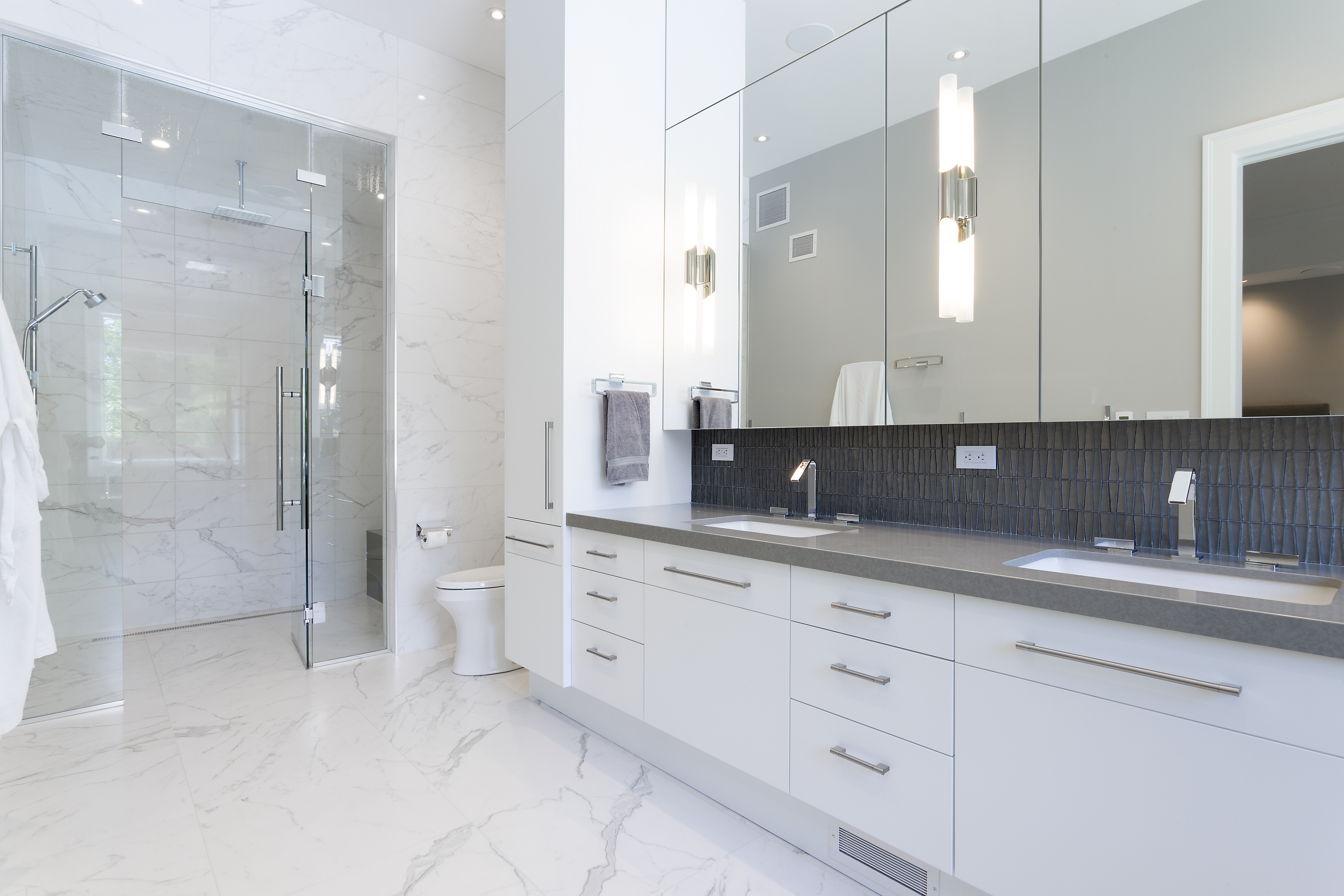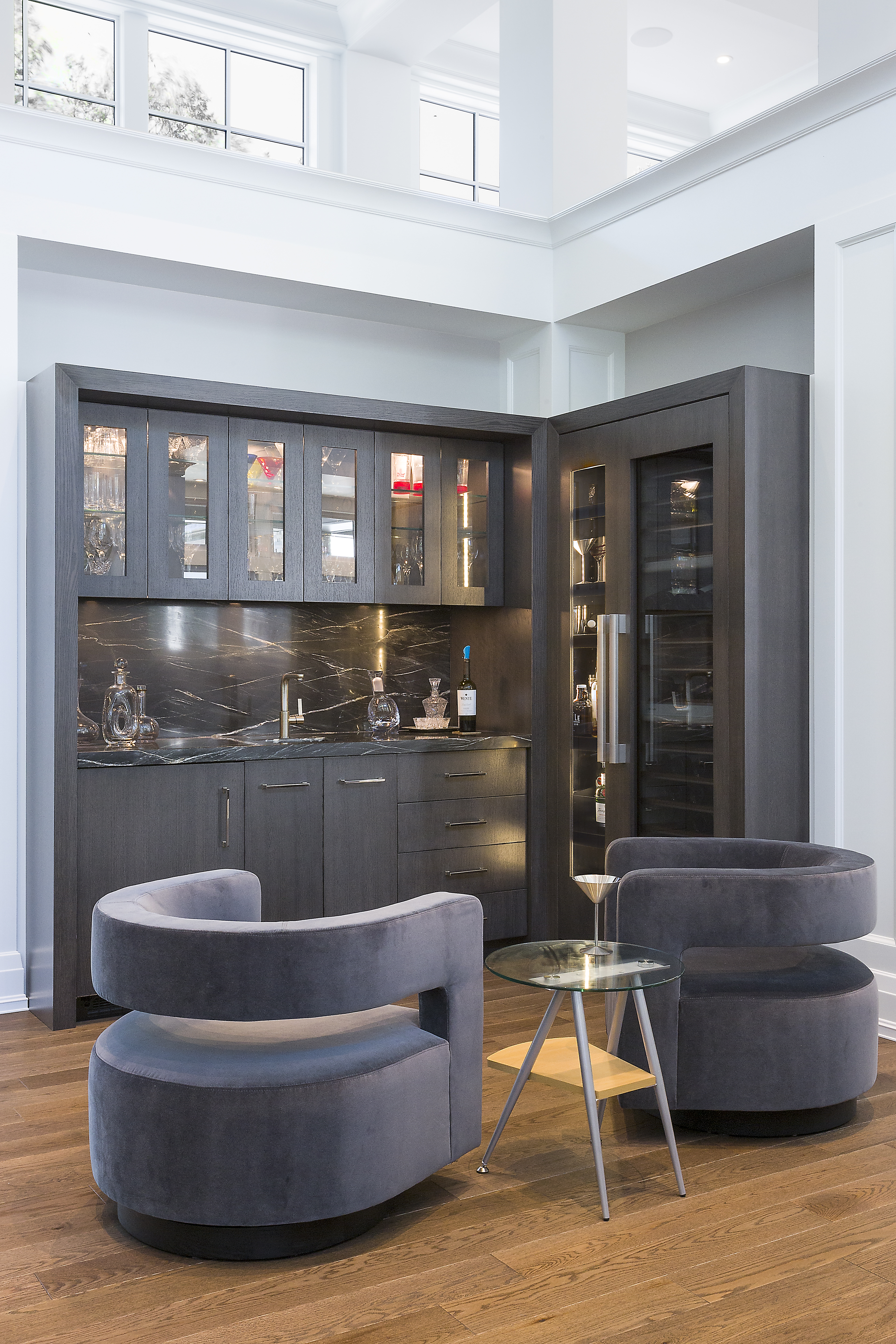 With their children in middle school, our clients wanted a larger home with more space to entertain. They wanted a transitional style with some modern elements. All spaces were to be efficient and clutter-free, with plenty of storage space. It was to be elegant, stately and luxurious; yet durable and easy to maintain. They wanted a home that was cozy and comfortable for their family; yet light, open and spacious. Main floor spaces are delineated by a grid of columns and beams, and highlighted by large pendant lights. We detailed the white woodwork, selecting stock moldings to avoid the upcharge of custom. All floor tile is stone-look porcelain, to provide the glamour of natural stone with ease of maintenance. Engineered hardwood flooring was on the must-have list. The matt finish will help to conceal wear.