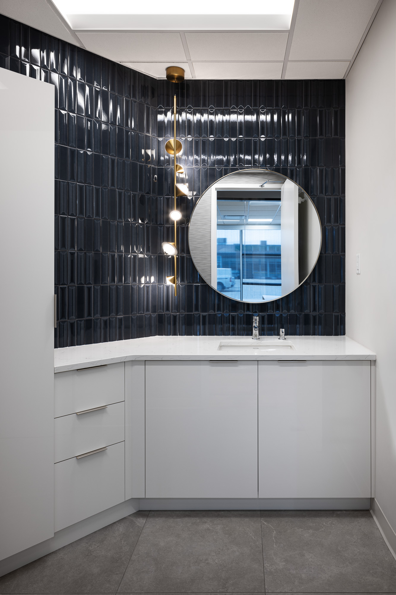 Clean, classic white walls, furniture and ceilings ensure the space is bright and airy. Engineered maple hardwood adds warmth and pattern, and is conducive to this low-traffic office. The staff entry and storage areas were finished with LVT. The washrooms have 24×24 porcelain tile floors. The beverage bar and coffee bar are open to view, so were designed with fully-integrated appliances for a clean look.