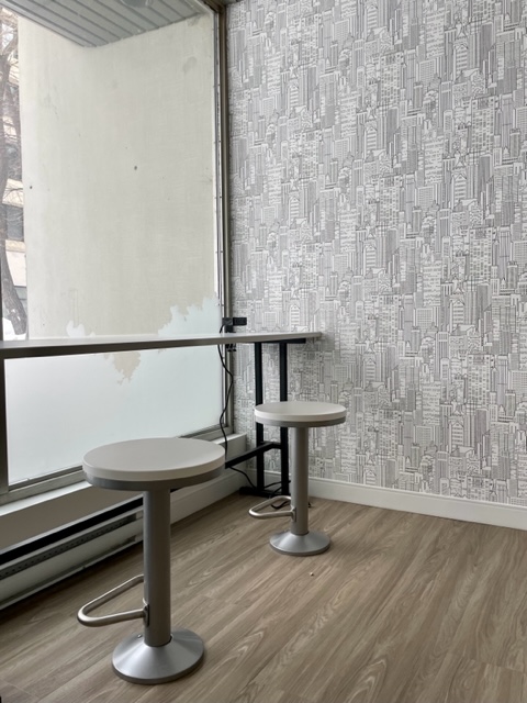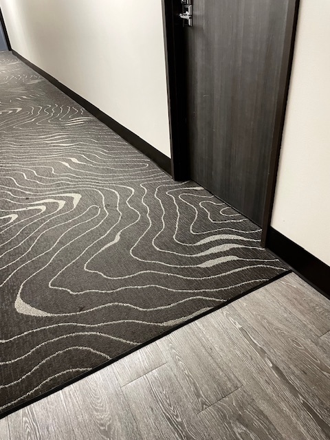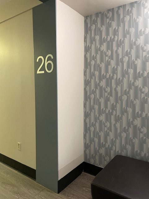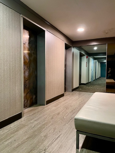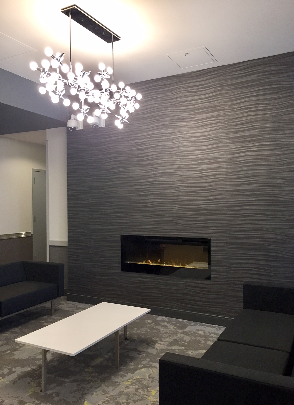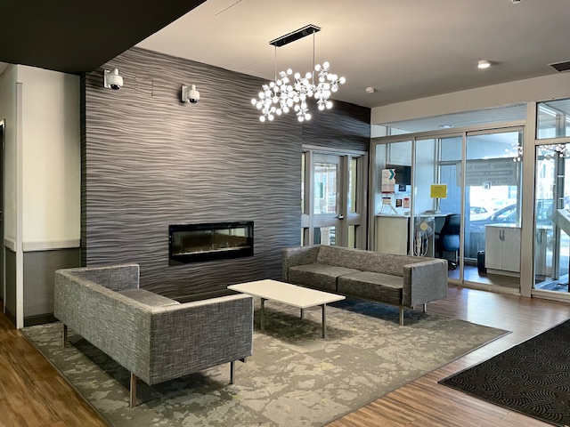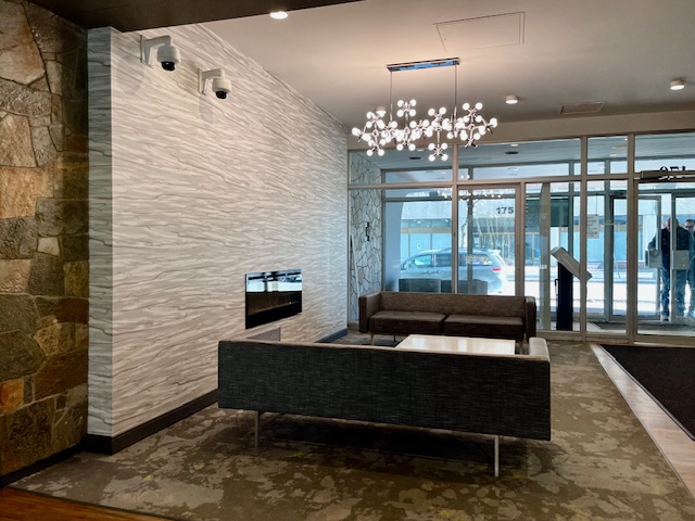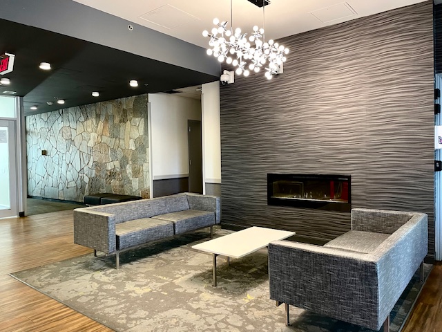 Urban Apartment Update: Downtown apartment buildings with two similar lobbies were in need of a redo. We embraced the existing fieldstone wall finishes and took inspiration from the adjacent green space. The lobbies see high traffic, so easy maintenance and durability was a priority. Slip and frost resistant porcelain tiles were installed in the entry; commercial-grade, woodgrain-look luxury vinyl plank in traffic areas; and high-ounce-weight, commercial carpet tile in the seating areas. Patterned vinyl wallcovering adds both dimension and durability to wall surfaces; thick rubber wall base and wall guards add extra protection. Sofas and benches are contract-grade and are upholstered in durable, easy clean vinyl; and the coffee tables have engineered quartz tops on metal bases.