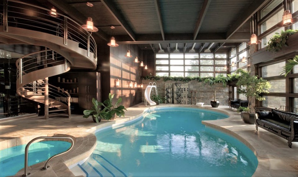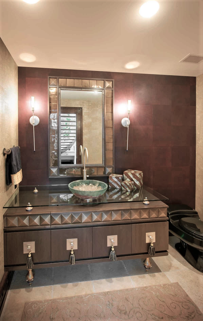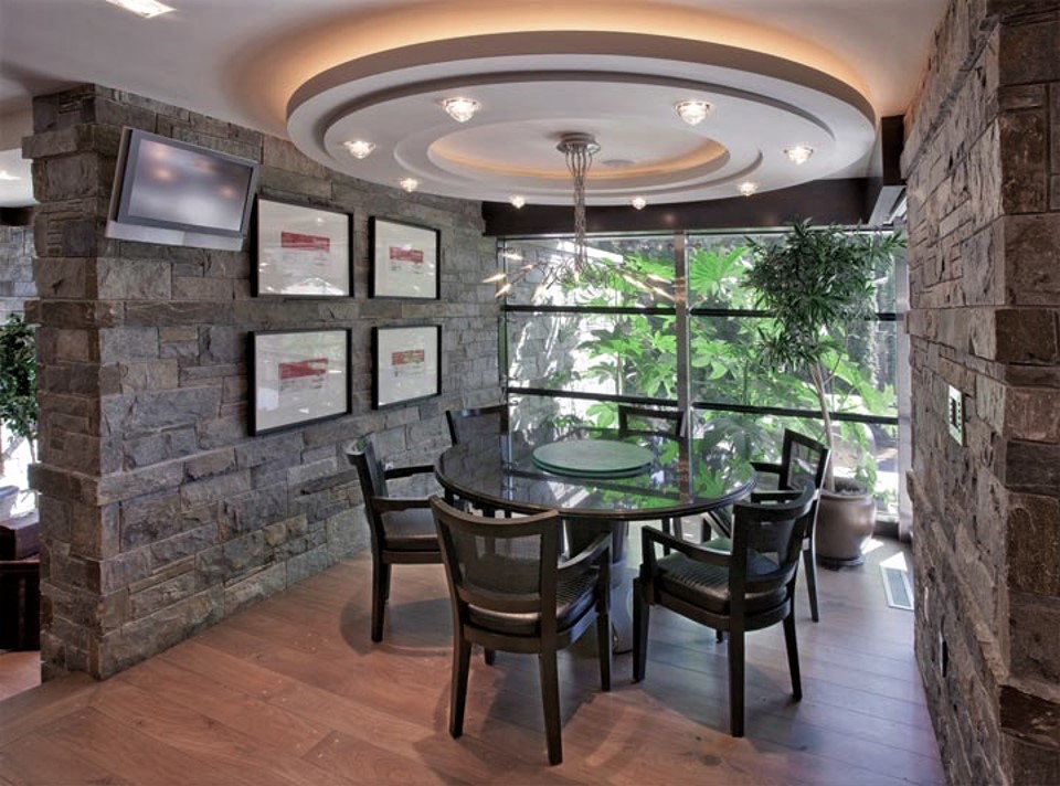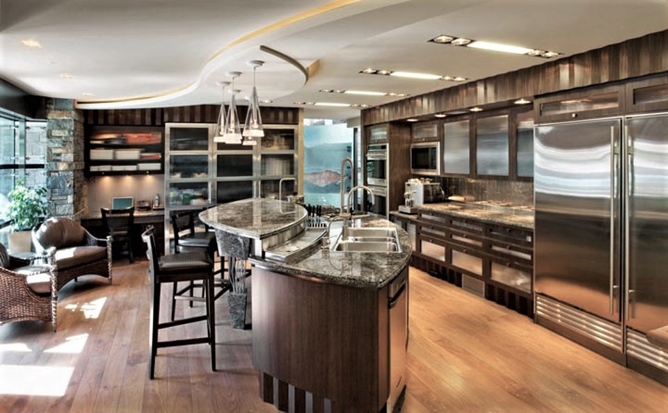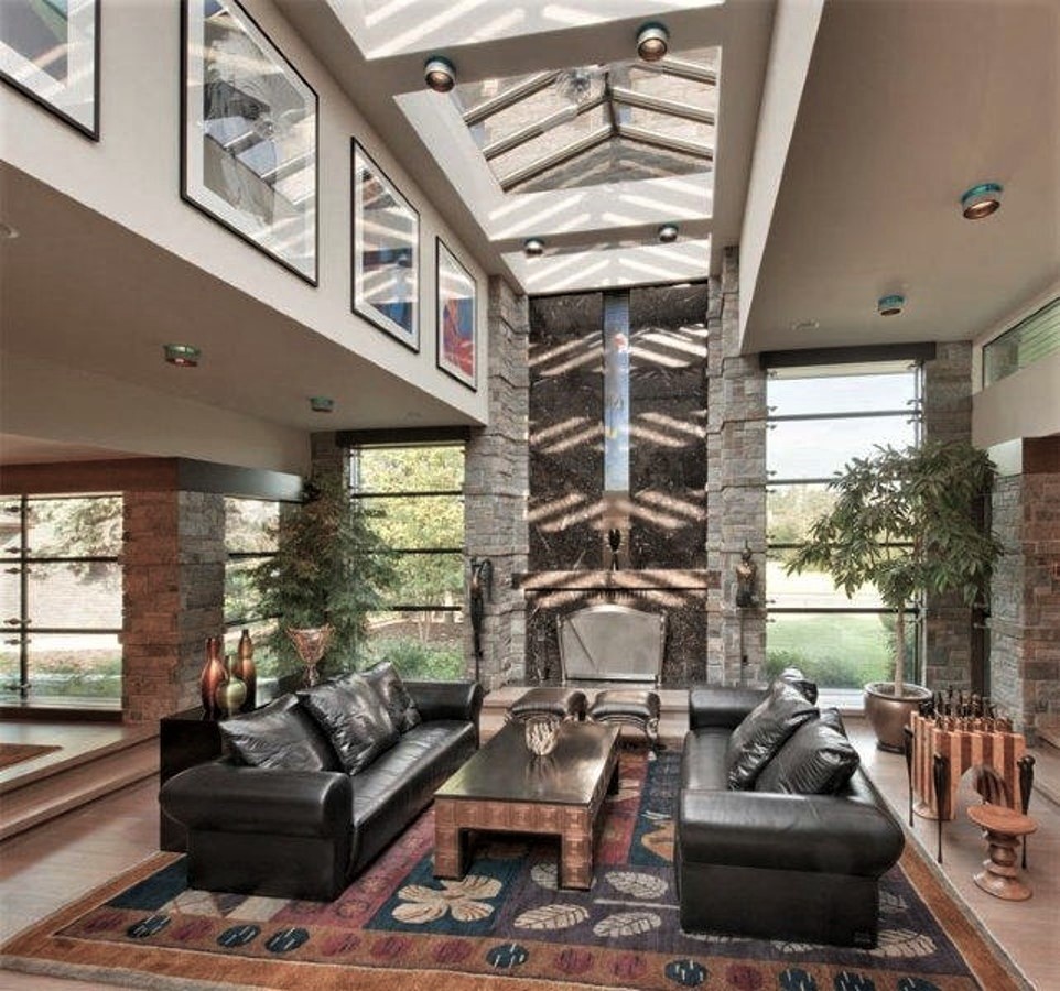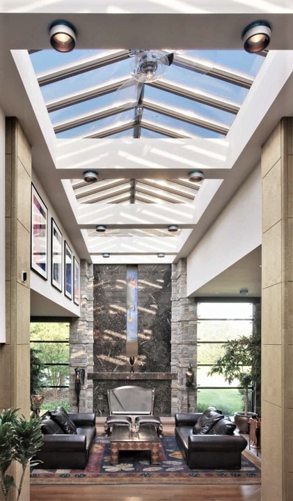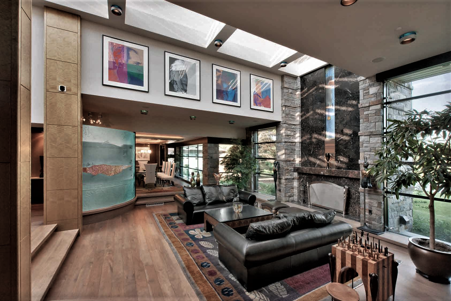 In 2003, we were offered a ‘dream project’ – re-design a home for an amazing client with an unlimited budget. Originally constructed in 1980, the house was taken down to the studs, walls were removed, and additions expanded the space where needed. Typical windows were replaced by frameless panels of glass held together with metal fasteners, imported from by Germany. A curving, walnut open-riser staircase with stainless-steel details was designed with a luxurious rise and run. Interior spaces of the 8500 square foot home were warmed by Black American Walnut wide plank floors accented with Maple dowels. The living room’s 20-foot-high ceiling was split by a 40 by 10-foot skylight. Drywall bulkheads accommodate lighting and conceal the supporting metal ties. A large entertaining space was created by opening the dining and living room areas to a lounge/ bar. The exterior stone was continued into the home resulting in a seamless outdoor/indoor connection. The wood-burning fireplace was clad in a Moroccan marble selected for its unique and beautiful color and its large round and tapered fossils.  A bespoke collection of furniture, rugs and accessories was curated from many suppliers worldwide.